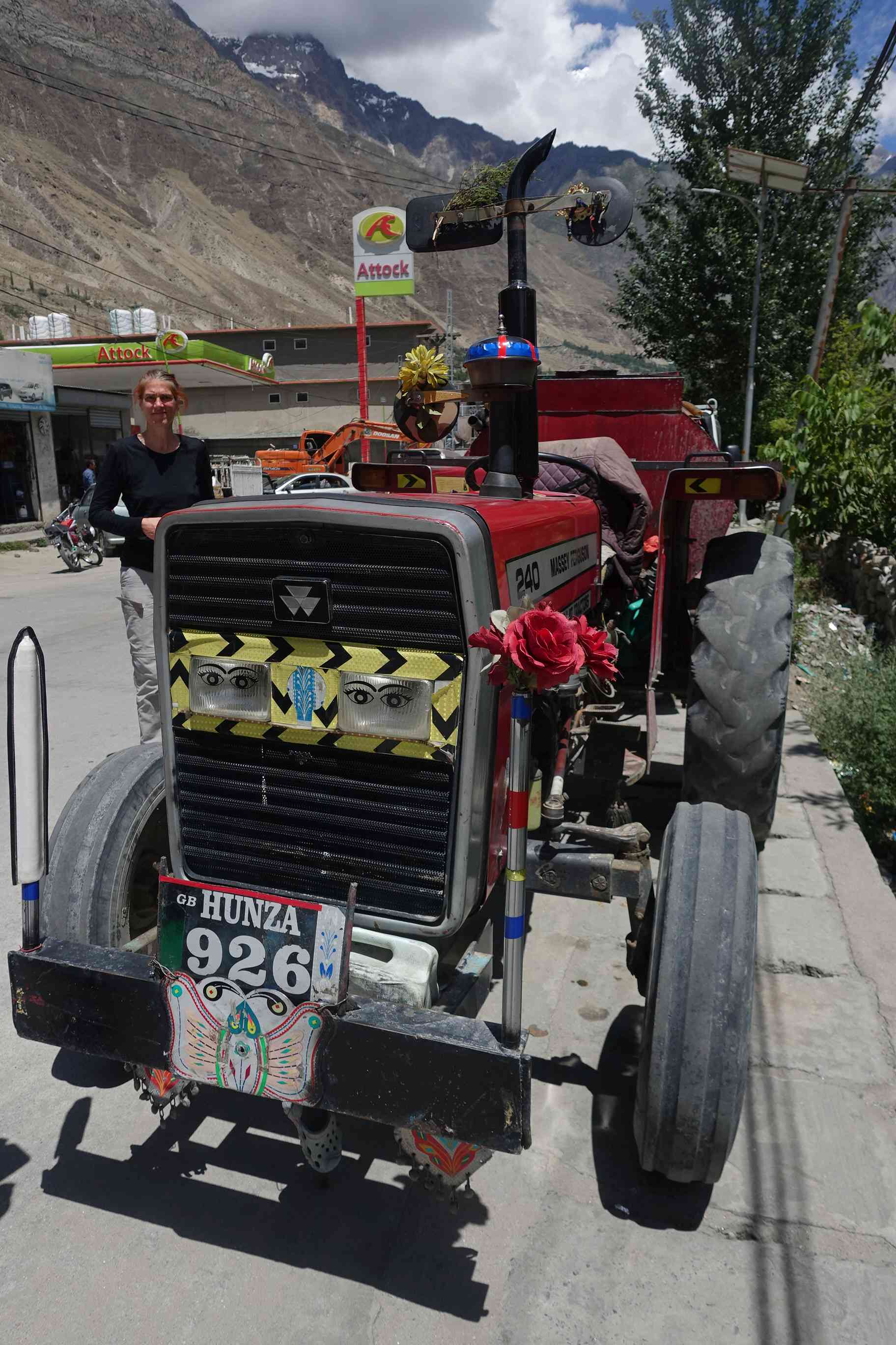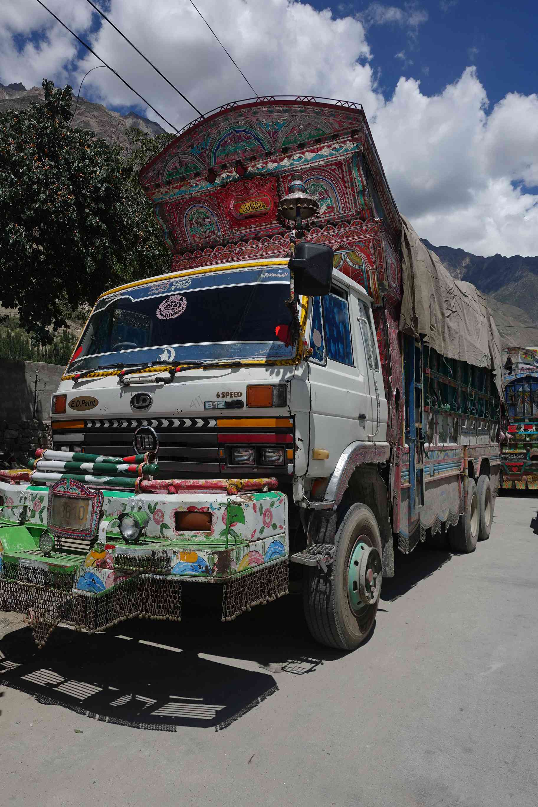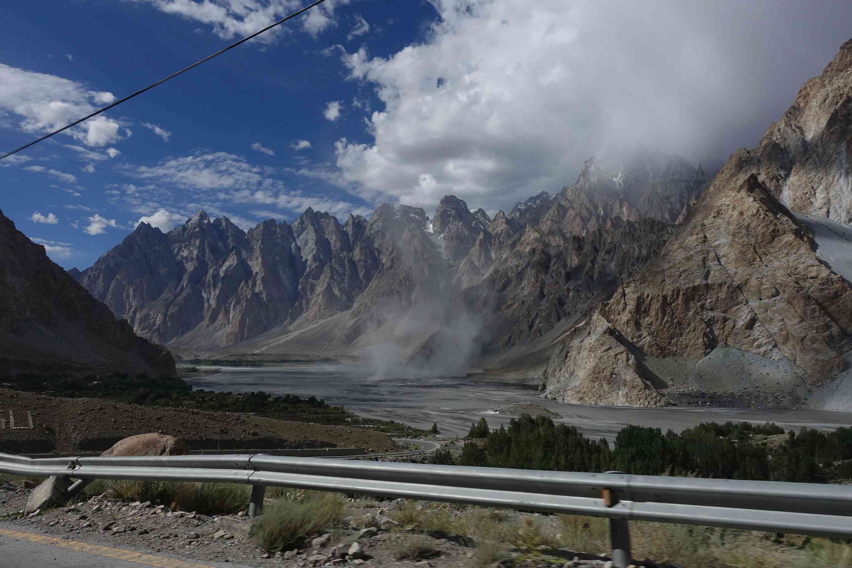 Nach dem Frühstück waren die Jeeps gepackt und los ging’s um 9.30 Uhr über die Schotterpisten wieder hinunter nach Passu. Vorher bekam auch noch Nasia als Letzter sein Trinkgeld, der hier auf uns gewartet hatte, nachdem wir Sonja, Christoph und Birgit erst in Karimabad wieder treffen sollten. Auf dem Weg steckte plötzlich ein Kleinlaster in einer Flußüberquerung fest. Wir waren zum Halten und Helfen gezwungen und nach knapp einer Stunde hatten sie ihn wieder rausgezogen. Der hatte sich da richtig tief reinmanövriert und im Anschluß lief auch der Motor nicht mehr. Wir sollten alle durchkommen und die Fahrt war abenteuerlich wie auch die Hinfahrt hier schon gewesen war.