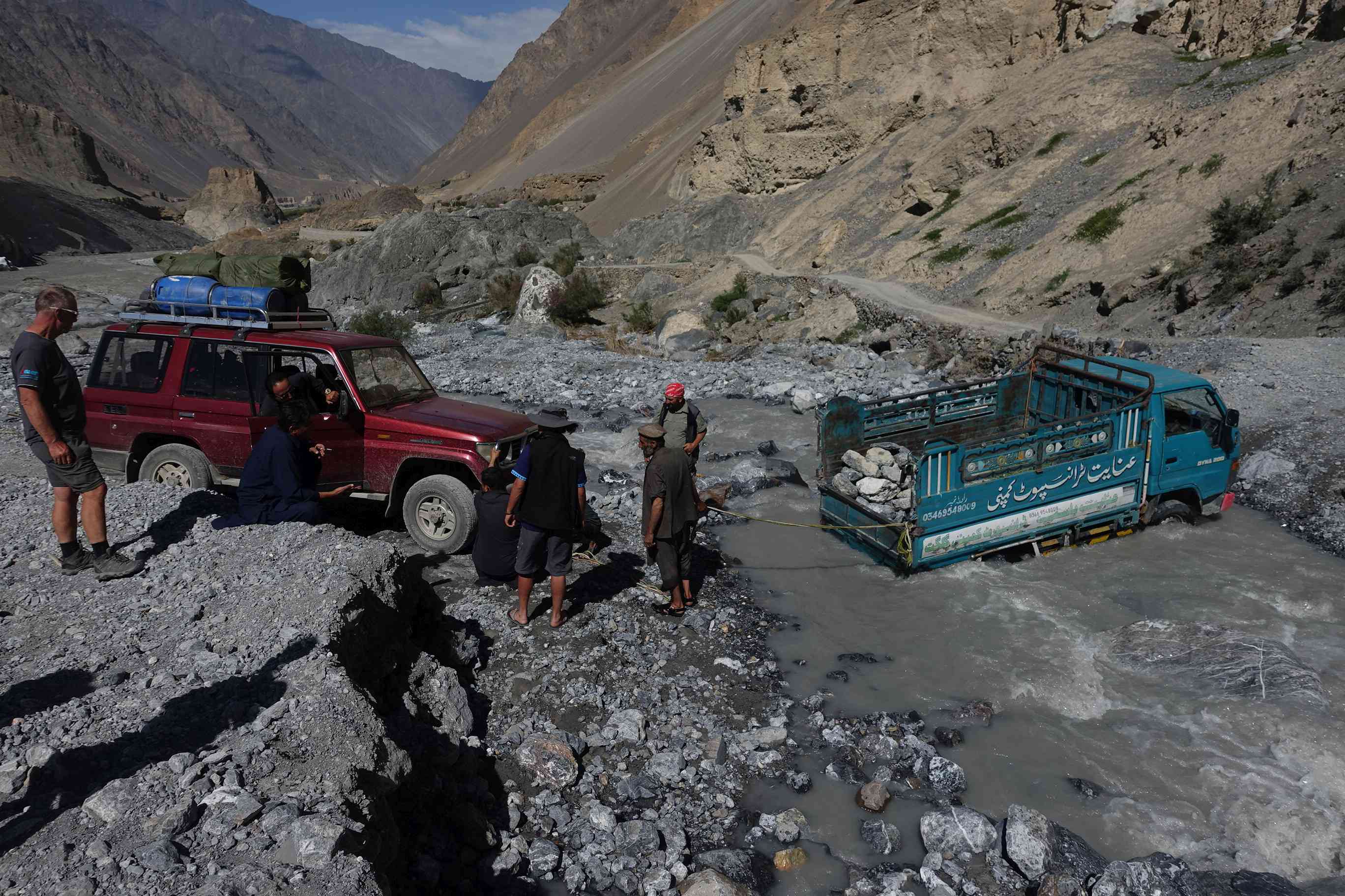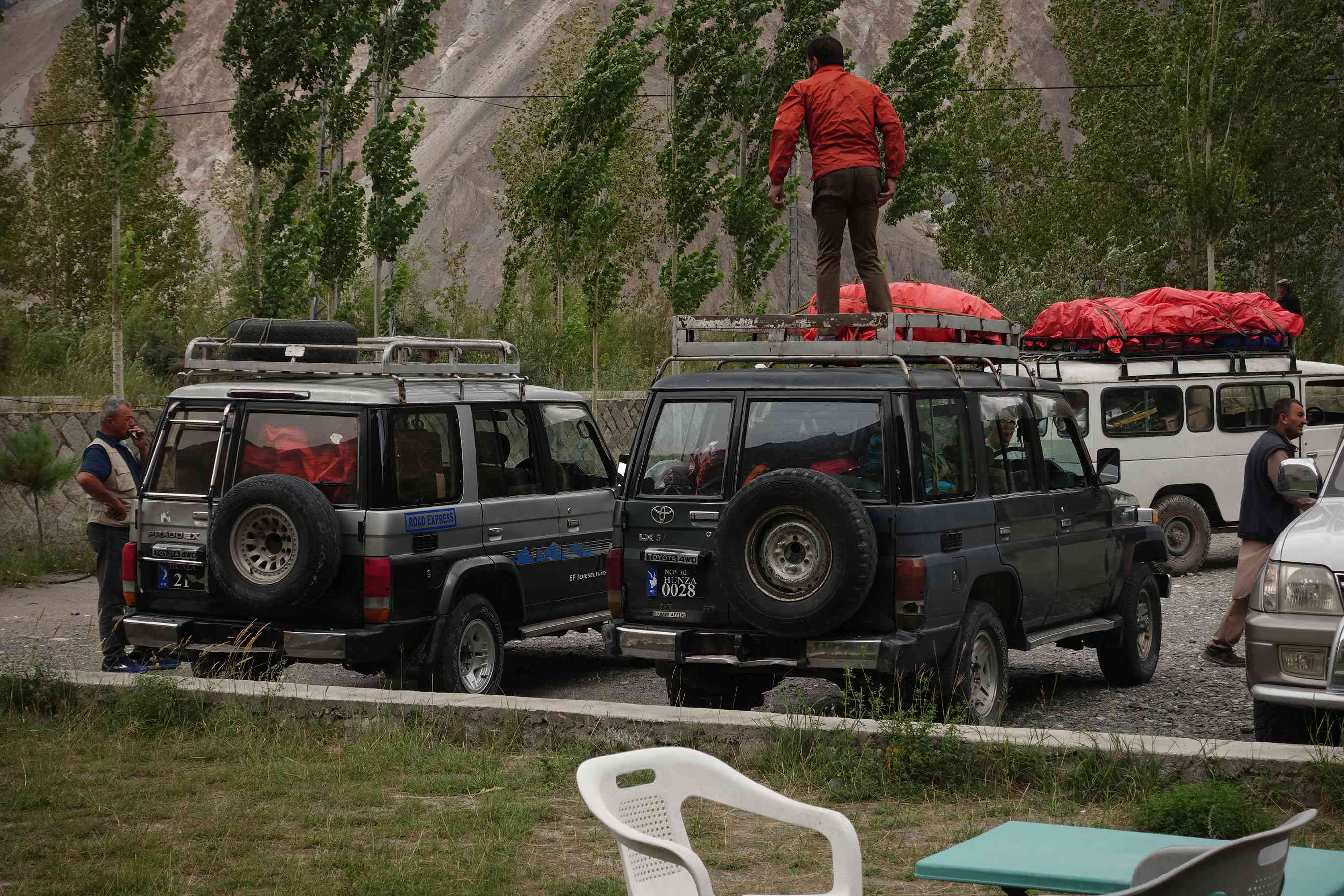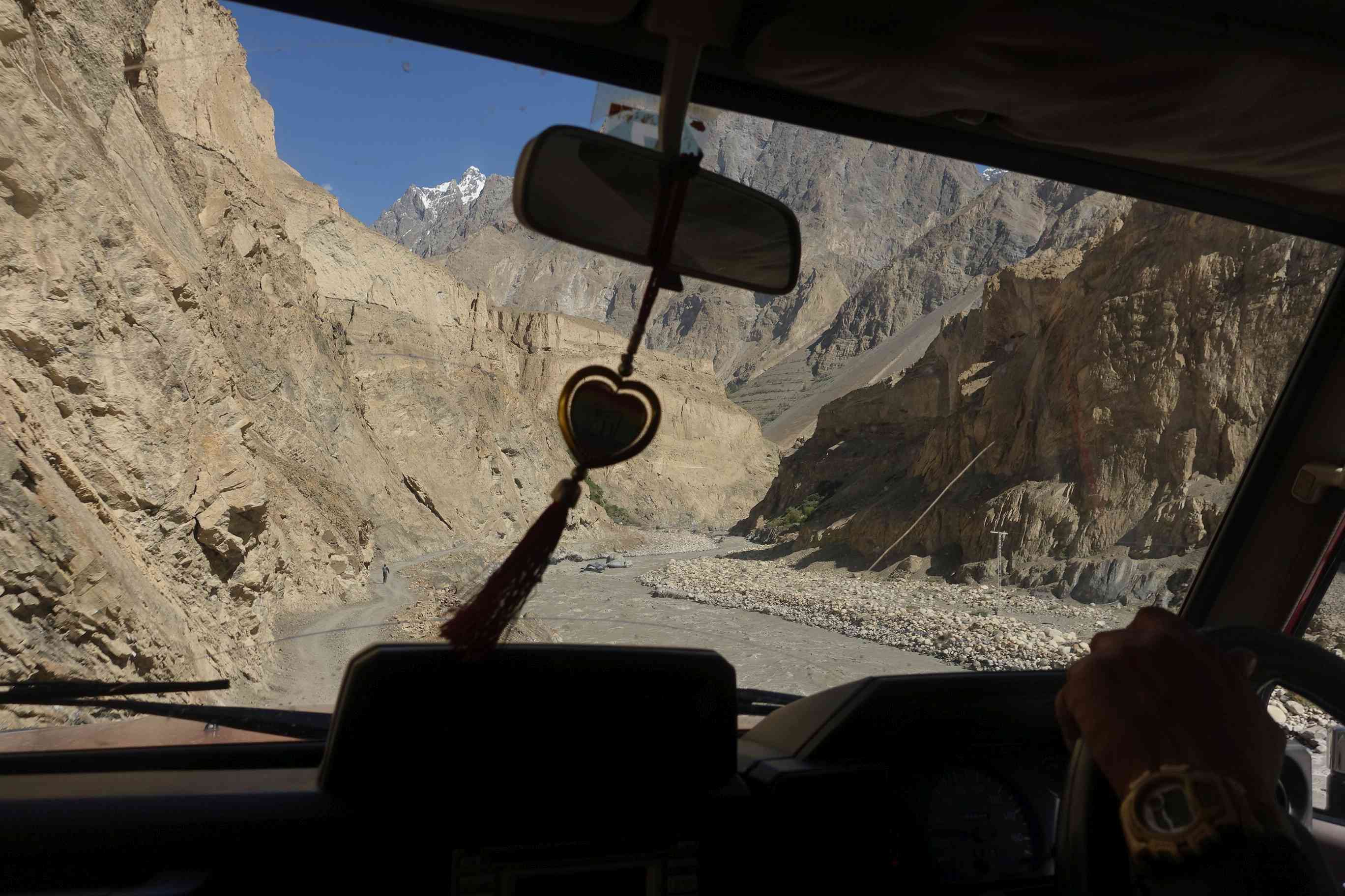 Nach dem Frühstück waren die Jeeps gepackt und los ging’s um 9.30 Uhr über die Schotterpisten wieder hinunter nach Passu. Vorher bekam auch noch Nasia als Letzter sein Trinkgeld, der hier auf uns gewartet hatte, nachdem wir Sonja, Christoph und Birgit erst in Karimabad wieder treffen sollten. Auf dem Weg steckte plötzlich ein Kleinlaster in einer Flußüberquerung fest. Wir waren zum Halten und Helfen gezwungen und nach knapp einer Stunde hatten sie ihn wieder rausgezogen. Der hatte sich da richtig tief reinmanövriert und im Anschluß lief auch der Motor nicht mehr. Wir sollten alle durchkommen und die Fahrt war abenteuerlich wie auch die Hinfahrt hier schon gewesen war.