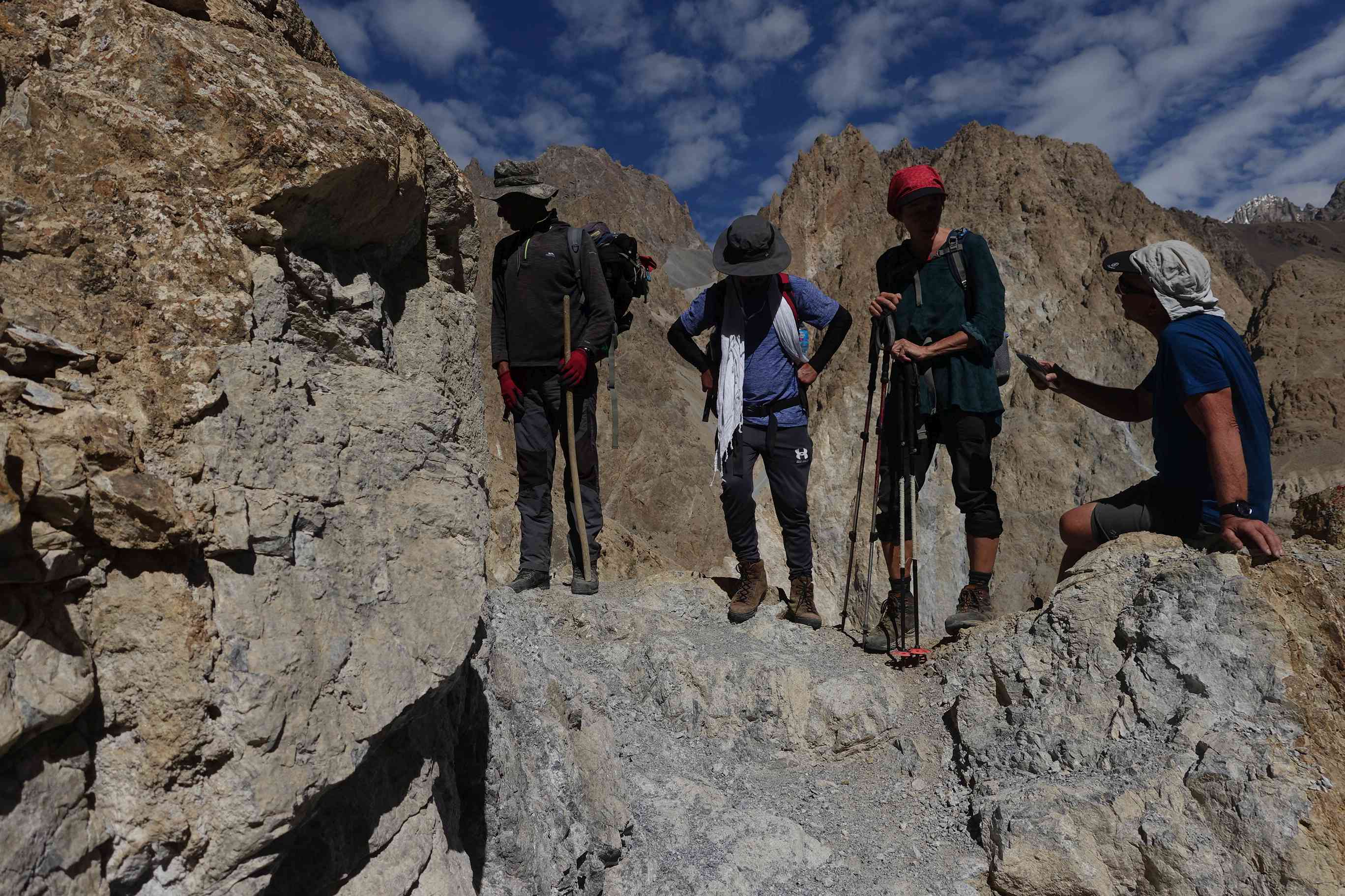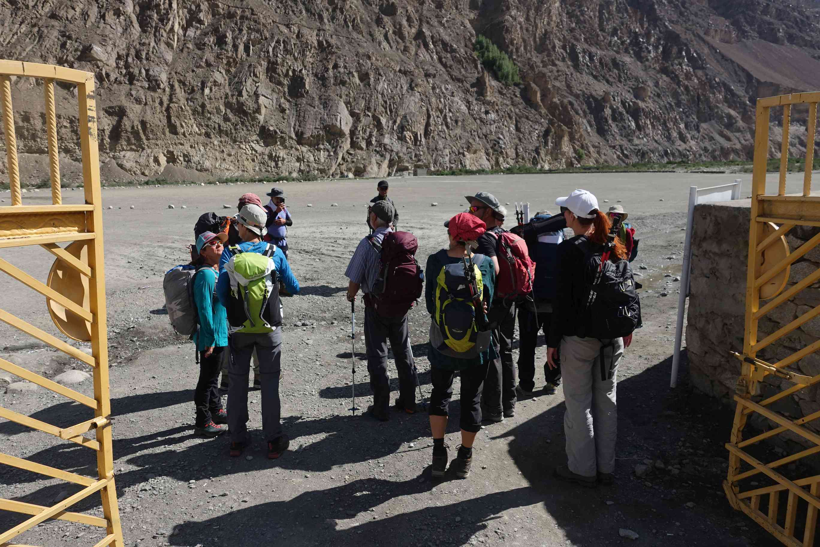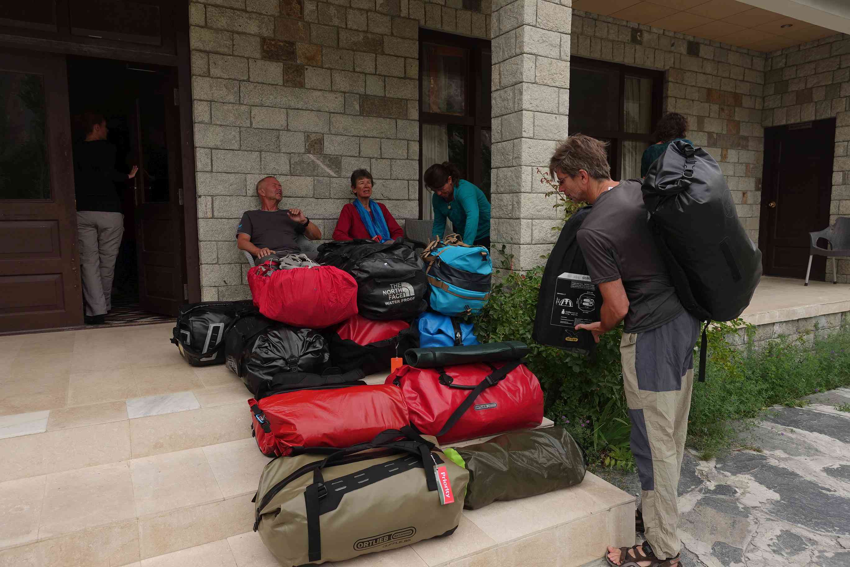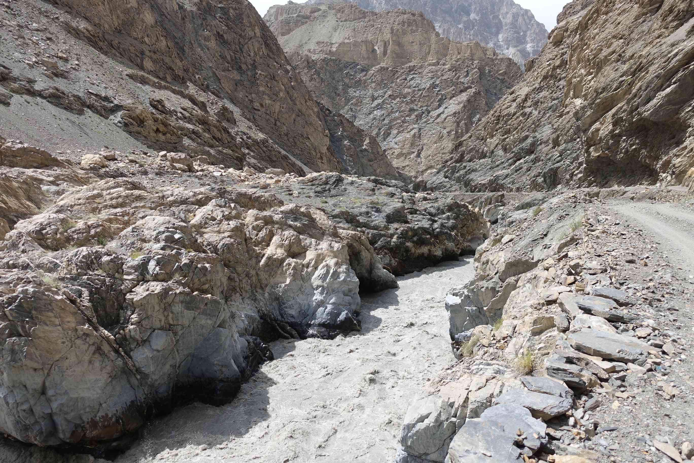 Heute ging’s zurück nach Shimshal, nochmal knapp 1000hm runter über sehr steiles Gelände. Nach dem Frühstück überreichten wir noch das Trinkgeld für die Eseltreiber. Zurück in Shimshal an der bekannten Unterkunft gab’s noch ein Gruppenfoto, bevor sich unser Team verabschiedete. Wir duschten, was quasi nur unter der kalten Fußbrause möglich war, wuschen Klamotten, sortierten, packten und saßen dann beim Kaffee zusammen im Schatten, lasen aus dem Reiseführer vor und spielten ein Kartenspiel. Vor dem Abendessen ein kleiner Spaziergang und recht früh schlafen, bzw. noch lesen im Zimmer.