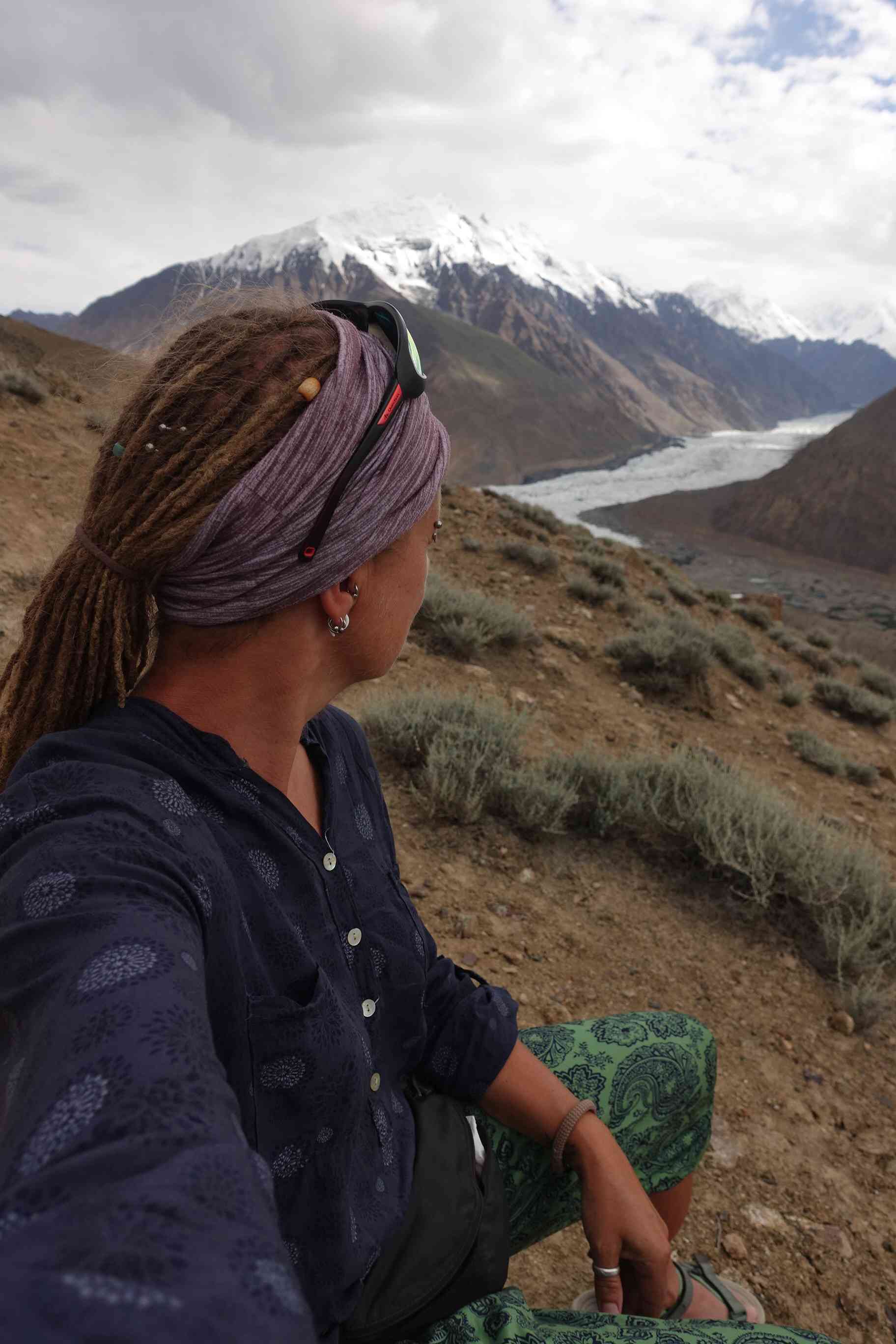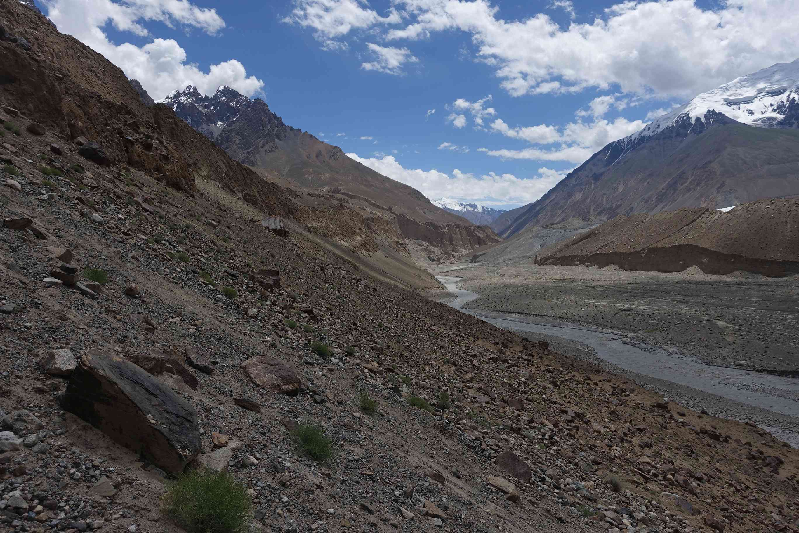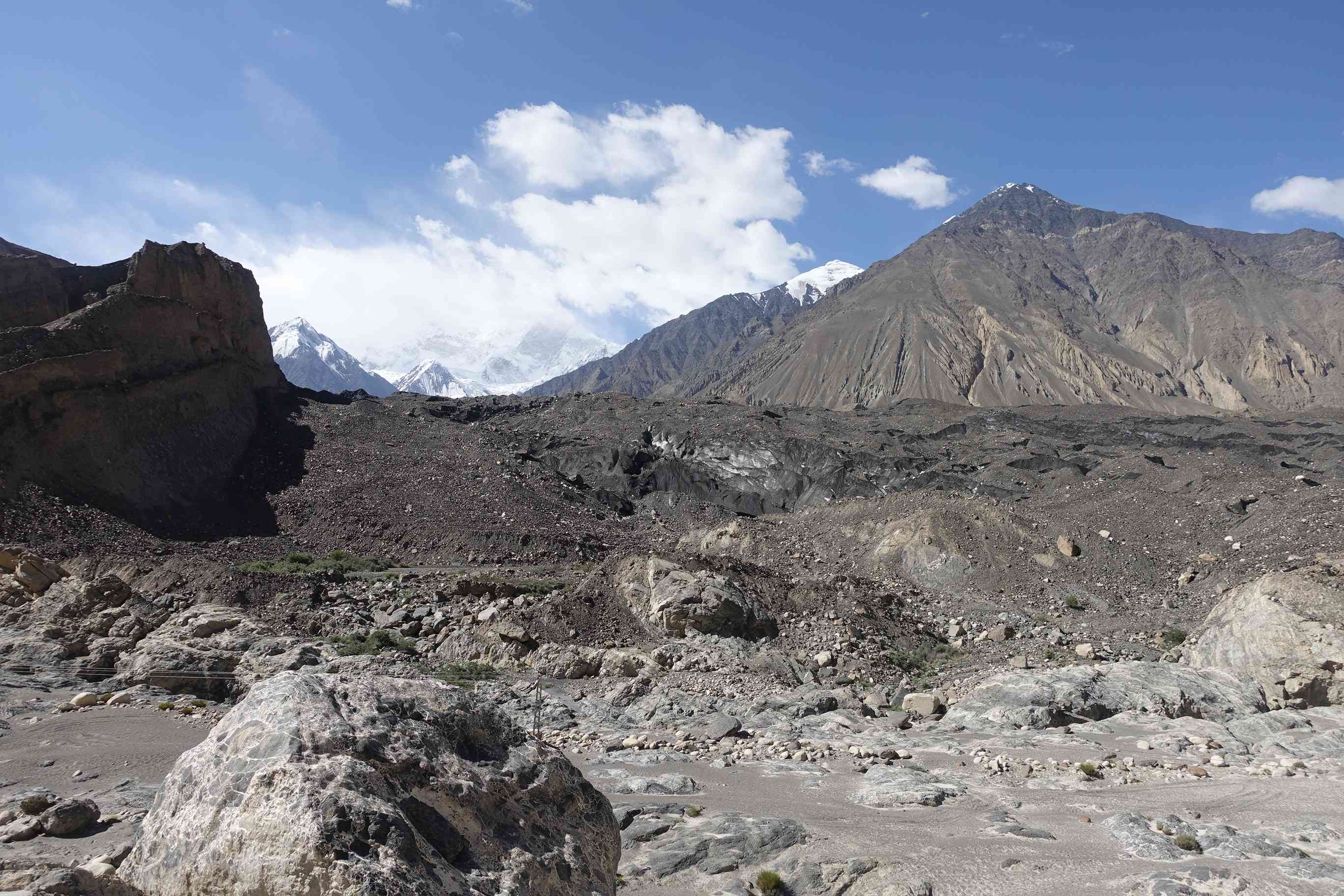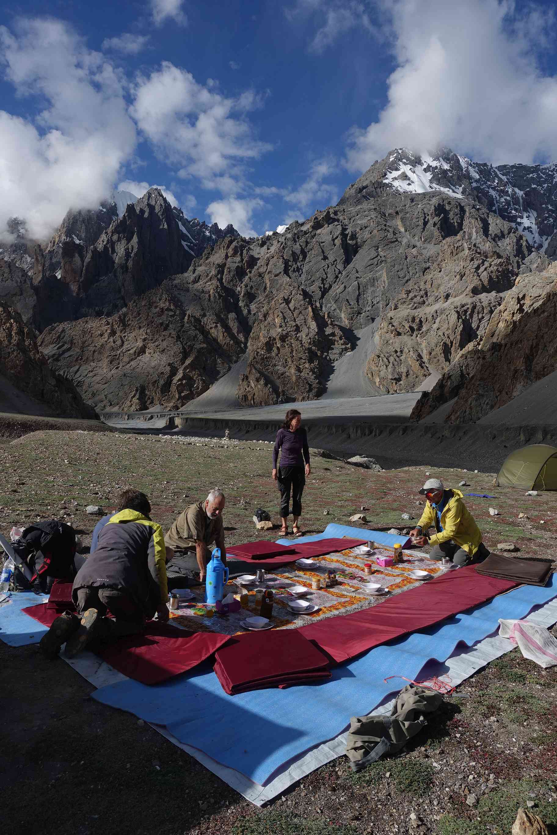 8 Uhr Frühstück, dann wurden die Esel beladen und so starteten wir. Es war heiß. Es ging weit durch die Ebene des Shimal-Rivers – 2h bis zur ersten kurzen Pause. Es gab immer wieder Nüsse und getrocknete Aprikosen und Weintrauben zwischendurch. Nun kämpfte seit gestern auch Ernst, unser schweizer Bergführer, mit dem Magen. Wir waren sehr langsam unterwegs und kamen nach knapp 9km und gut 600hm am ersten Camp an. Die Crew servierte uns Mangosaft, wir bauten die Zelte auf, richteten uns ein, bekamen Suppe und wuschen Wäsche. Wir stiegen noch einen kleinen Hügel hinauf, Gletscherblick, und ich saß oben und schrieb, indem es am Himmel etwas zuzog. Später saßen wir noch draußen auf einem Stein, Sonja spielte Ukulele und wir sangen dazu – ein 7000er in der Ferne trat plötzlich aus den Wolken hervor und so beobachteten wir den Sonnenuntergang.
