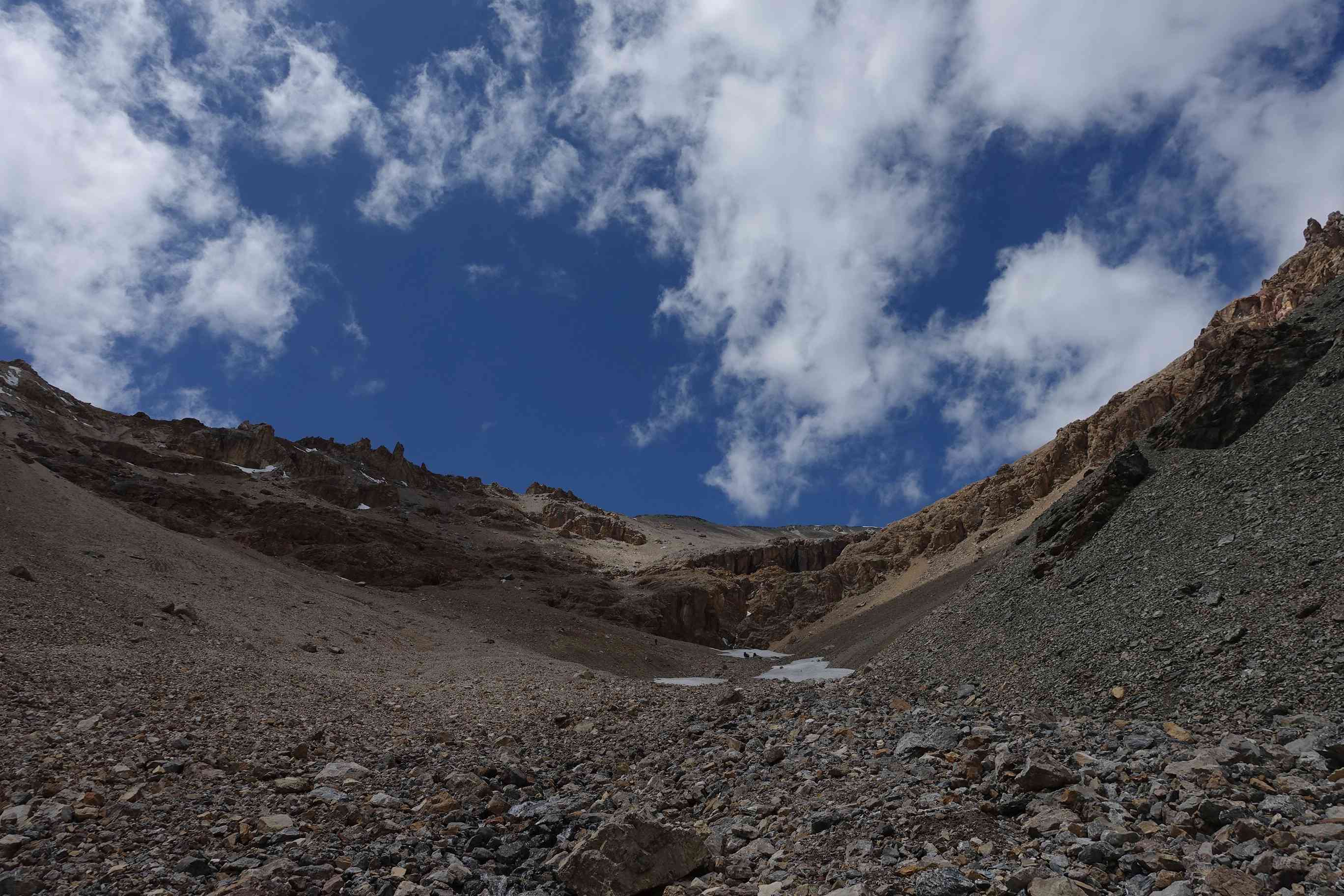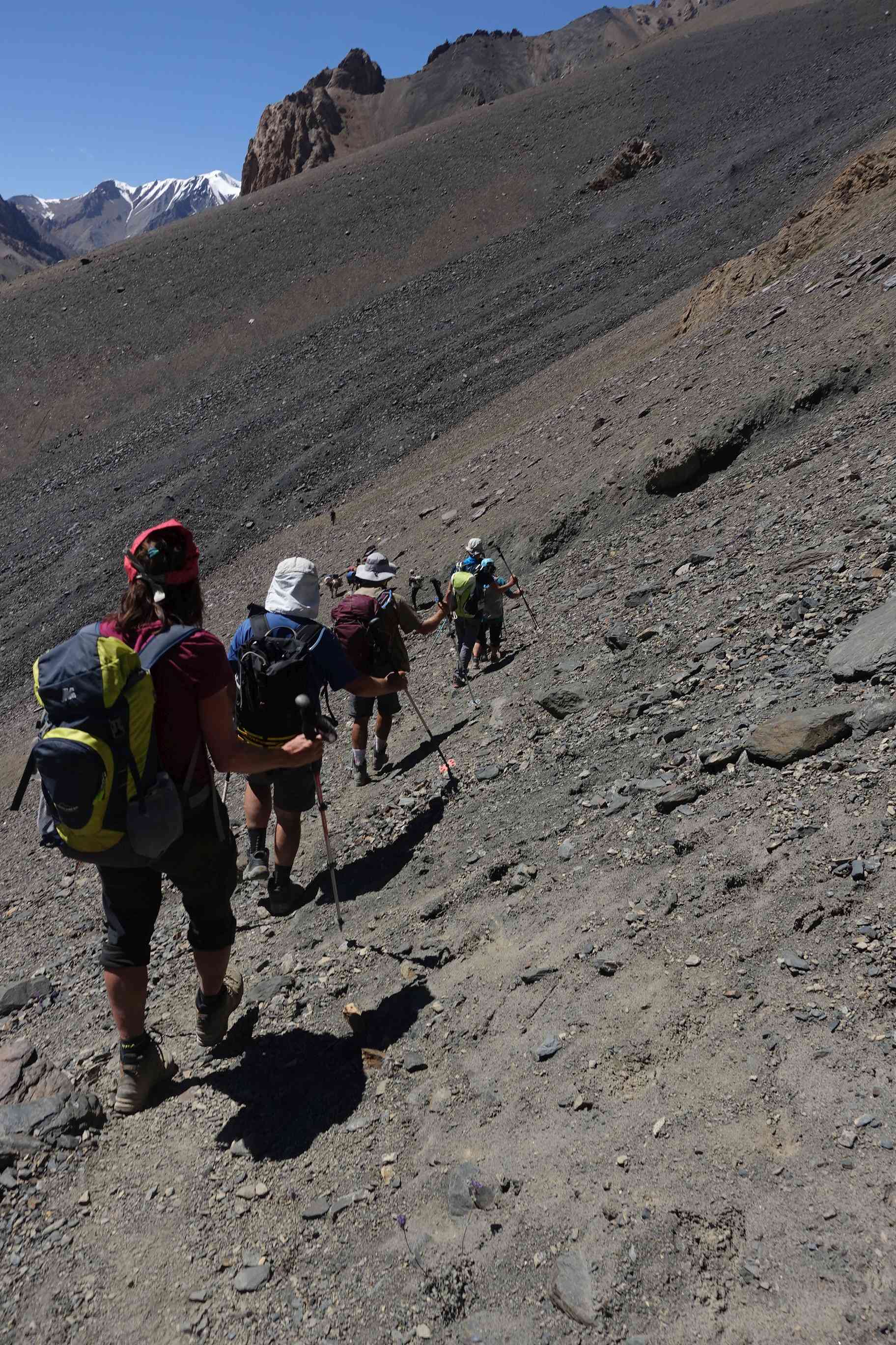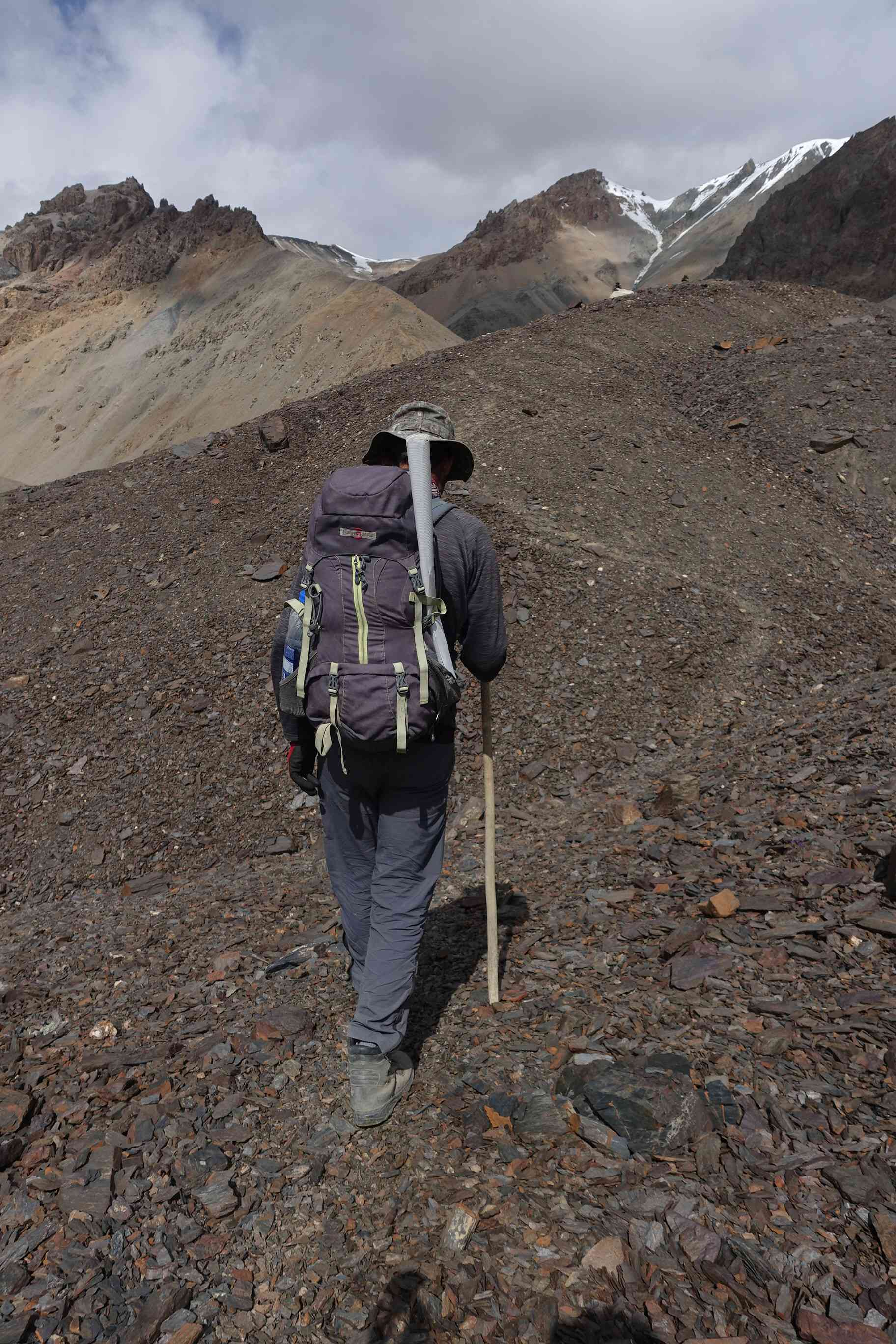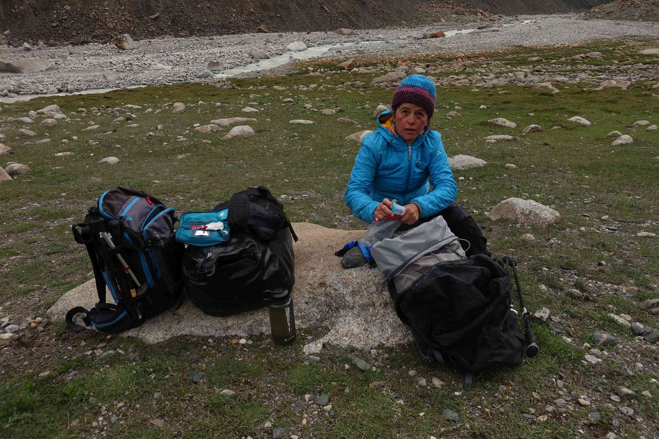 Früh hörte der Regen wieder auf, so daß wir unsere getrockneten Zelte abbauen konnten. Es standen 800m hoch und knapp 400 runter bevor, sowie knapp 18km, also wieder eine recht lange Tour bis zum Camp auf 4400m. Zum Frühstück gibt es immer Fladenbrot mit Marmelade und Honig, auch Ei. Mir fehlte hier etwas Deftiges. Mittags dann meist nur Suppe mit Brot und ein paar Fischdosen. Das richtige Essen gab’s dann abends, wo ich nichts groß essen kann. Somit wollte ich mir ab diesem Abend immer etwas für den jeweils nächsten Tag einpacken – das würde dann besser klappen. Heute hätte ich ohne Ende trinken können, fühlte mich wie verdurstet. Ab der Mittagspause sollte es regnen, so kamen wir dann letztlich durchnäßt im Nachtlager an. Es wurde über den Gipfeltag gesprochen, es gab eine kurze Einweisung zum Einhängen im Seil auf dem Gletscher und einige Diskussionen. Die Abfolge, wie alles gehen konnte stand noch nicht ganz fest und es gab sehr differenzierte Meinungen darüber. Die geplanten 1400hm hoch und runter bis auf über 6000m wurden in Frage gestellt, aber ein eventuelles Hochlager ebenso. Entscheidung über alles sollte am nächsten Tag gefällt werden, wenn wir dann endgültig am Ausgangspunkt waren auf 4700m. Es wurde wieder früh geschlafen, da es abends immer sehr schnell kühl wurde und somit nichts von Gemütlichkeit mehr aufkam.