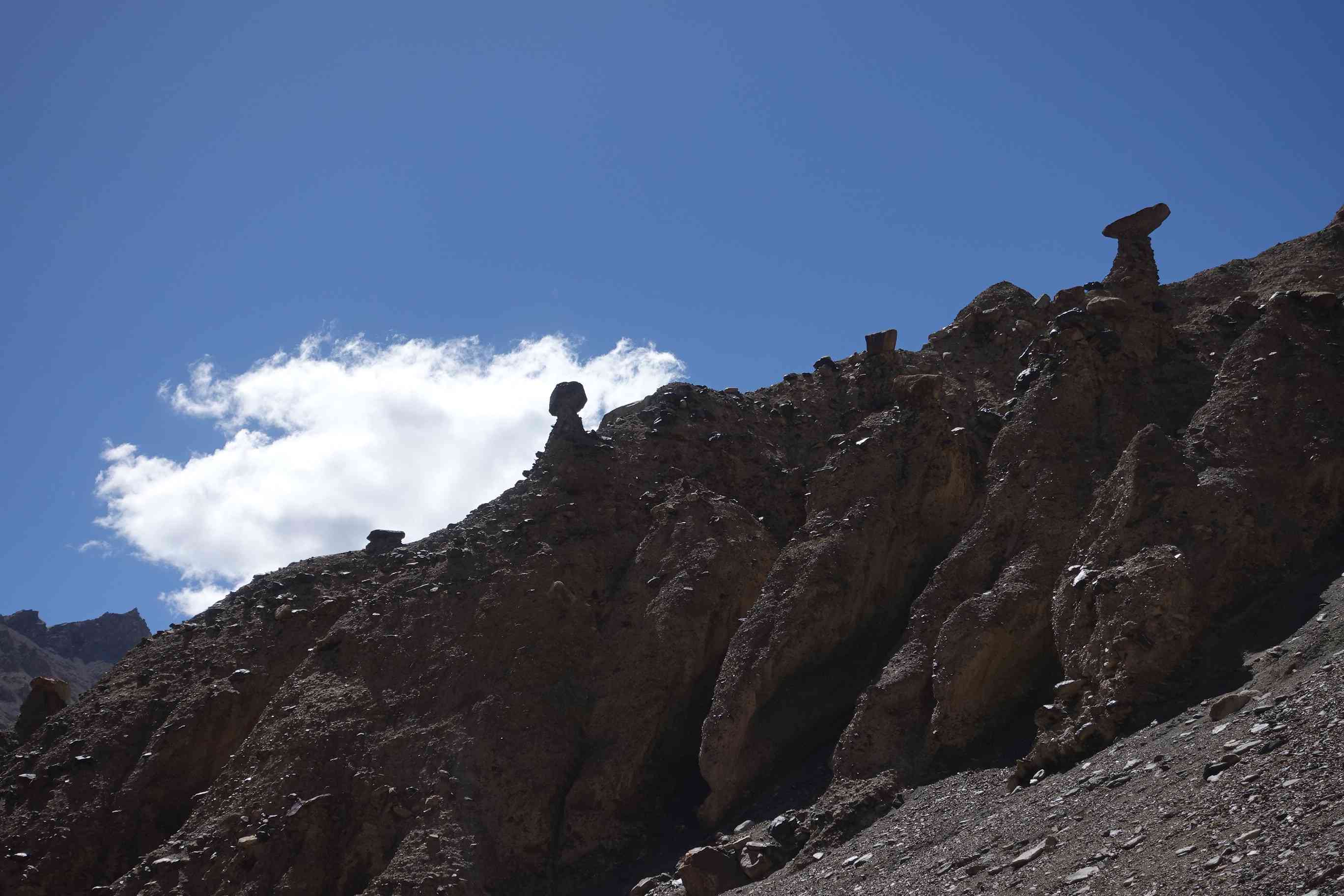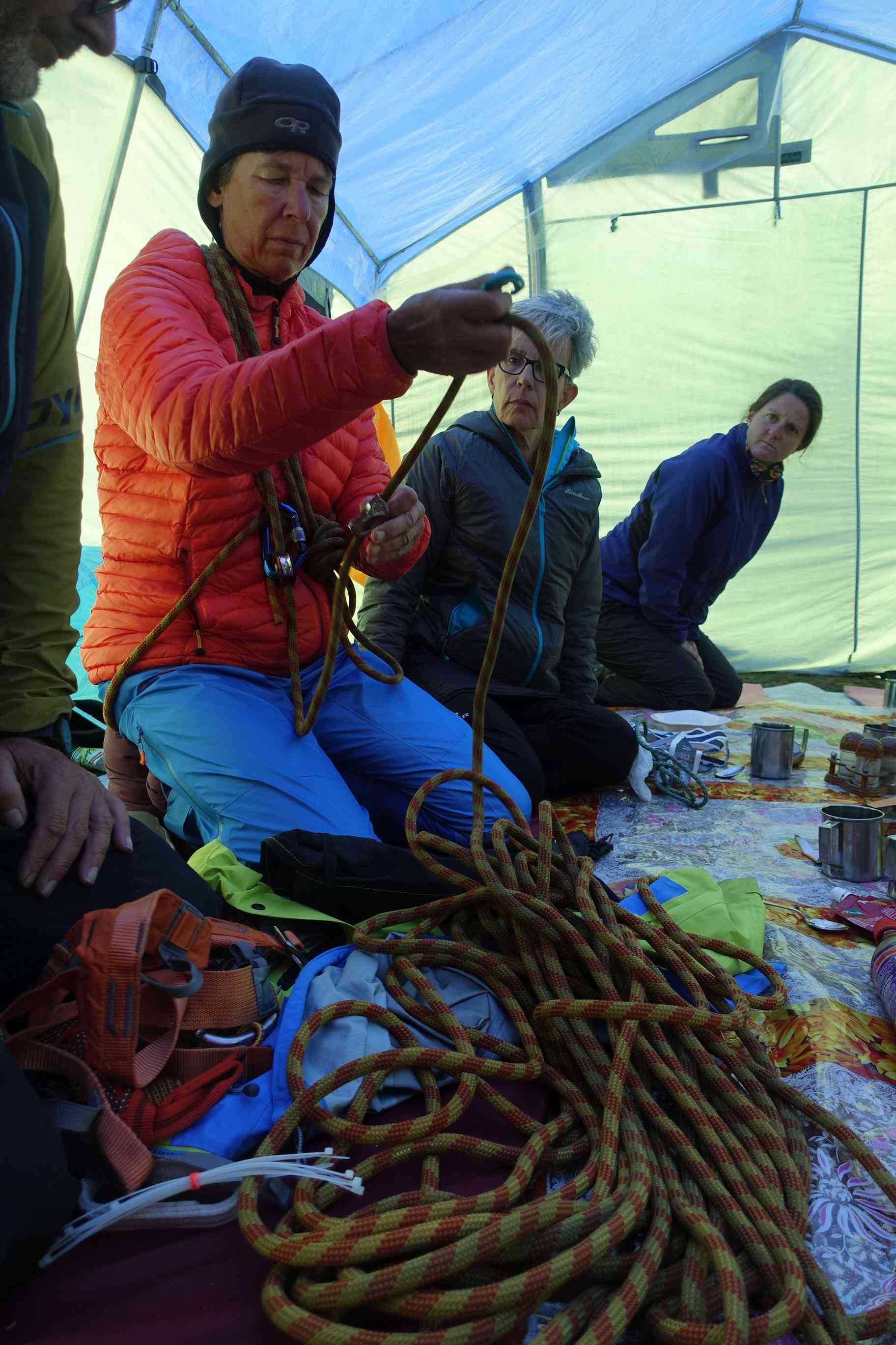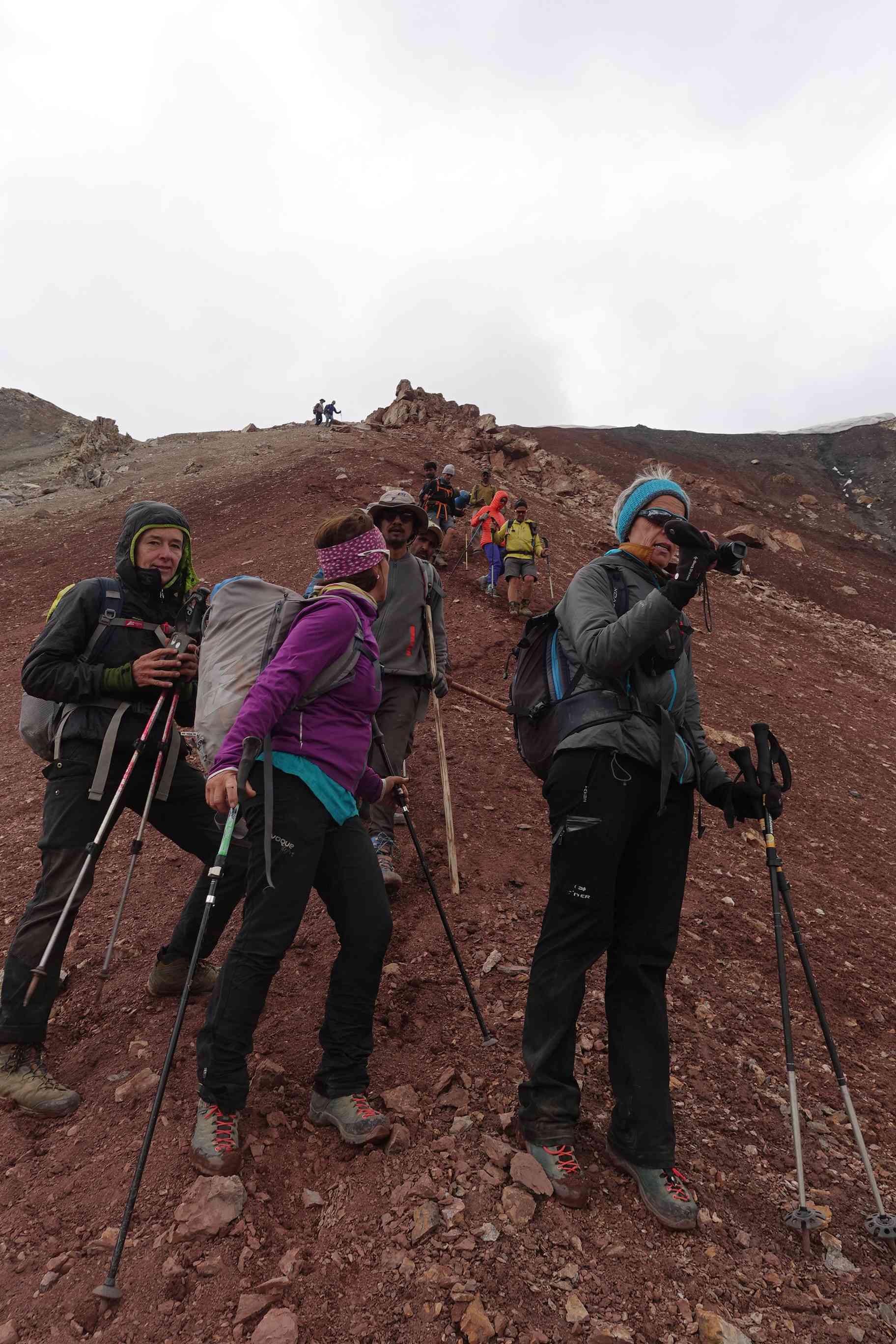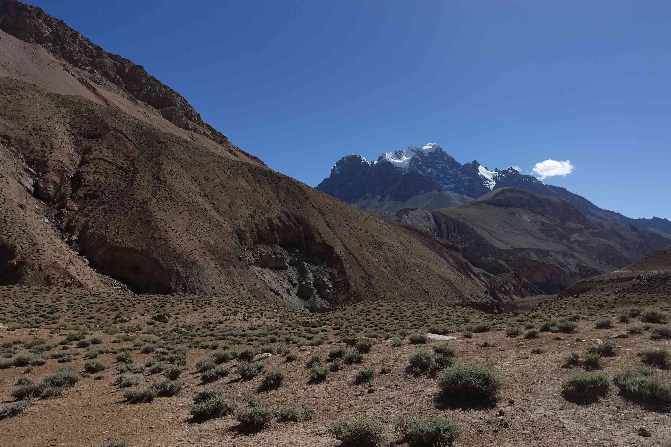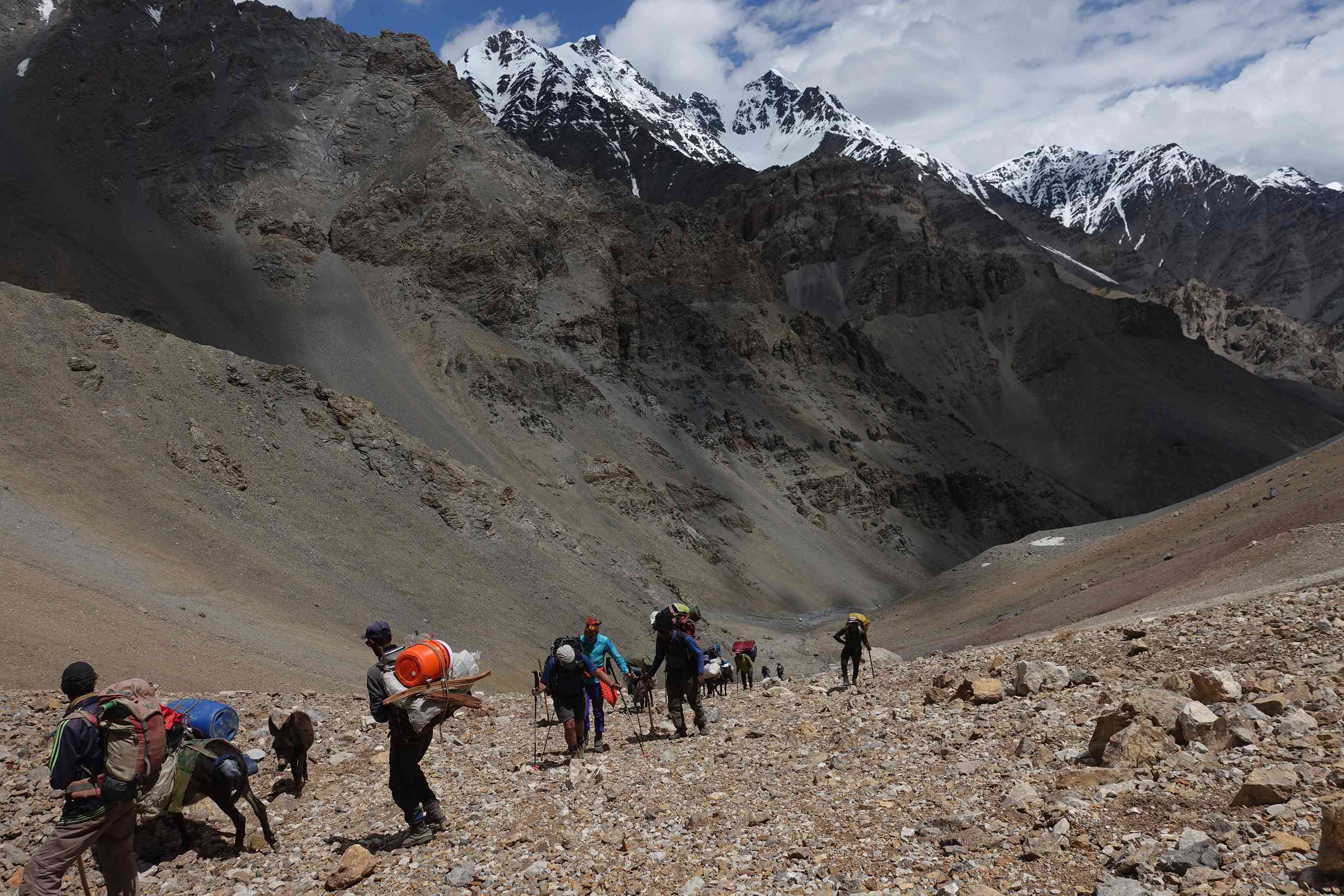 Früh hörte der Regen wieder auf, so daß wir unsere getrockneten Zelte abbauen konnten. Es standen 800m hoch und knapp 400 runter bevor, sowie knapp 18km, also wieder eine recht lange Tour bis zum Camp auf 4400m. Zum Frühstück gibt es immer Fladenbrot mit Marmelade und Honig, auch Ei. Mir fehlte hier etwas Deftiges. Mittags dann meist nur Suppe mit Brot und ein paar Fischdosen. Das richtige Essen gab’s dann abends, wo ich nichts groß essen kann. Somit wollte ich mir ab diesem Abend immer etwas für den jeweils nächsten Tag einpacken – das würde dann besser klappen. Heute hätte ich ohne Ende trinken können, fühlte mich wie verdurstet. Ab der Mittagspause sollte es regnen, so kamen wir dann letztlich durchnäßt im Nachtlager an. Es wurde über den Gipfeltag gesprochen, es gab eine kurze Einweisung zum Einhängen im Seil auf dem Gletscher und einige Diskussionen. Die Abfolge, wie alles gehen konnte stand noch nicht ganz fest und es gab sehr differenzierte Meinungen darüber. Die geplanten 1400hm hoch und runter bis auf über 6000m wurden in Frage gestellt, aber ein eventuelles Hochlager ebenso. Entscheidung über alles sollte am nächsten Tag gefällt werden, wenn wir dann endgültig am Ausgangspunkt waren auf 4700m. Es wurde wieder früh geschlafen, da es abends immer sehr schnell kühl wurde und somit nichts von Gemütlichkeit mehr aufkam.