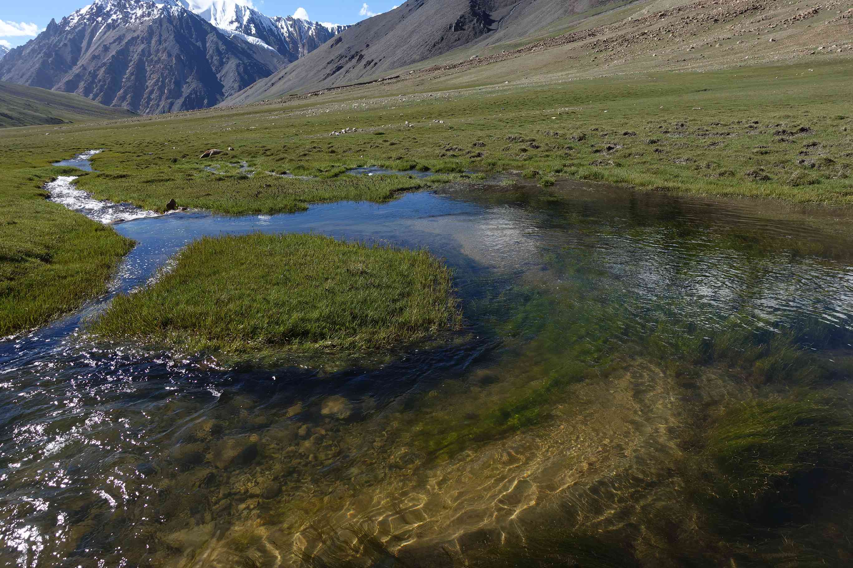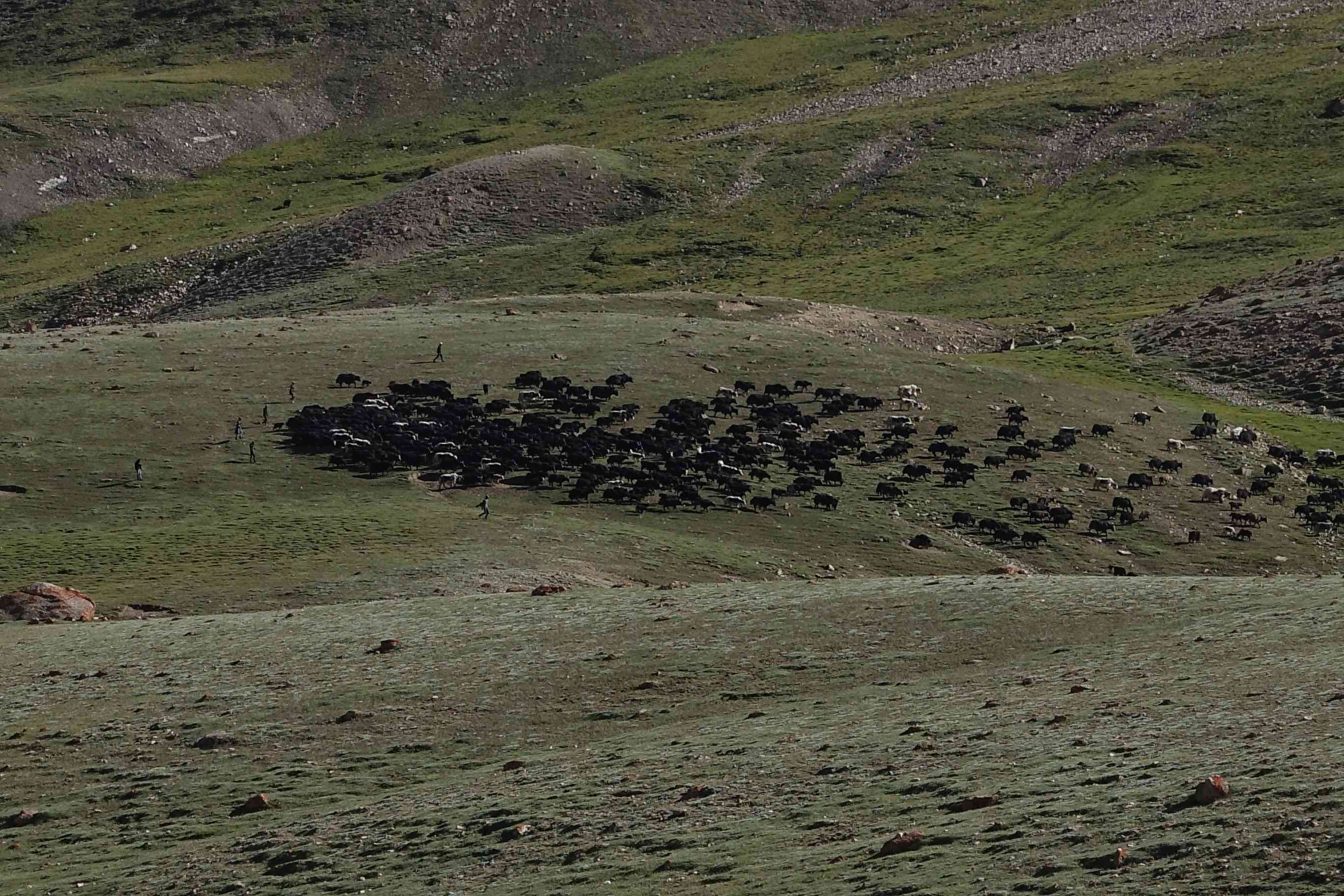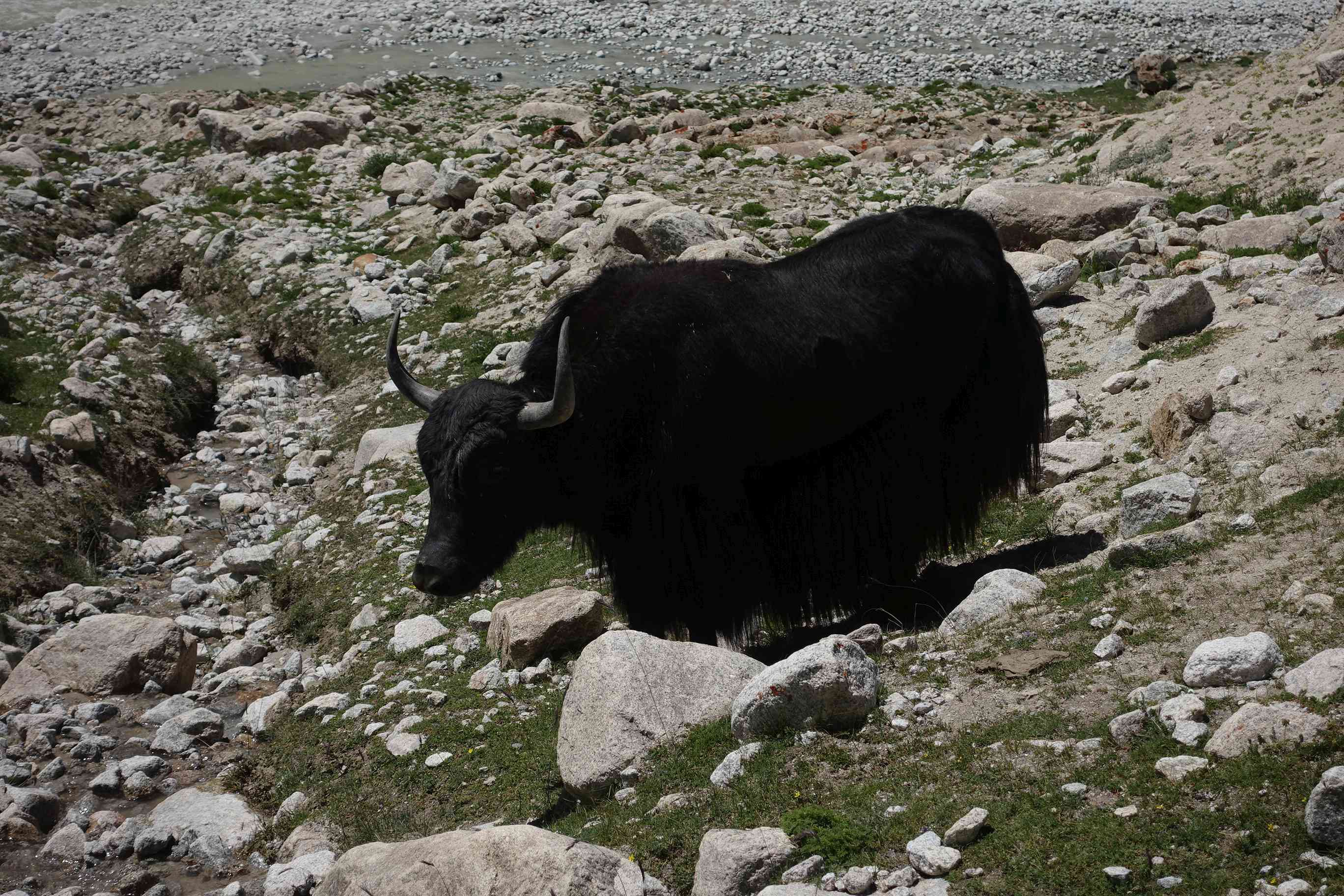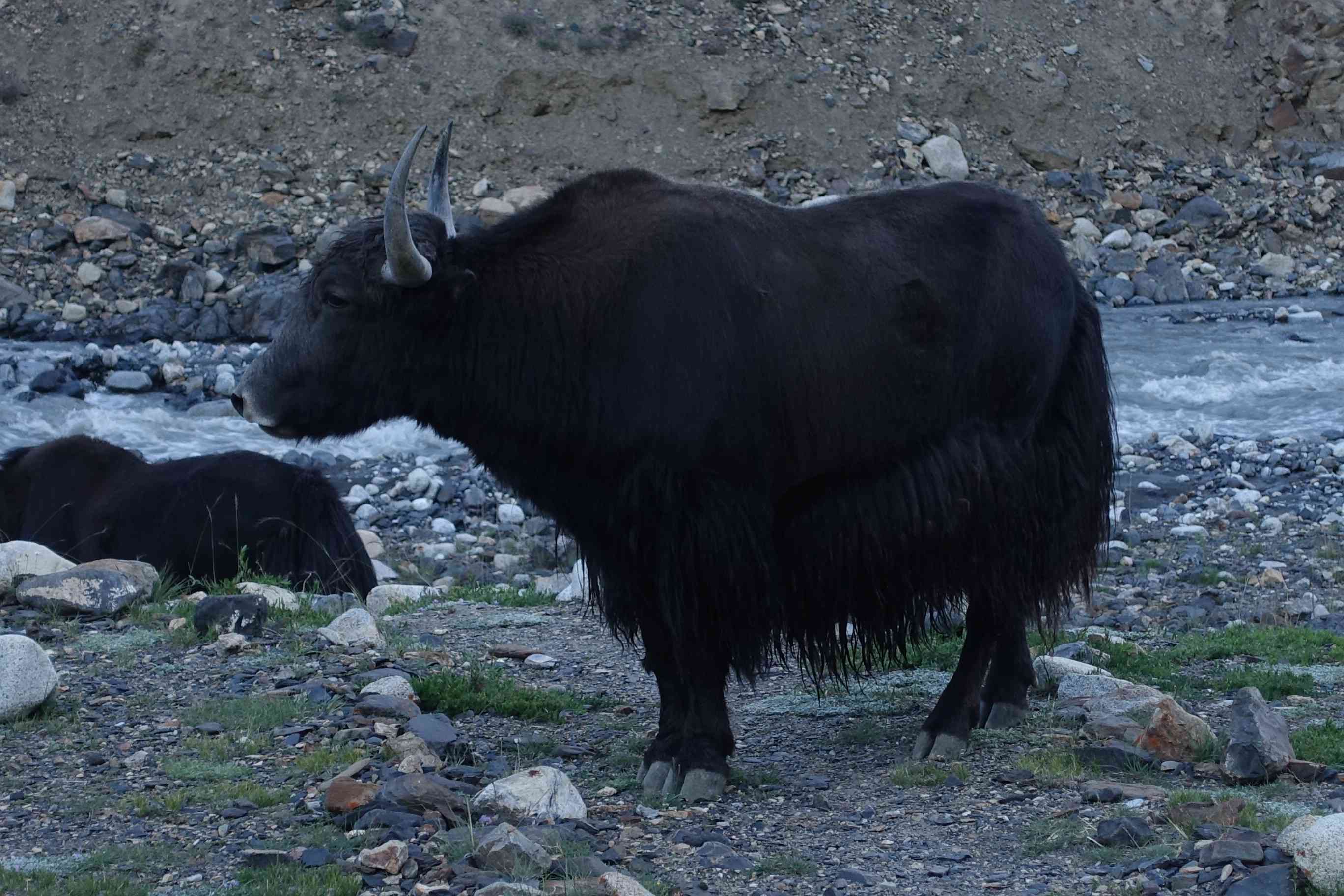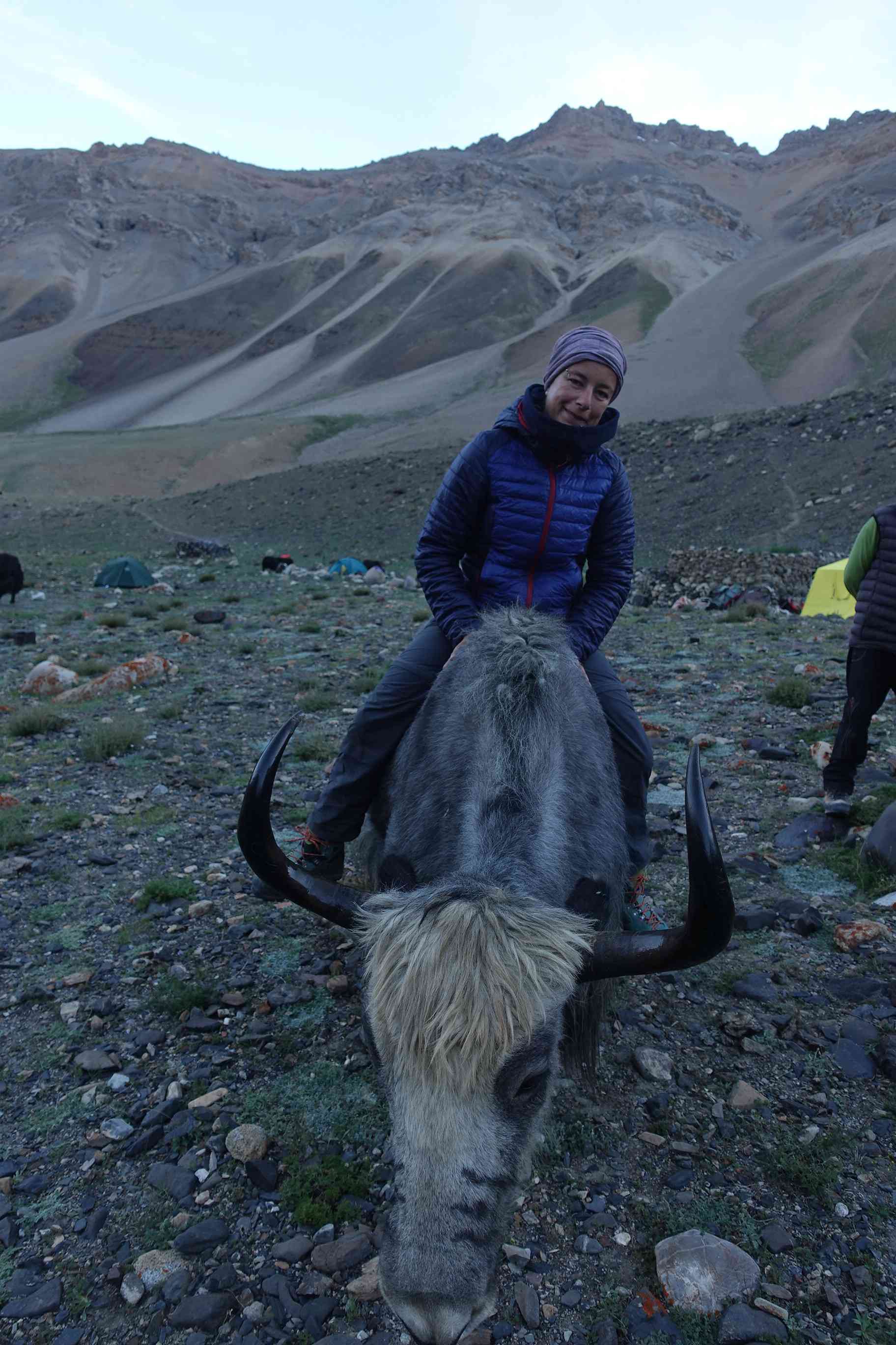Nachdem ich nachts mehrfach auf’s Klo mußte, weil ich so viel getrunken hatte, ging es mir morgens soweit wieder gut. Nur der Hals war noch dick und tat weh. Christoph ging es besser und nachdem ein Hubschrauber wohl 23000 Dollar gekostet hätte, entschieden wir, daß er mit Sonja, Nasia und zwei der Eseltreiber sowie einem Koch absteigen sollte. Wie die anderen weitermachen würden, wurde in den Raum gestellt. Es gab noch die angedachte Möglichkeit über den Shpodeen Paß zu gehen, aber auch hier gab es wieder Diskussionen aufgrund der Machbarkeit und verschiedene Meinungen. Ergebnis war letztlich, daß der Paß angegangen werden sollte. Nun mußte jeder entscheiden. Ich war unsicher aufgrund meinem Zustand vom Tag vorher, entschied mich jedoch dafür. Nur Birgit sprang noch ab und wollte mit Christoph und Sonja auf dem direkten Weg ins Tal zurück gehen. Didar, der zweite Bergführer, sollte mit uns gehen und so liefen wir los. Es ging knapp 800 Meter hoch und 450 runter auf gut 11km. Es war wieder gut warm und nur mein Hals quälte mich weiter. Dennoch war der Tag wunderschön und die Landschaft wieder bezaubernd. Hatten das nächste Lager an einem Fluß auf 4300m. Die anderen gingen baden, aber das traute ich mich nicht. So wusch ich mich im Zelt, mich und auch ein bißchen Wäsche wieder. Später kam noch eine kleine Herde Yaks vorbei, die teilweise wohl zufällig ein paar Leuten unseres Teams gehörten. Wir durften uns sogar auf eins der Tiere draufsetzen und ihnen wurden die Hörner poliert. Die Leute sind irre stolz auf sie.