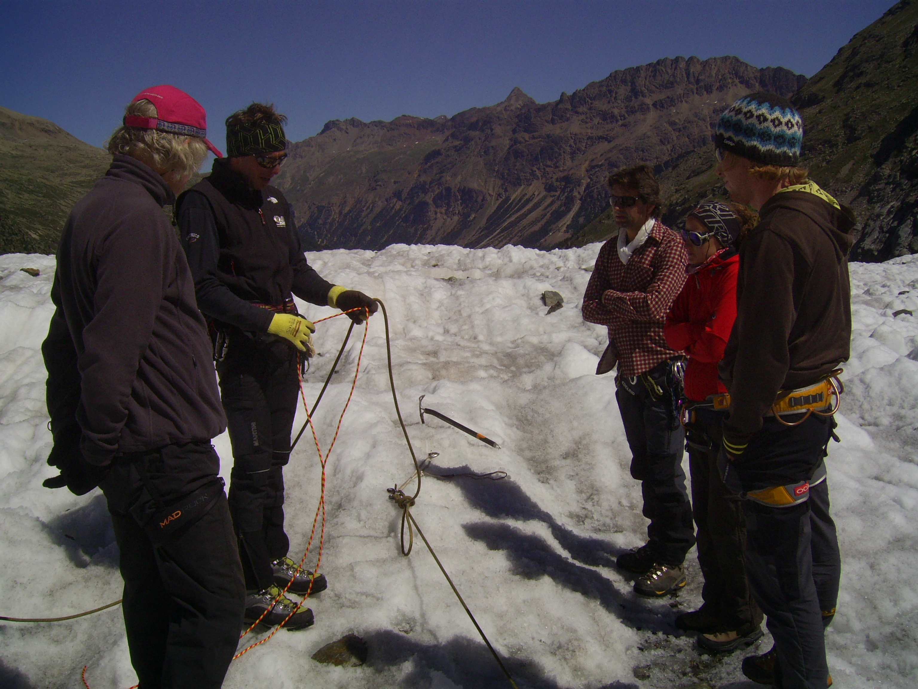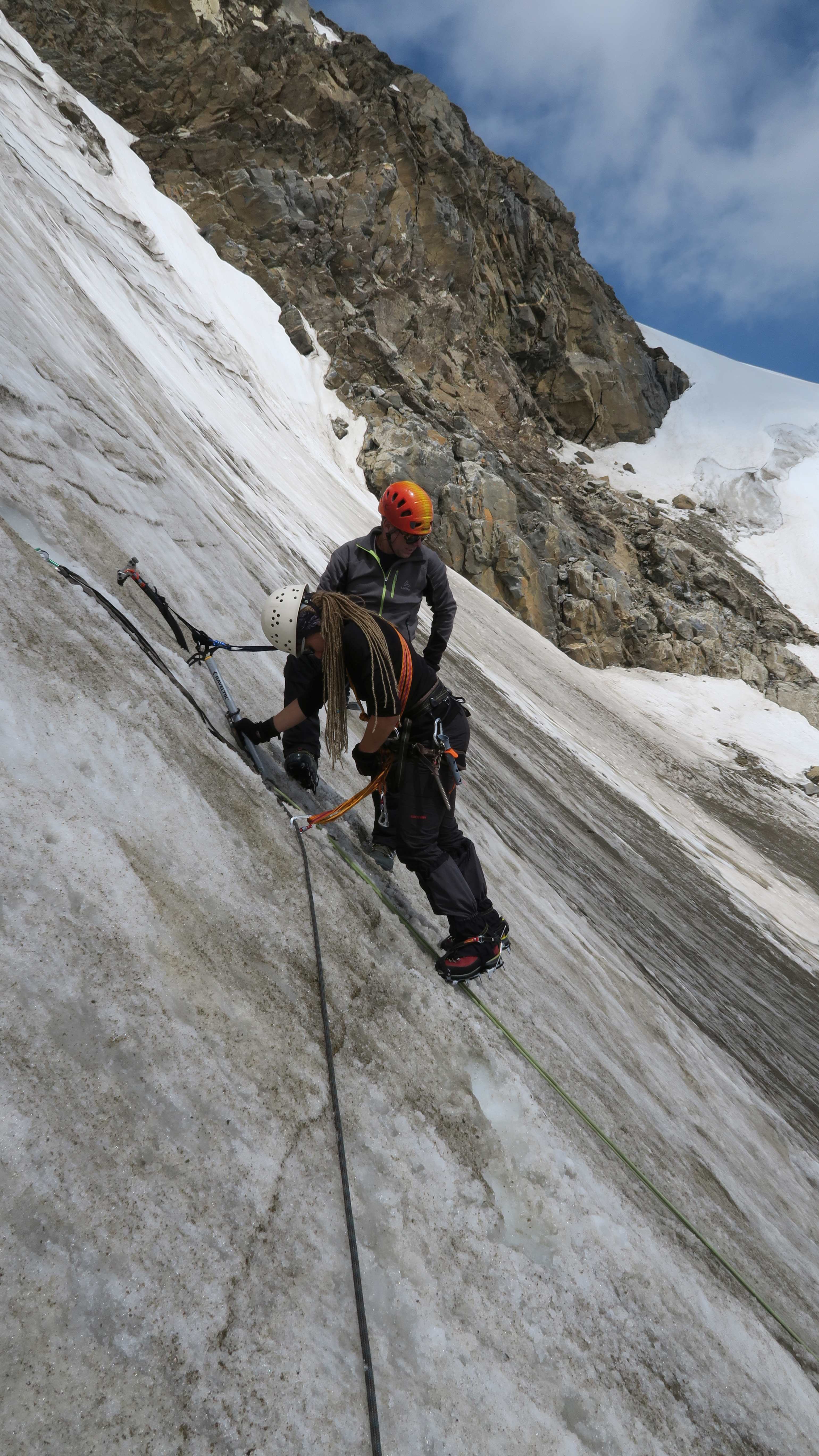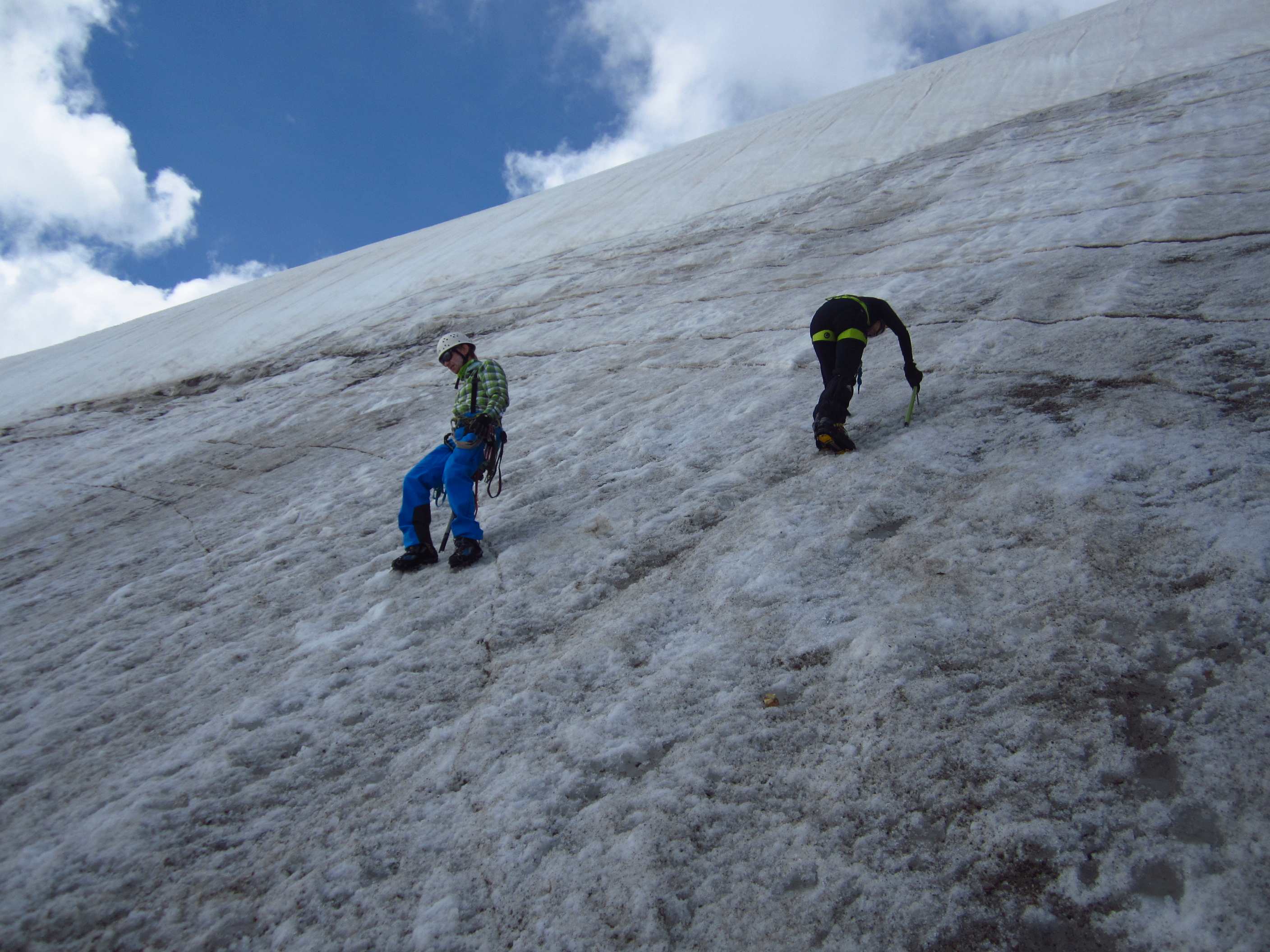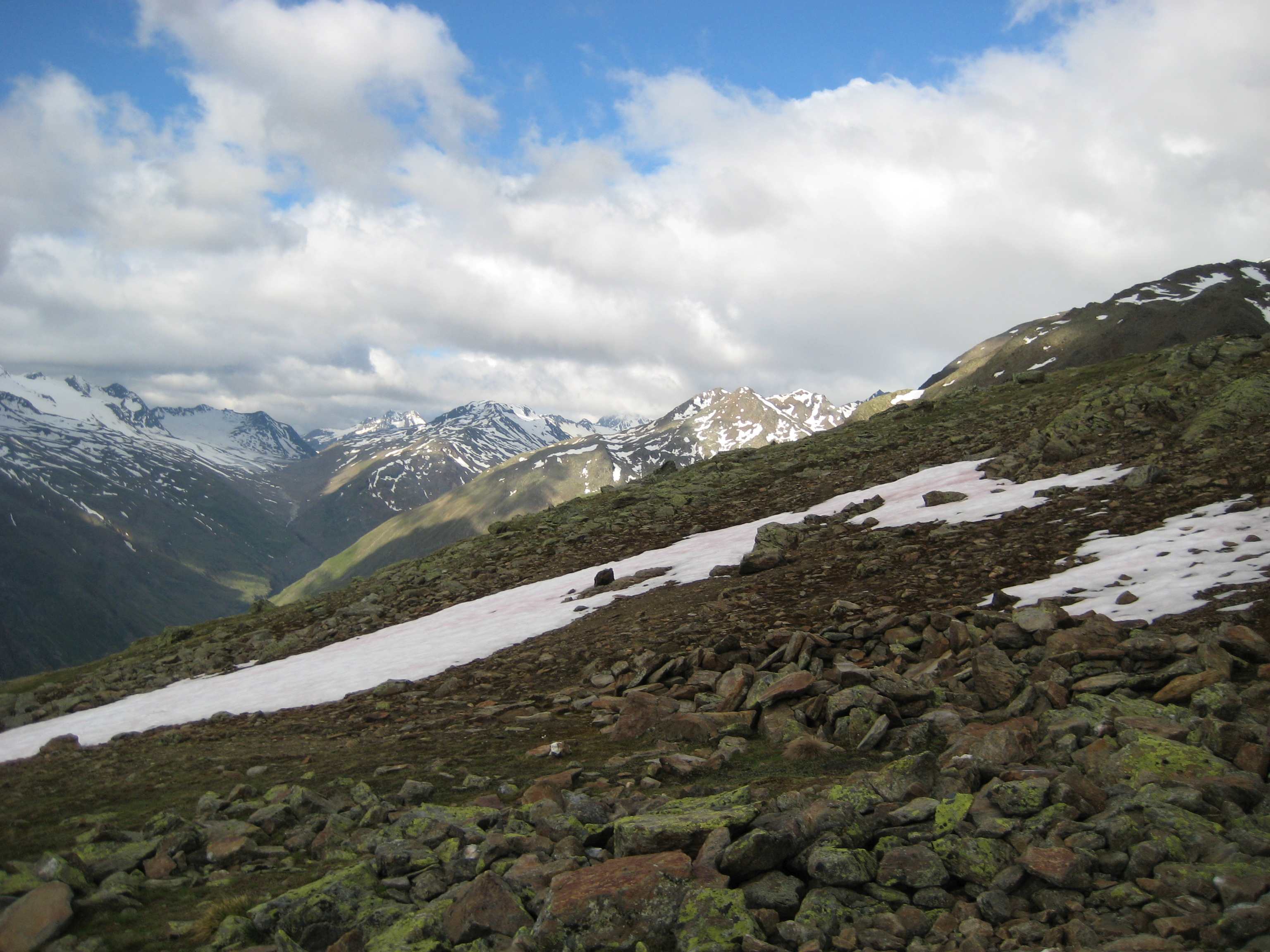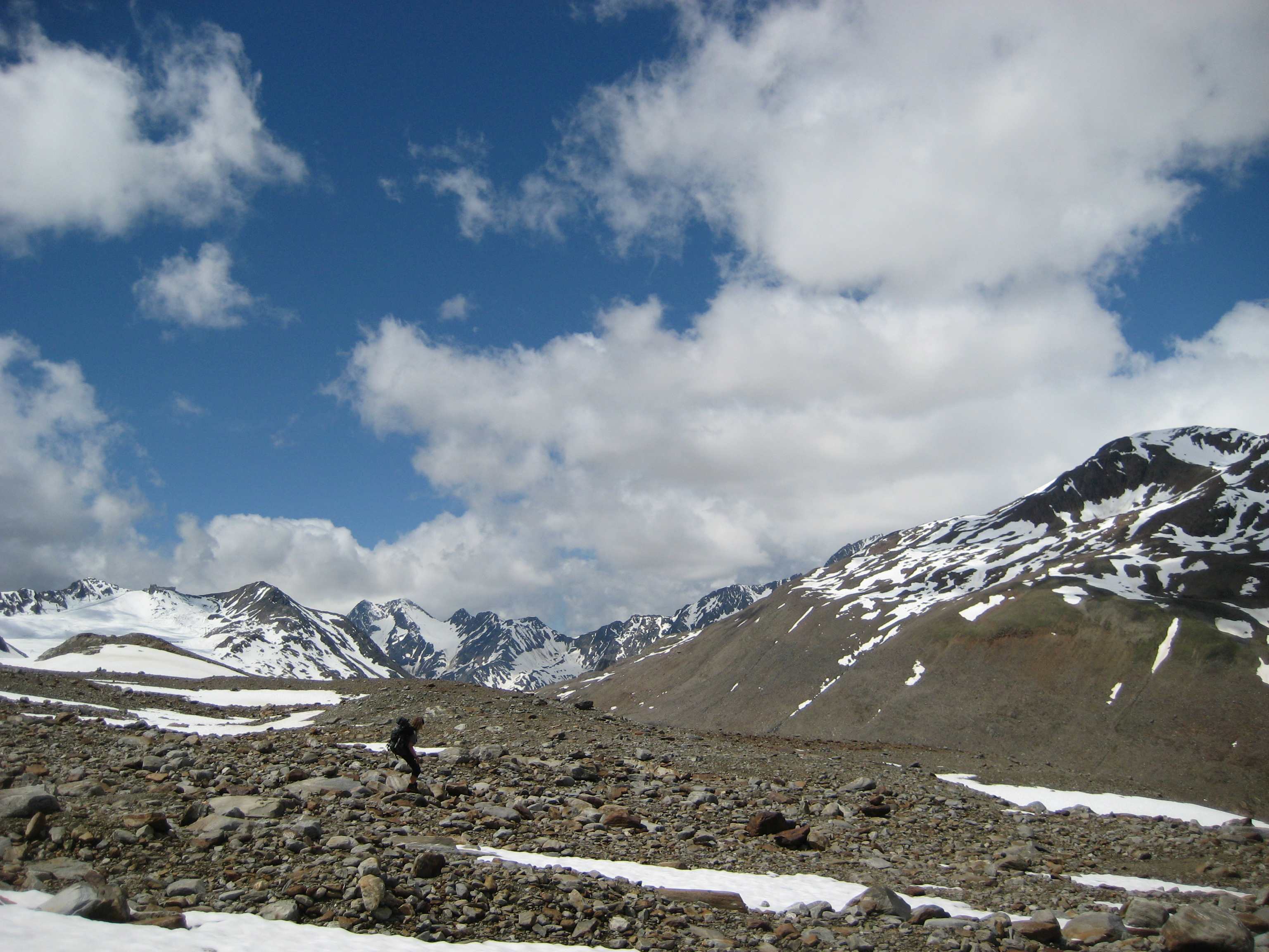 Aufstieg von Vent zur Martin-Busch-Hütte, dort Arbeitseinsatz auf dem Dach der Hütte. Besteigung Kreuzspitze bis ca. 50m vorm Gipfelkreuz weil Gewitter. Übergang zur Similaun Hütte über die Ötzi Fundstelle, Hochferner, Hochjochhospiz zur Breslauer Hütte. Versuch Besteigung Wildspitze bis Mitterkarjoch, dann Umdrehen wegen Schneesturm. Abstieg nach Vent.