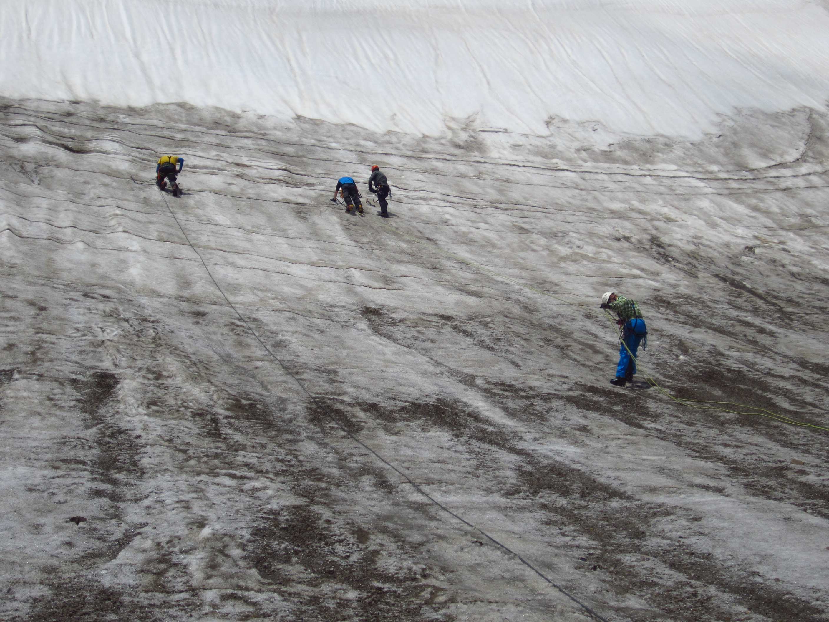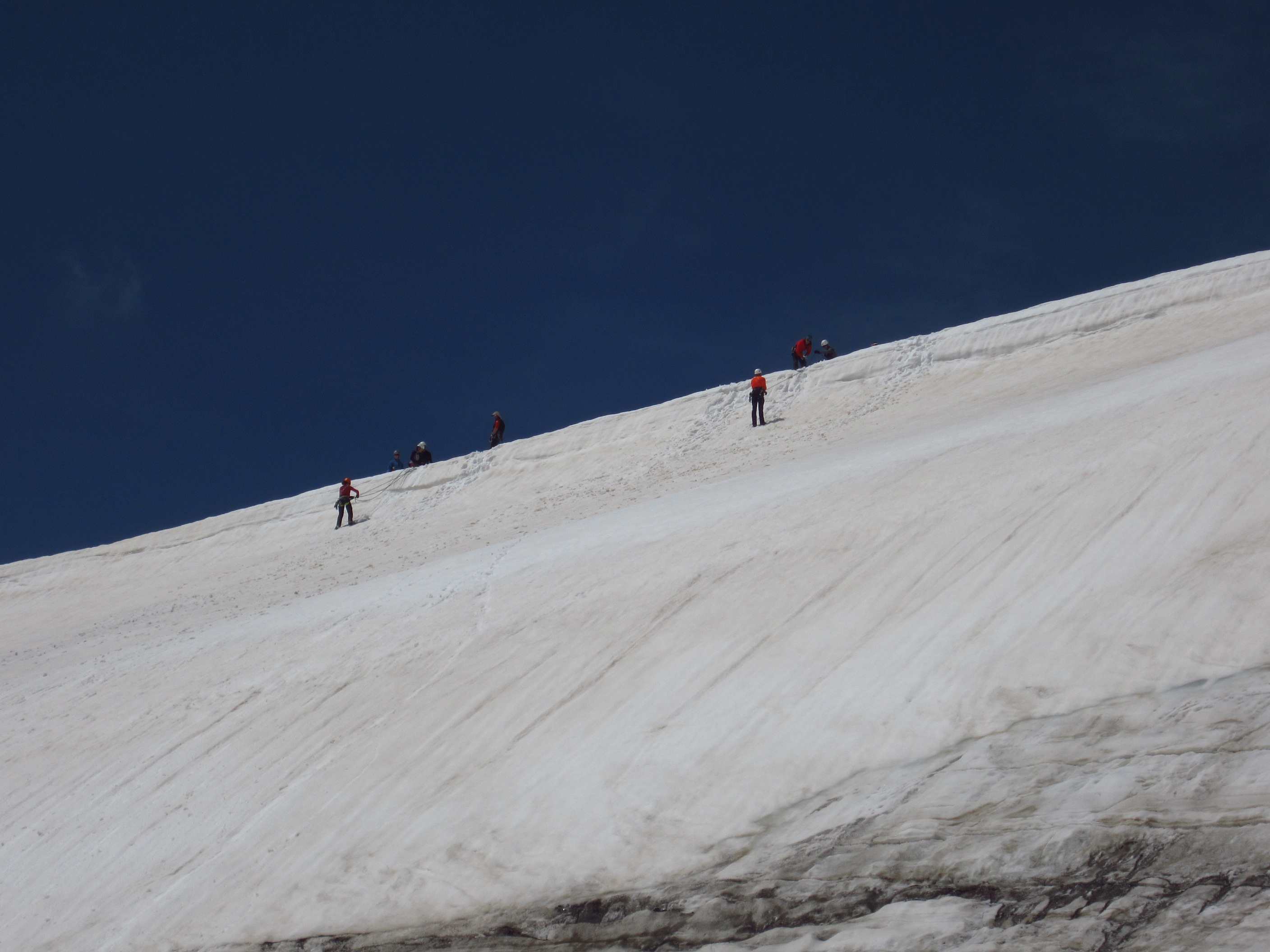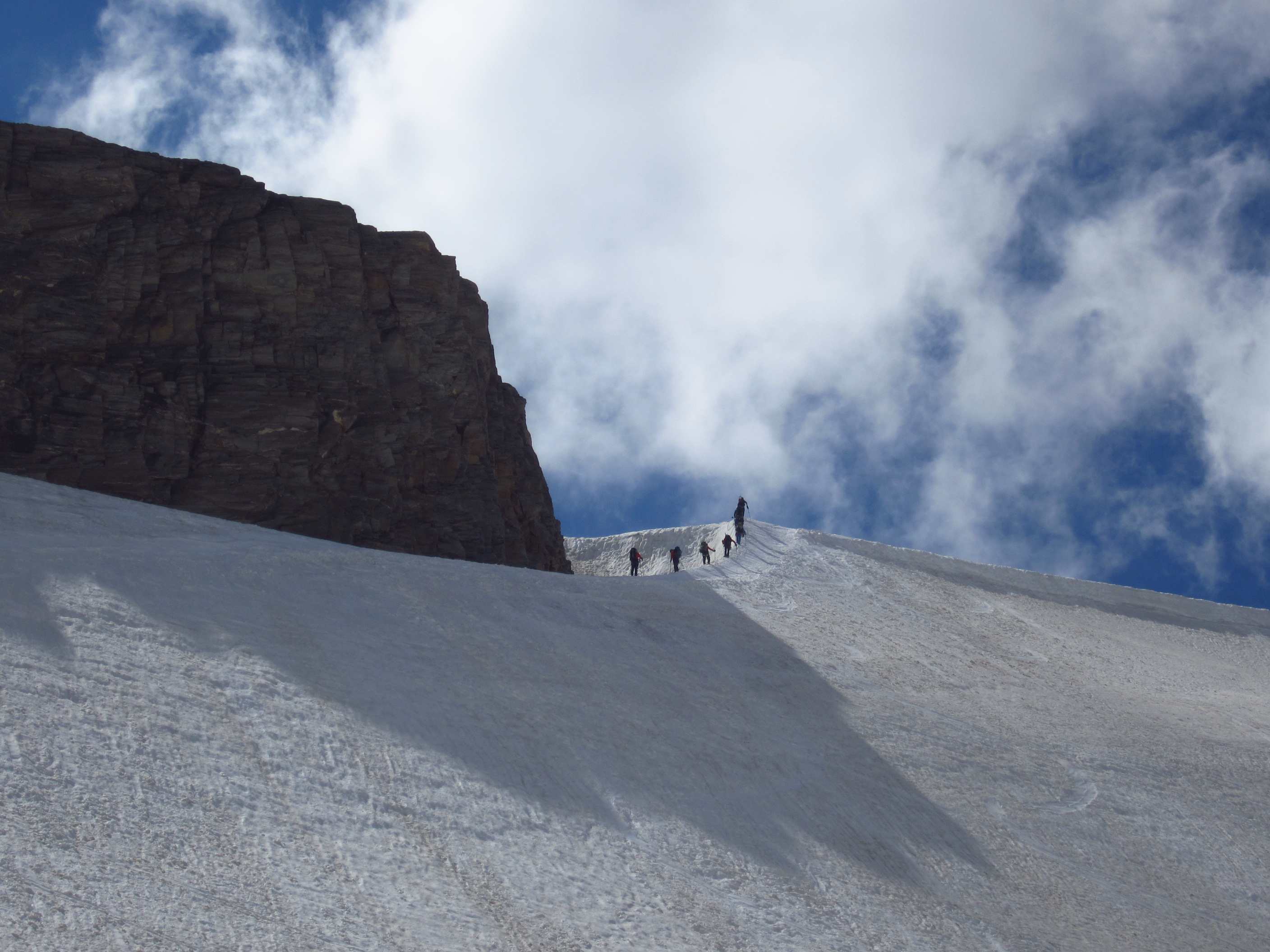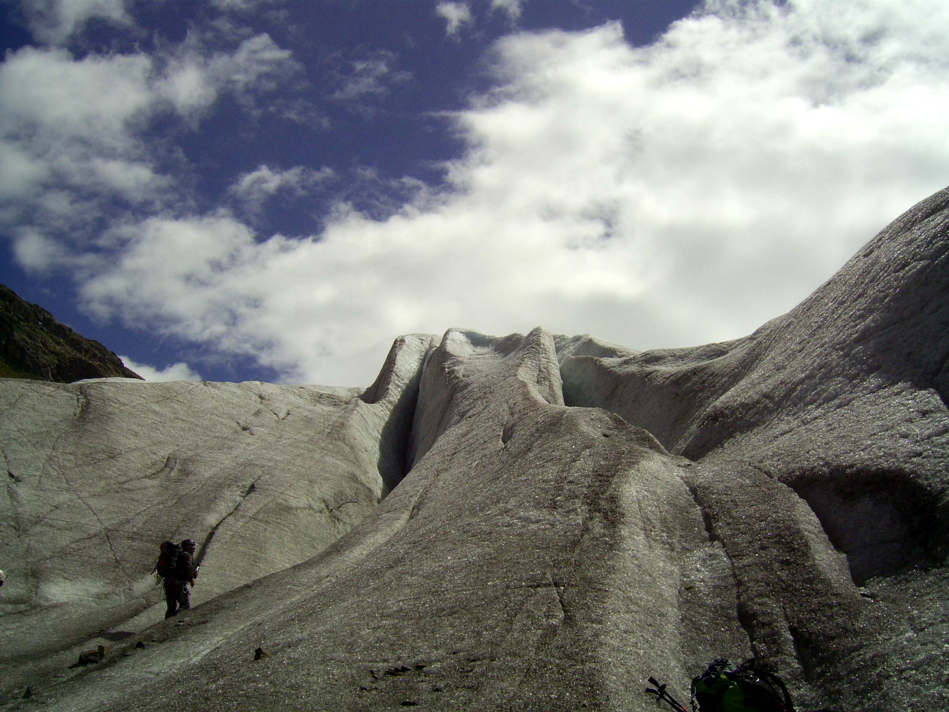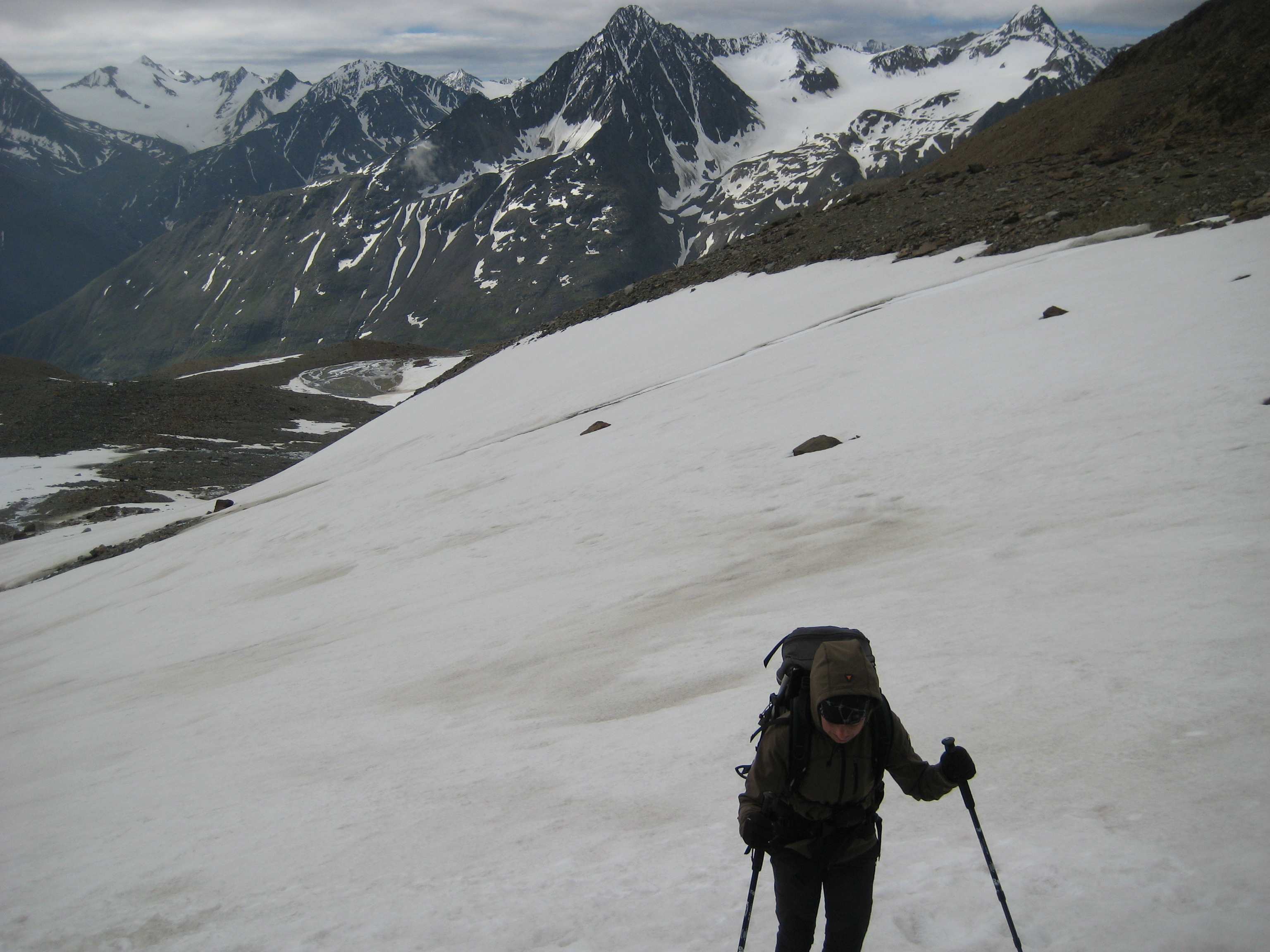 Aufstieg von Vent zur Martin-Busch-Hütte, dort Arbeitseinsatz auf dem Dach der Hütte. Besteigung Kreuzspitze bis ca. 50m vorm Gipfelkreuz weil Gewitter. Übergang zur Similaun Hütte über die Ötzi Fundstelle, Hochferner, Hochjochhospiz zur Breslauer Hütte. Versuch Besteigung Wildspitze bis Mitterkarjoch, dann Umdrehen wegen Schneesturm. Abstieg nach Vent.