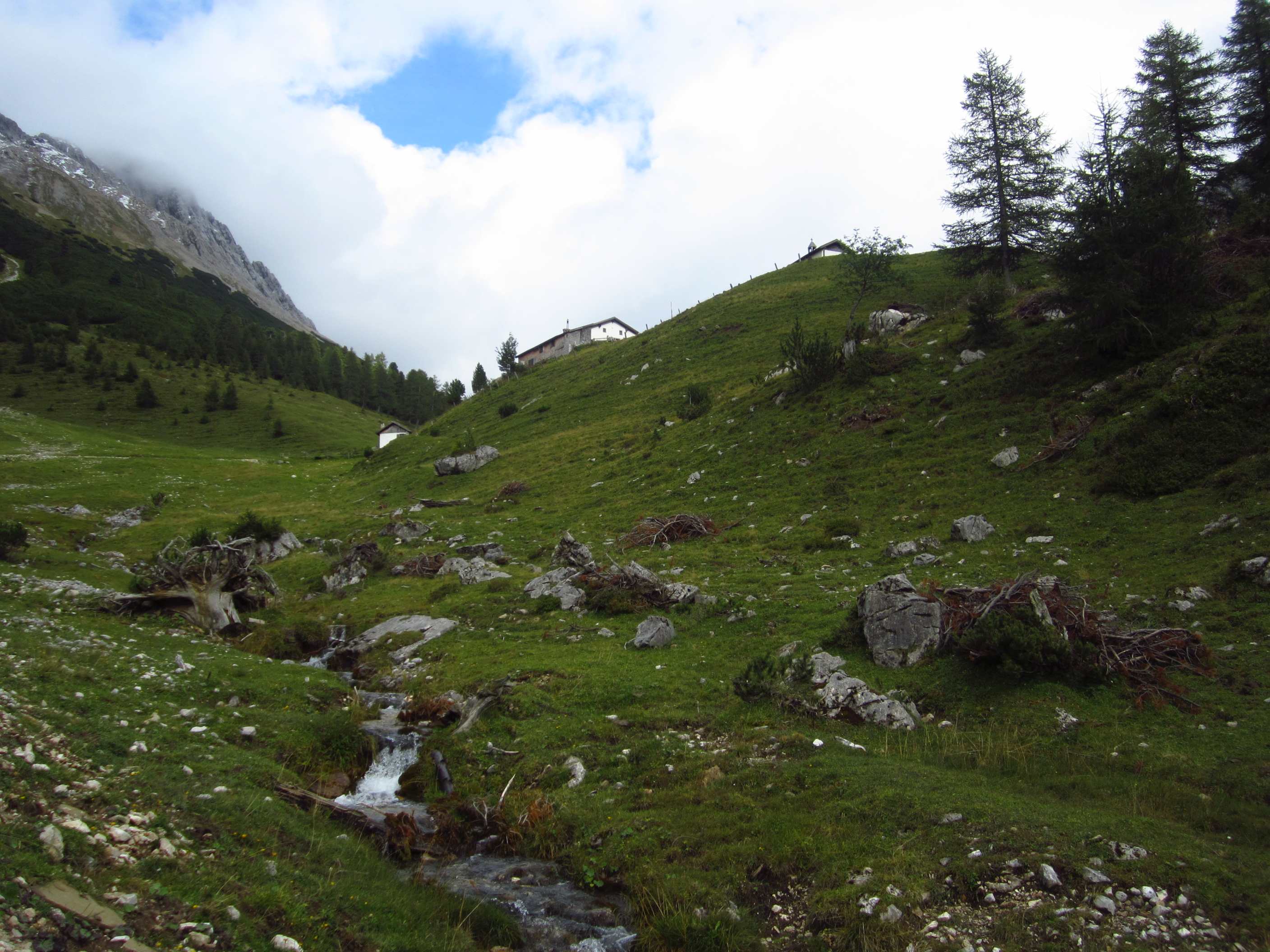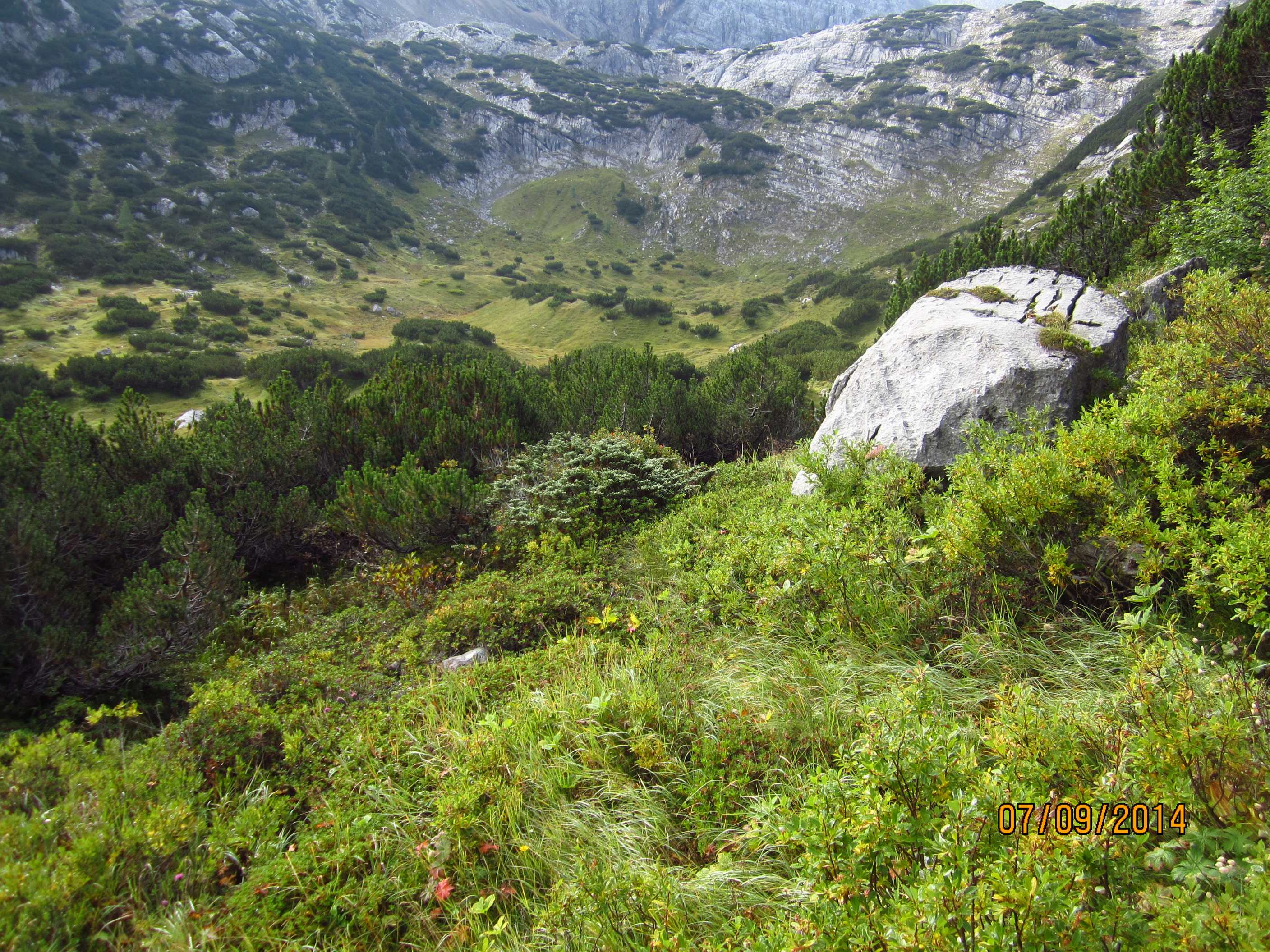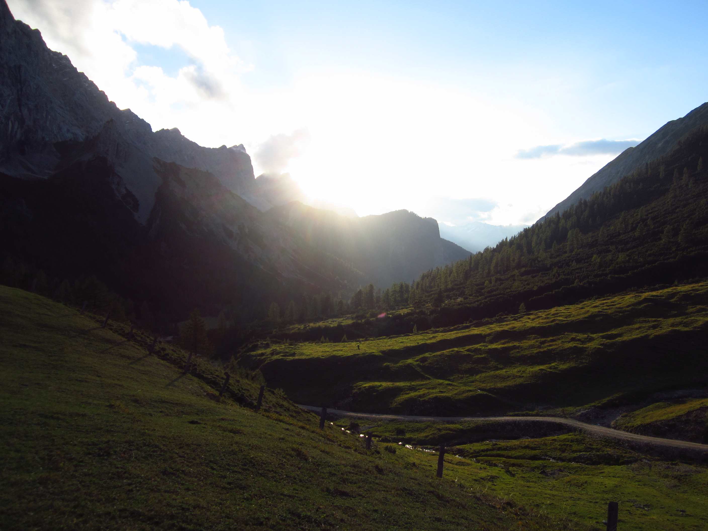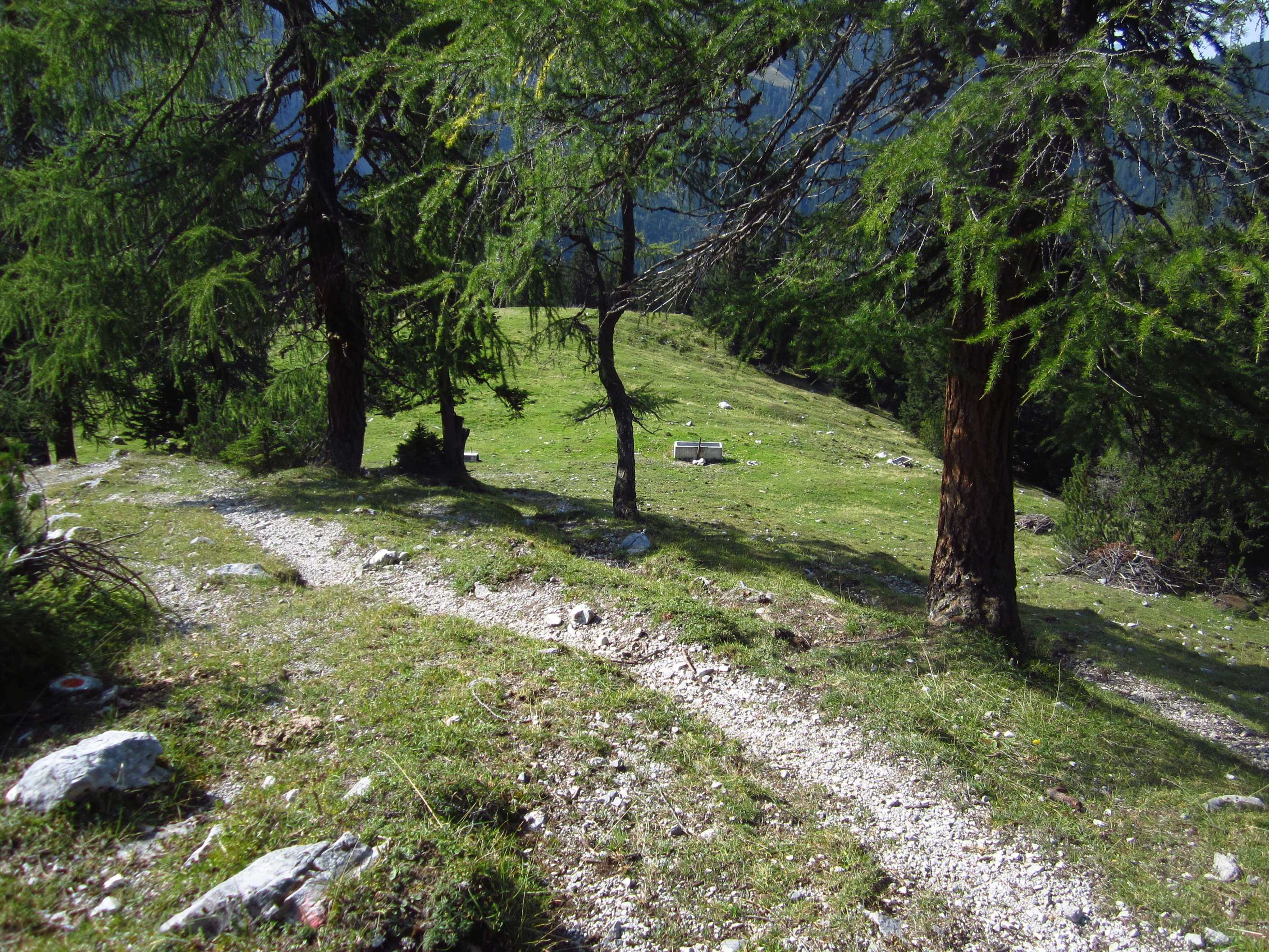Dann weiter am Hang entlang und dann eine Schotterrinne rauf in Serpentinen, dann über Wiesen und Bäume entlang und dann durch Wald Abstieg, dort an ner kleinen Alm war ein Pärchen die uns auf ein Bier einluden, der erklärte uns dann dass er vor 30 Jahren das Kreuz unterhalb des Lafatscher Jochs im Andenken an Kameraden mit aufstellte, vorher war dort da eines aus Holz und verrottet…