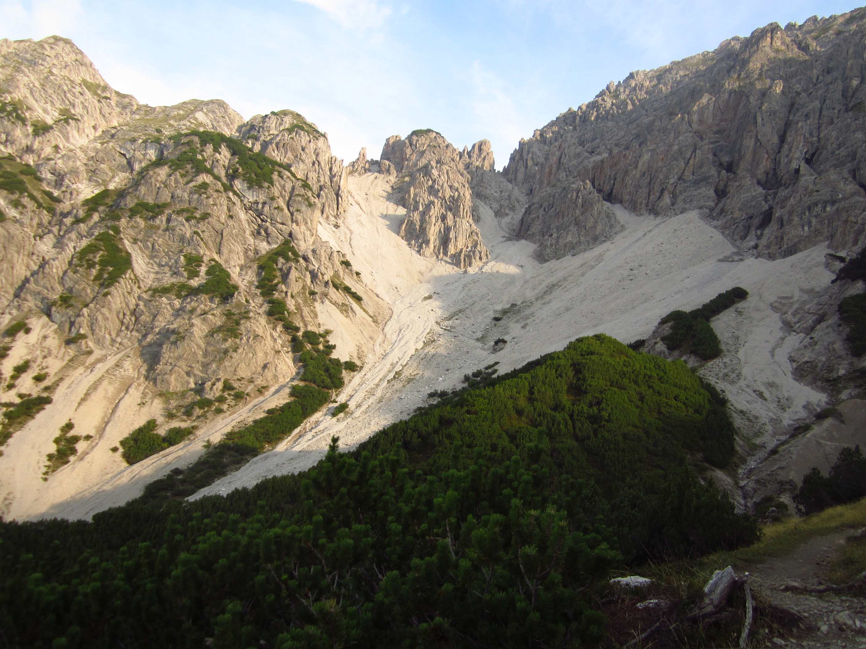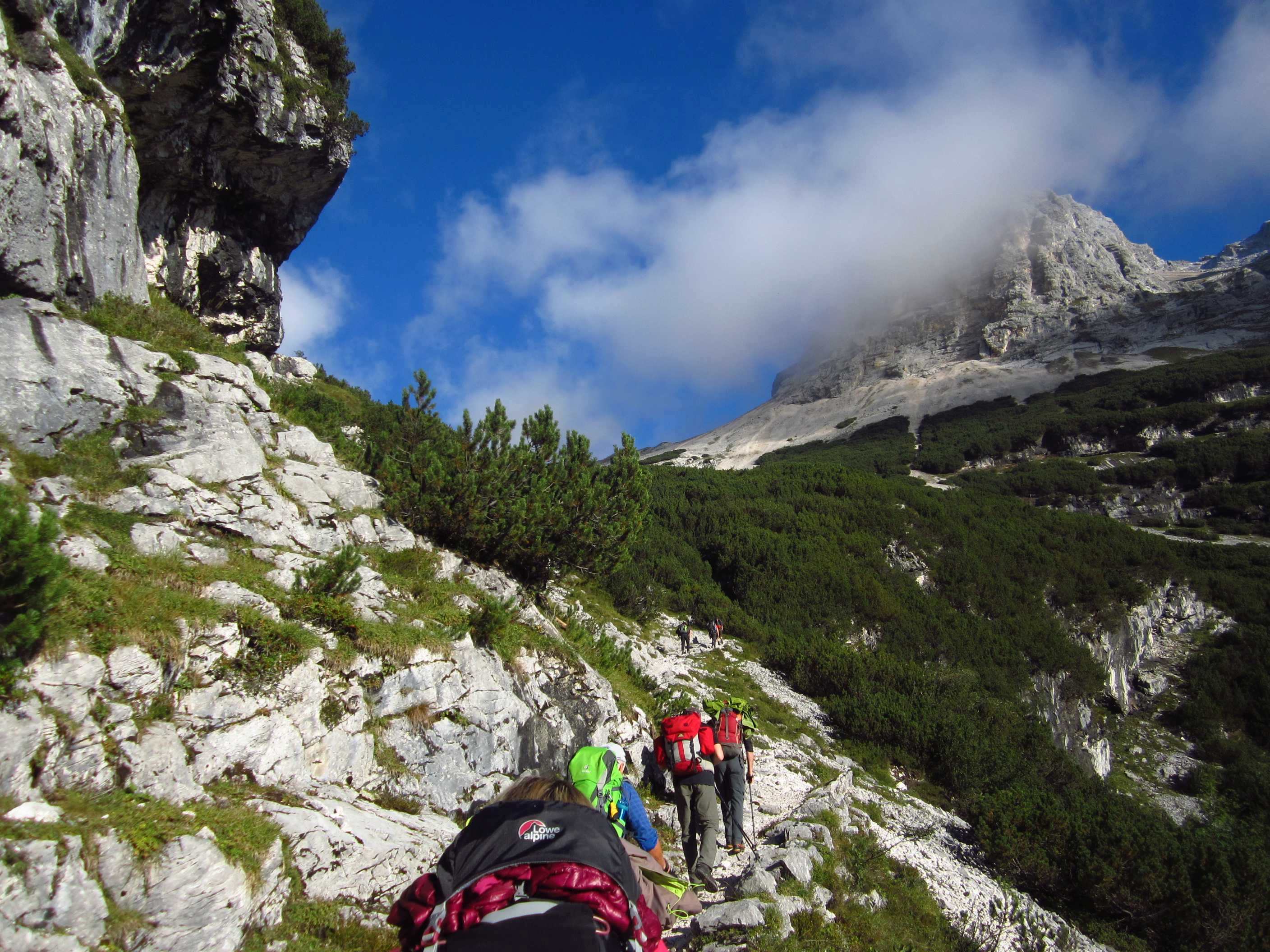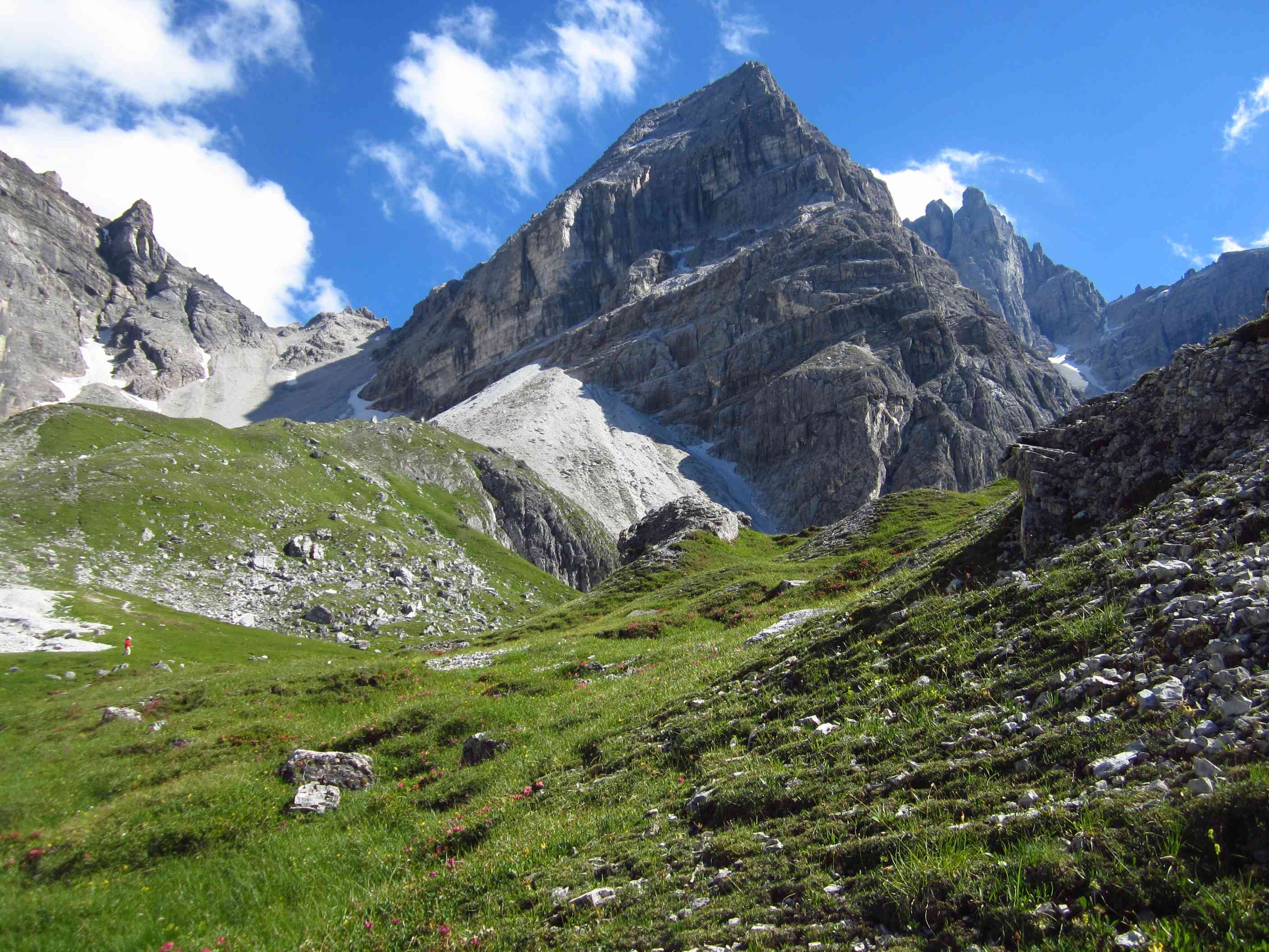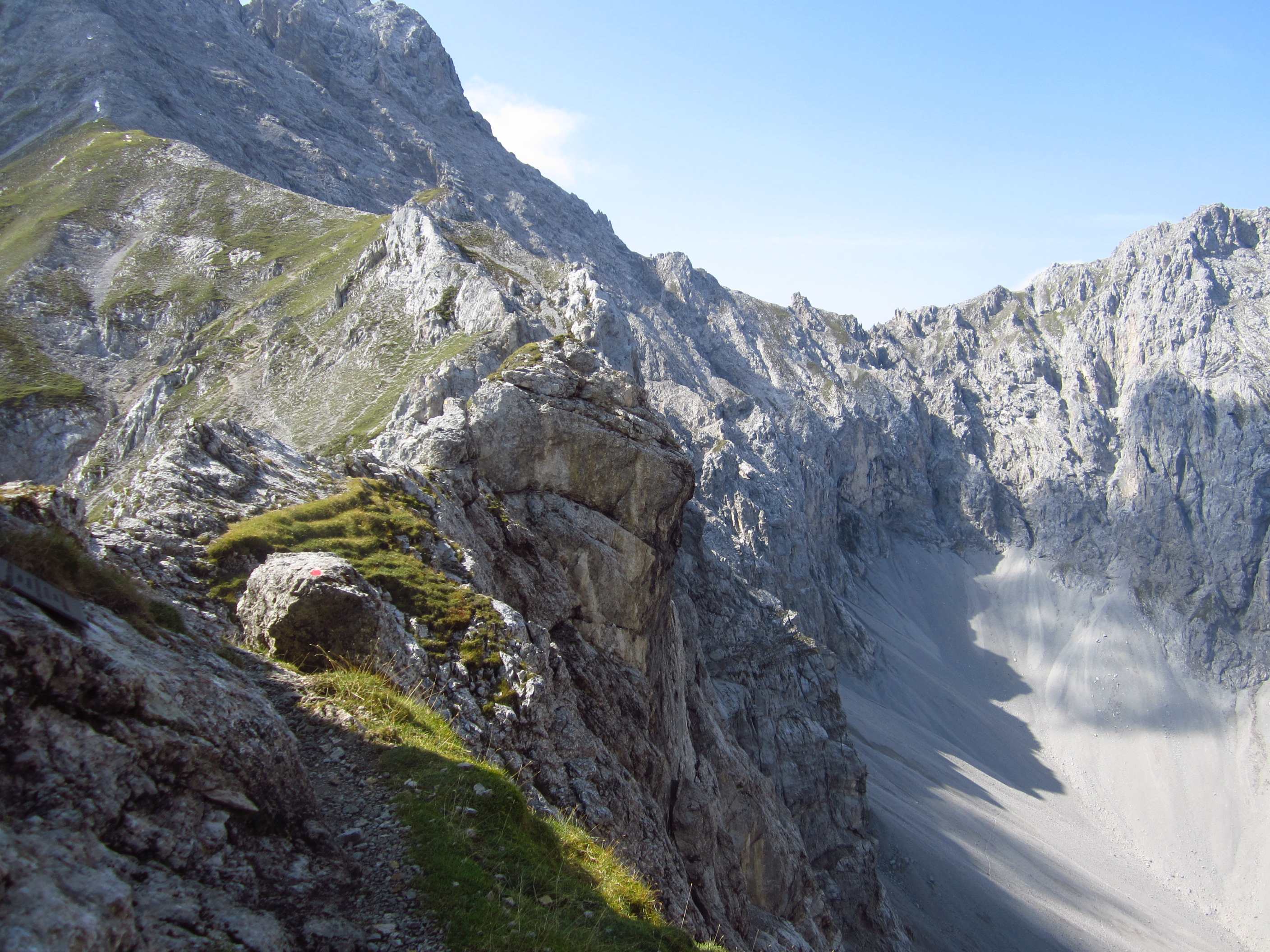 Also runter zur Pfeishütte auf einfachem Pfad durch sehr grüne Wiesen, irgendwie war die Landschaft wieder etwas anders als zuvor, sehr schön. Also Sachen rein in die Hütte und kurz unsere mitgenommene Brotzeit gegessen, Lager bezogen und gleich ging es wieder los in Richtung Sonntagkarspitze. Das Wetter wurde wieder besser und die Sonne spitzte auch etwas durch. Zunächst über Pfad, dann sehr steil über Wiesen und vereinzelte Tritte, wirklich sehr steil, dann durch Fels und Wiese, so dass man schon die Hände benutzen musste und dann durch Fels kraxeln. Alles Absturzgelände und gar nicht ohne… Wir haben sehr lange nachgedacht und haben dann entschieden, umzudrehen. Es bleiben ja noch genug Gipfel.