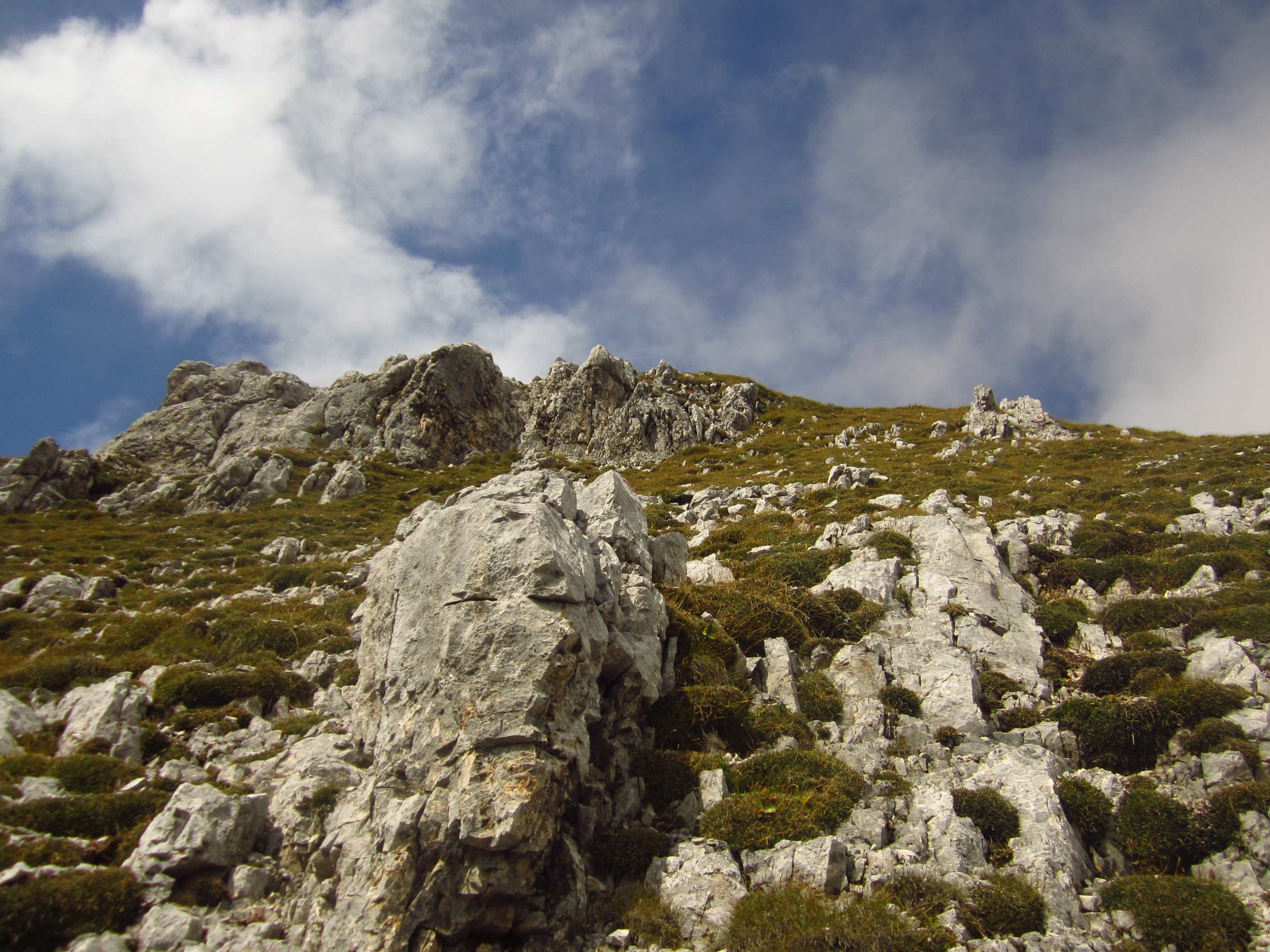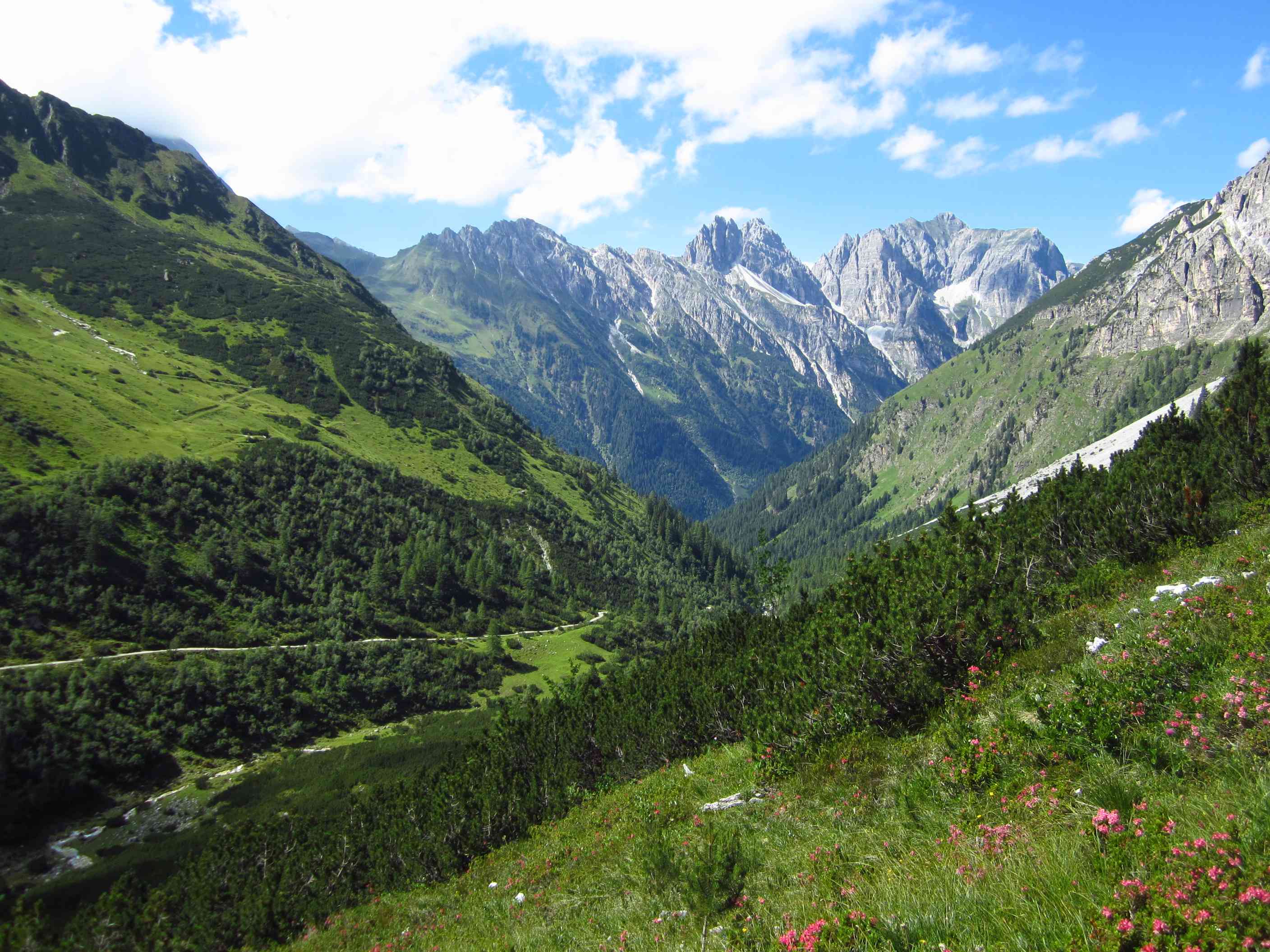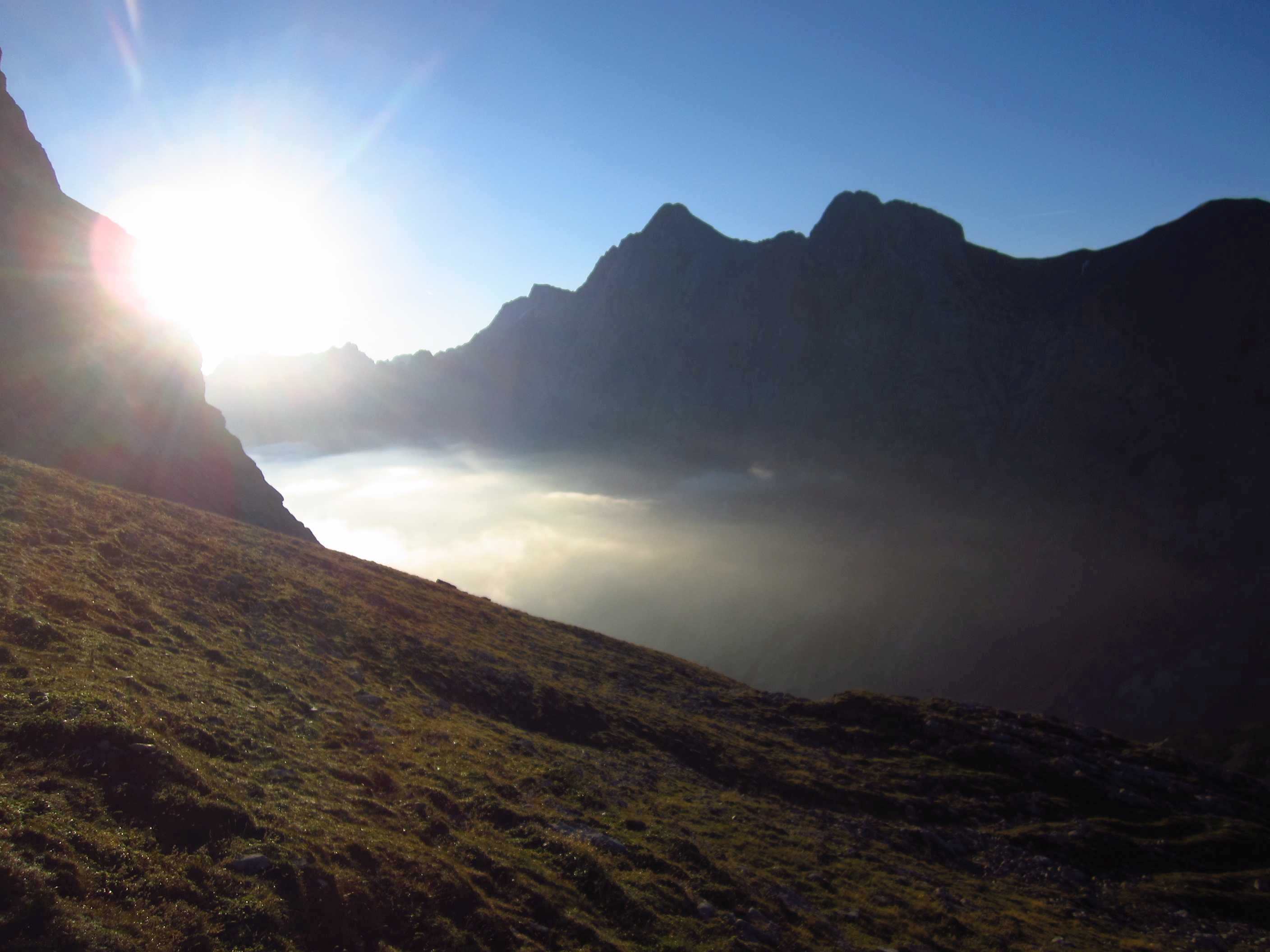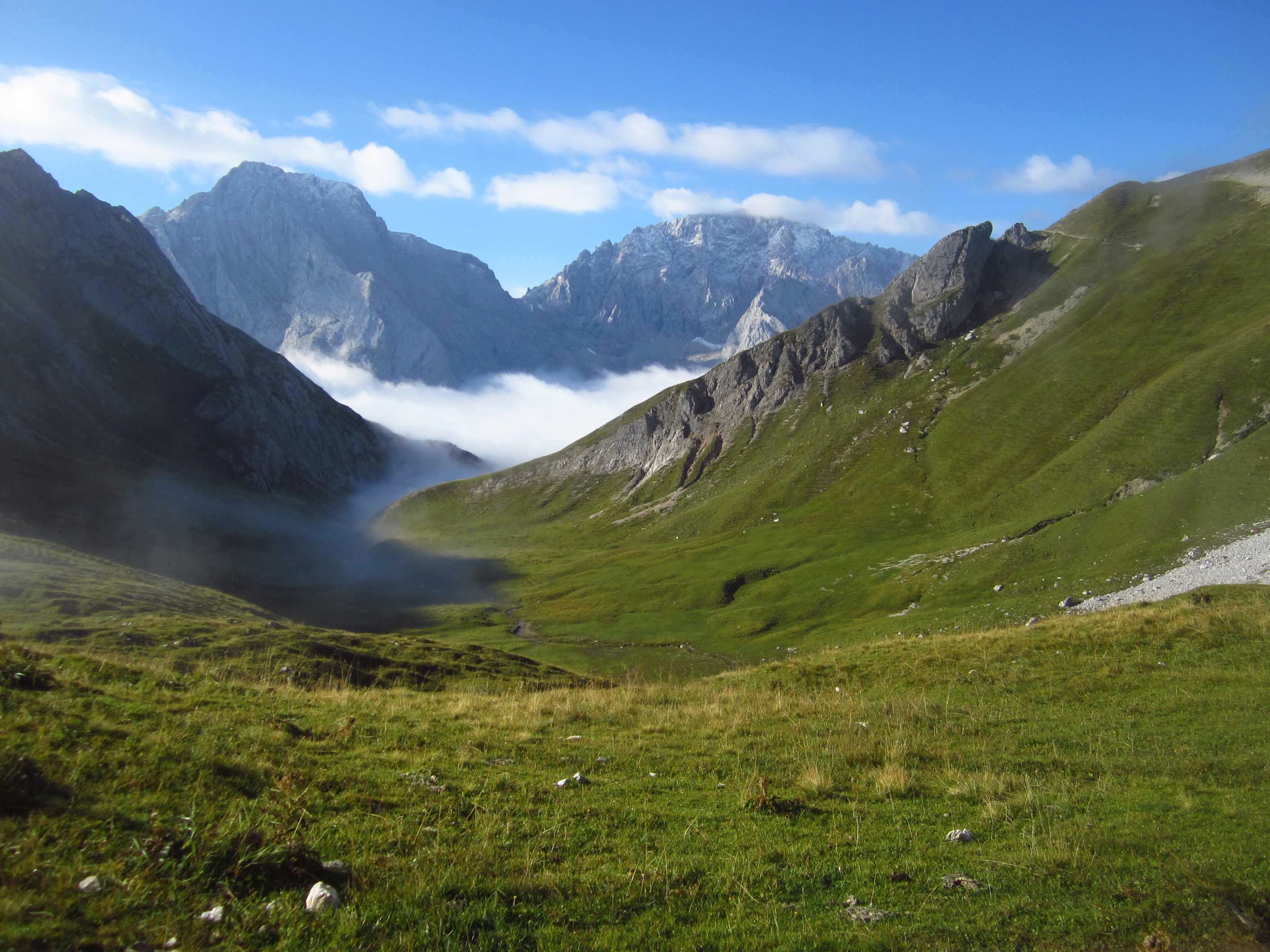 Also runter zur Pfeishütte auf einfachem Pfad durch sehr grüne Wiesen, irgendwie war die Landschaft wieder etwas anders als zuvor, sehr schön. Also Sachen rein in die Hütte und kurz unsere mitgenommene Brotzeit gegessen, Lager bezogen und gleich ging es wieder los in Richtung Sonntagkarspitze. Das Wetter wurde wieder besser und die Sonne spitzte auch etwas durch. Zunächst über Pfad, dann sehr steil über Wiesen und vereinzelte Tritte, wirklich sehr steil, dann durch Fels und Wiese, so dass man schon die Hände benutzen musste und dann durch Fels kraxeln. Alles Absturzgelände und gar nicht ohne… Wir haben sehr lange nachgedacht und haben dann entschieden, umzudrehen. Es bleiben ja noch genug Gipfel.