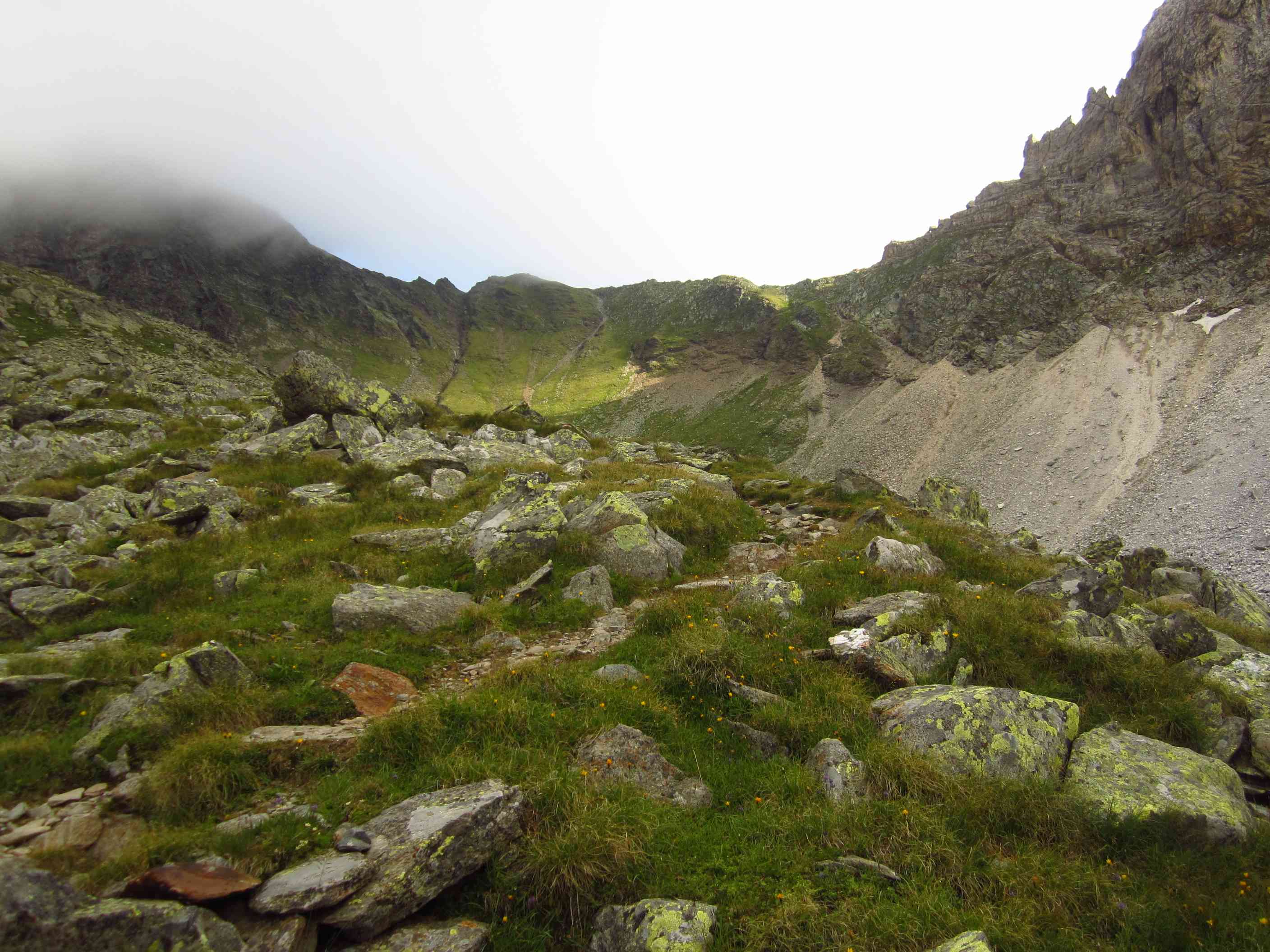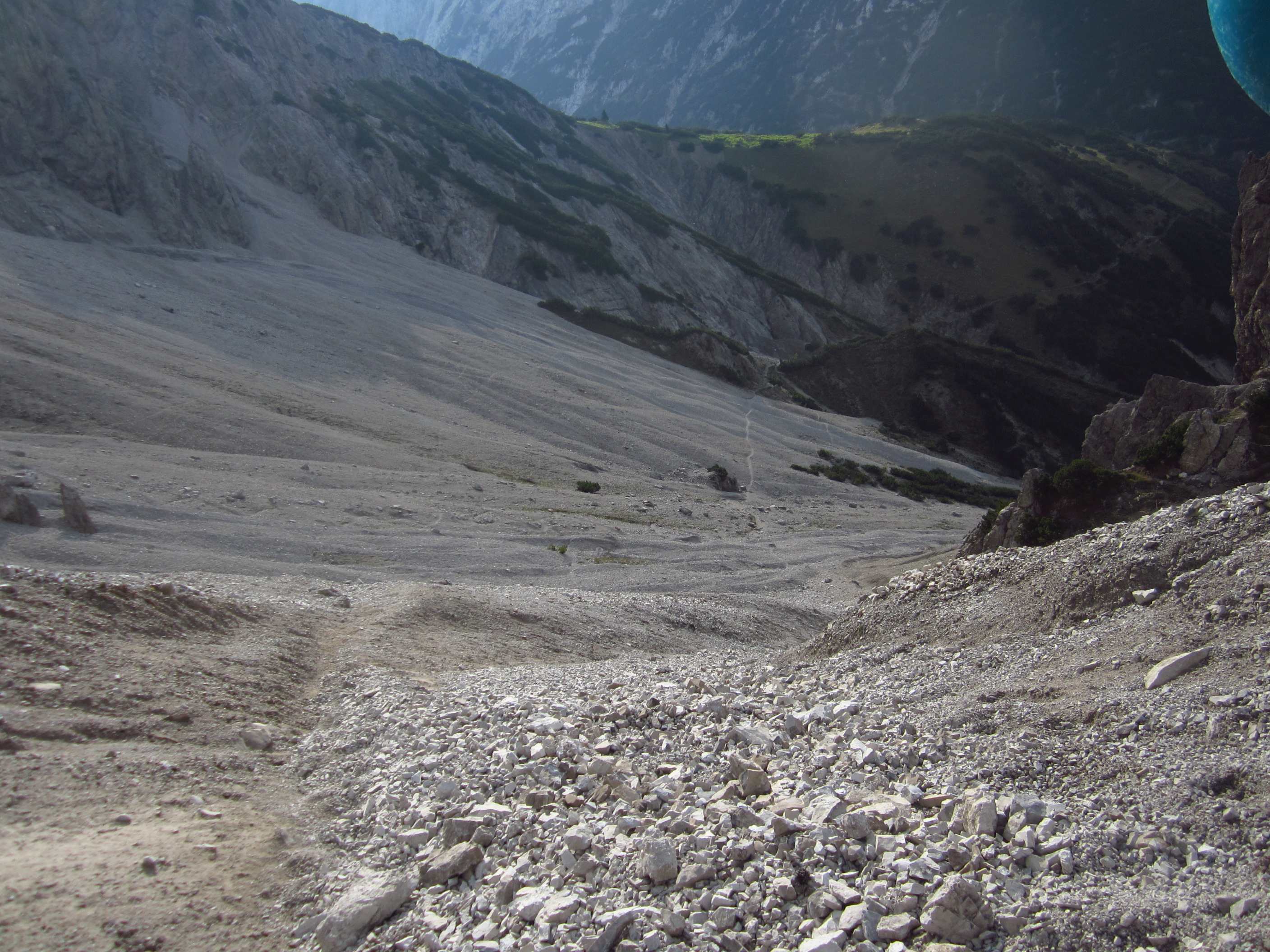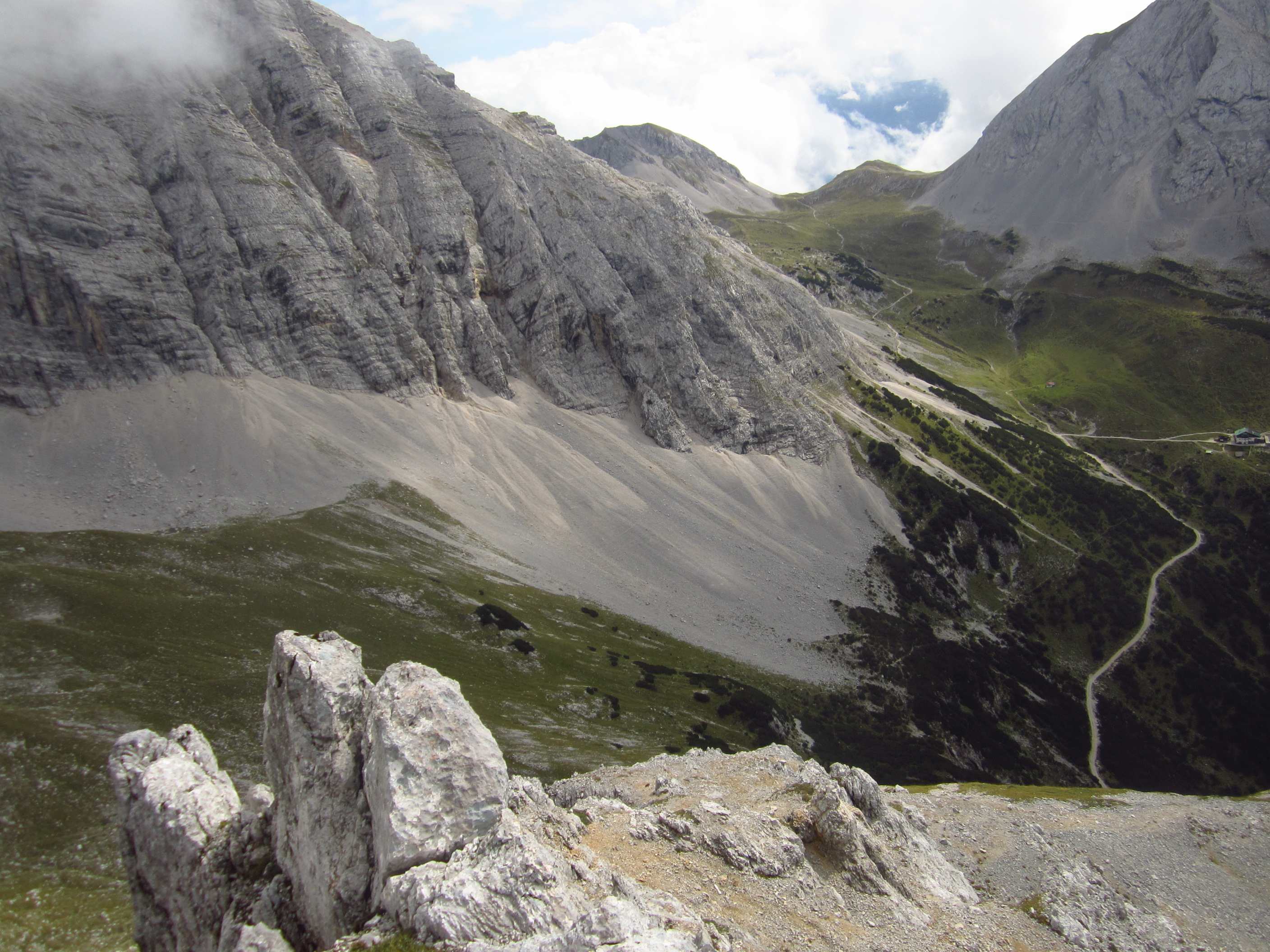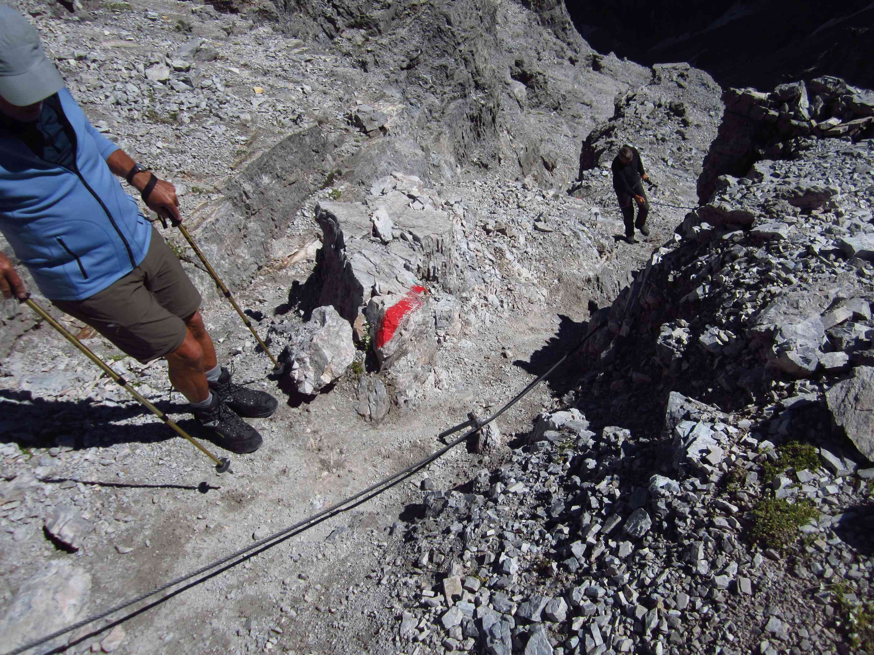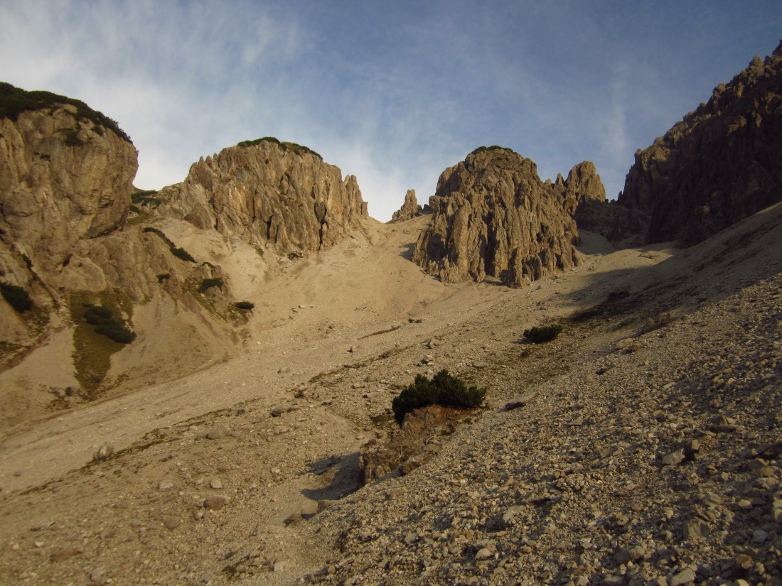Also von der Hütte zunächst über Bergwege und dann in Serpentinen den Geröllhang hoch zur Scharte, dann wieder Geröllhangabstieg.