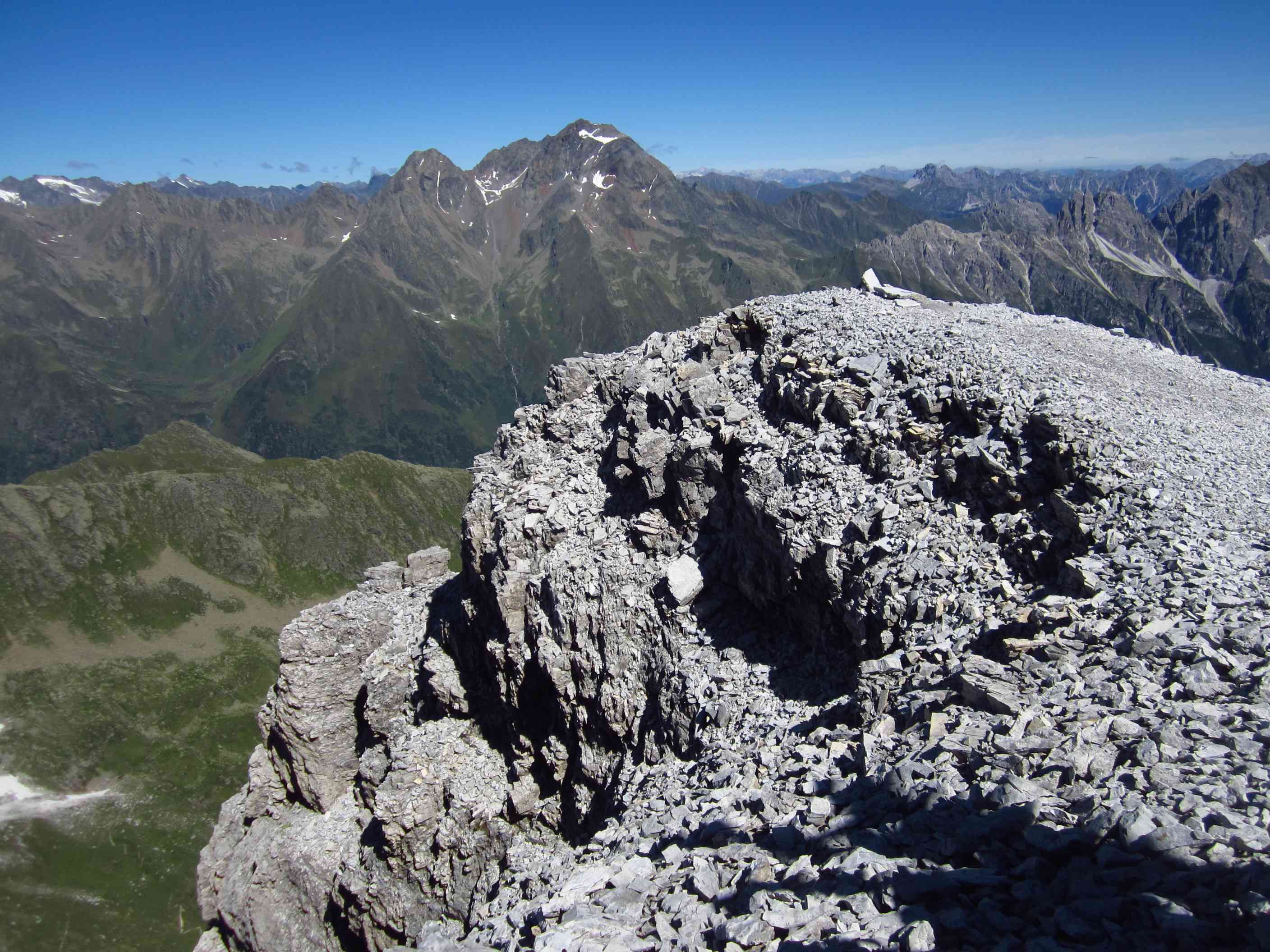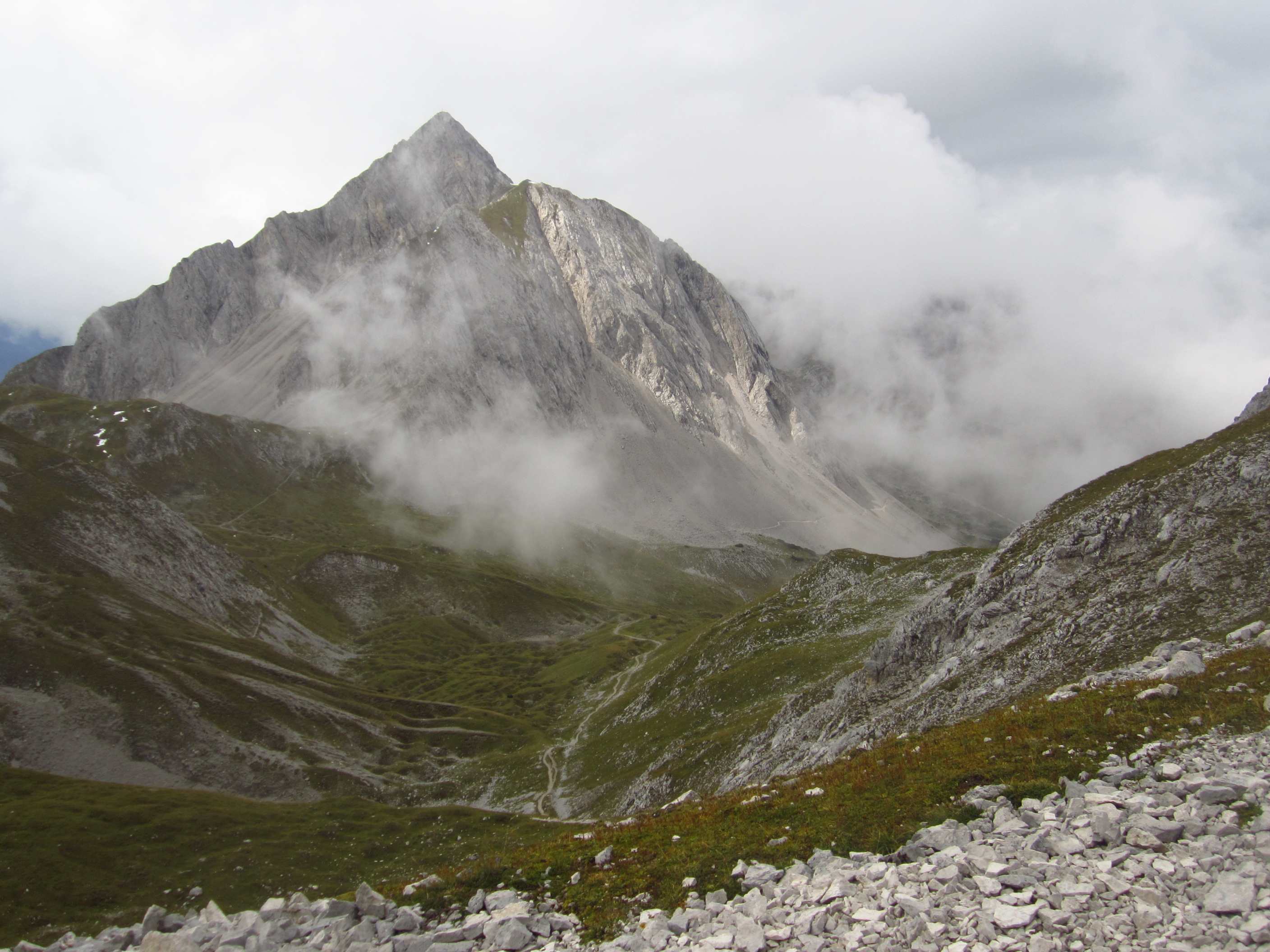 Am Vormittag ging es über den Weg von gestern zurück zum Lafatscher Joch und weiter auf dem Weg Richtung Stempeljoch. Die letzten Höhenmeter hinauf in Serpentinen sehr Steil über Schotter. Unseren ursprünglichen Plan, die Pfeiser Spitze noch mitzunehmen, ließen wir aus zwei Gründen sein. Zum einen war das Wetter zwar fast trocken, aber bewölkt und neblig… außerdem wollten wir in der Pfeishütte nur kurz unsere Sachen abstellen, kurz Pause machen und dann noch auf die Sonntagkarspitze. Dieser Plan war uns wichtiger als noch hoch auf die Pfeiser Spitze.