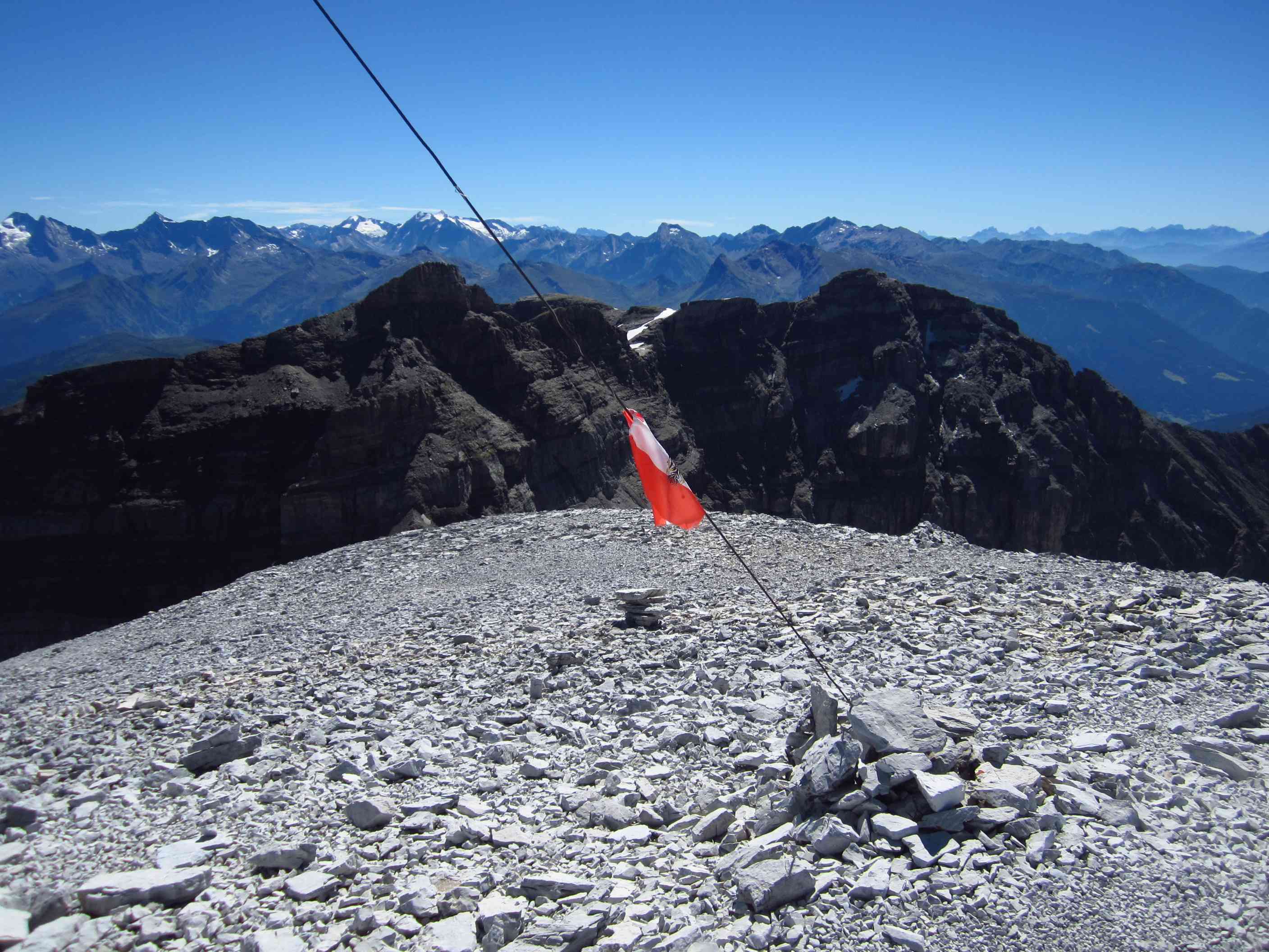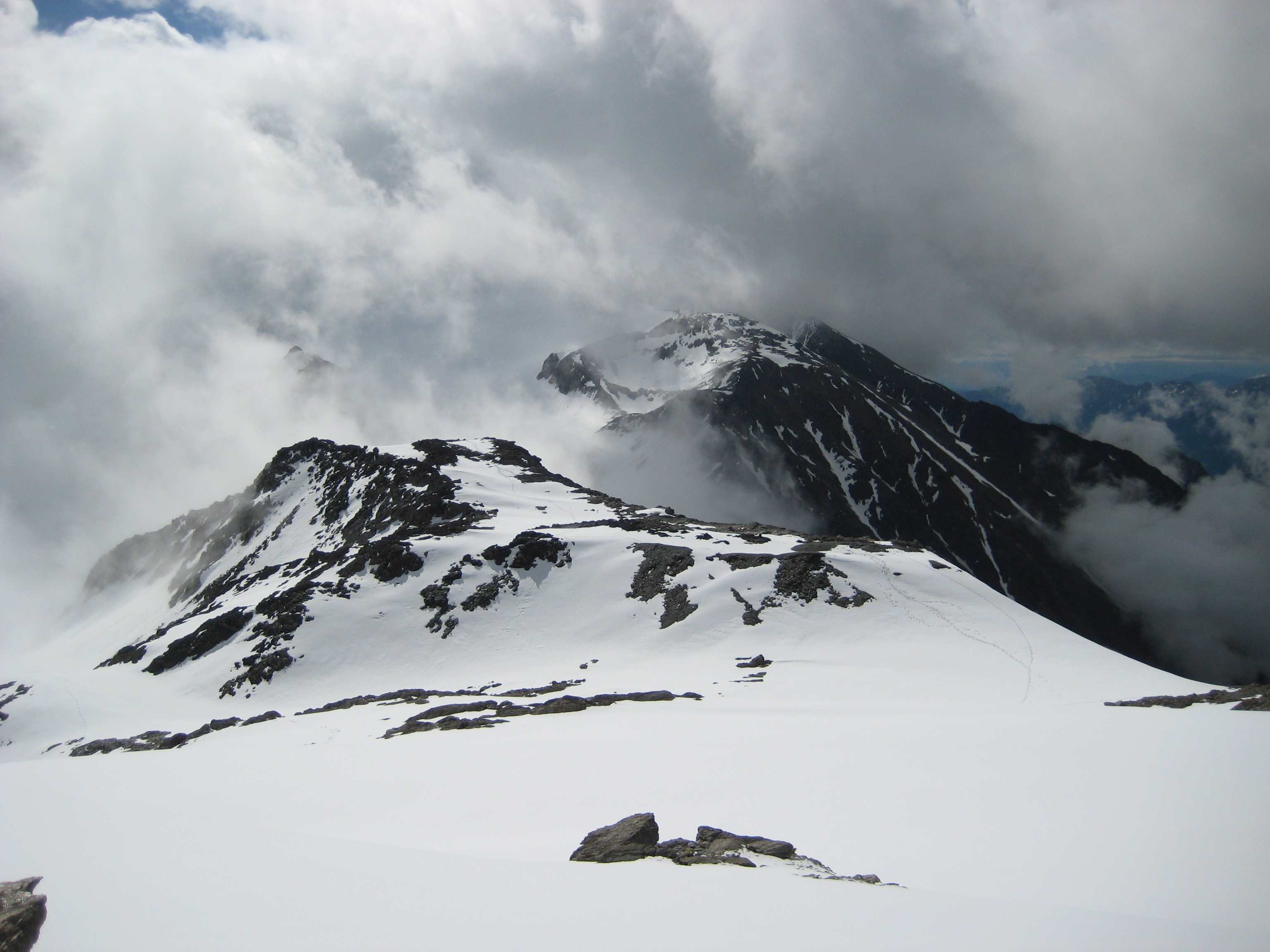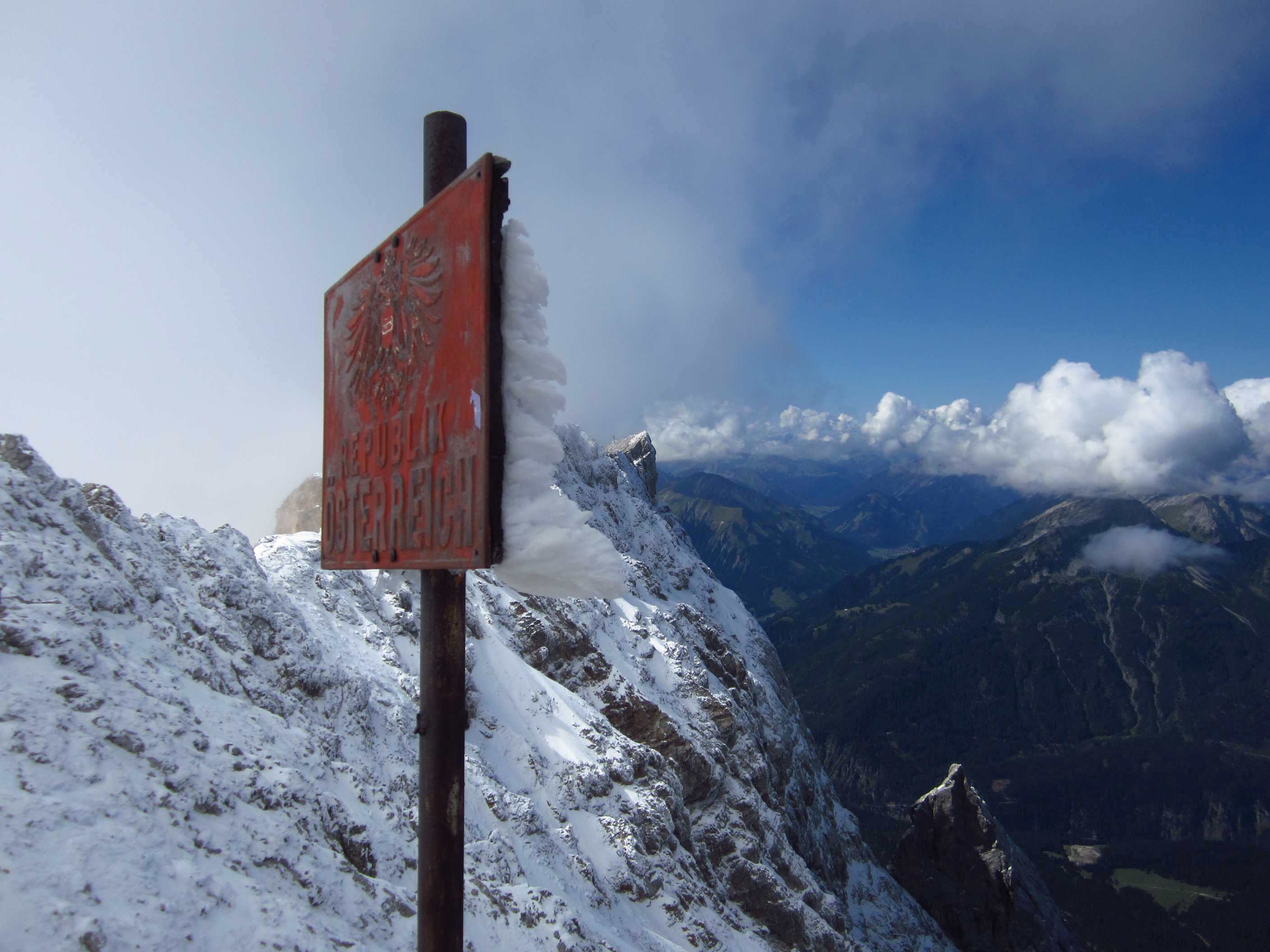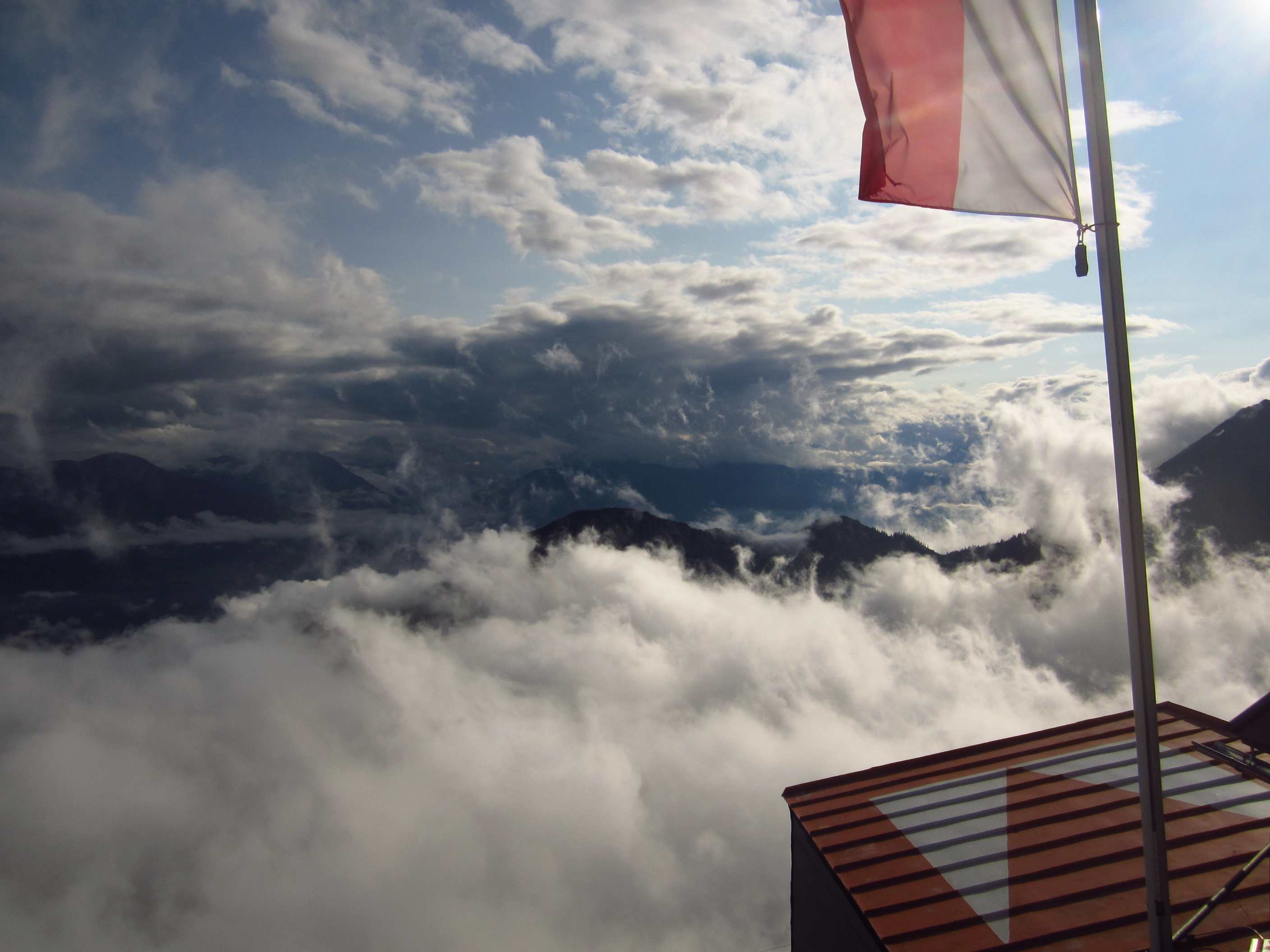Dann wieder runter und in die Hütte, zur zweiten Runde aufwärmen am Ofen. Dann riss der Himmel auf und der Gipfel des großen Bettelwurf lag frei und man hätte auch Aussicht gehabt, leider ca. 2-3 Stunden zu spät für uns.