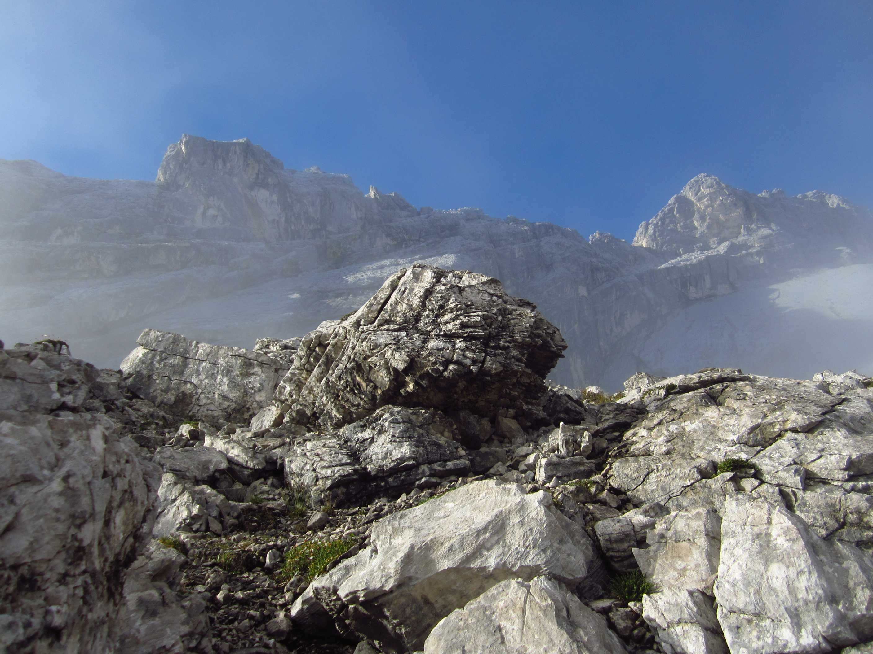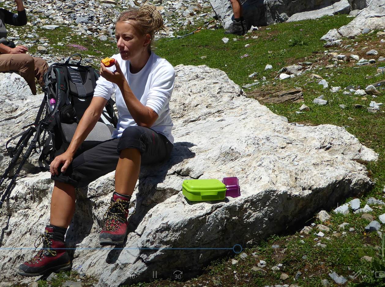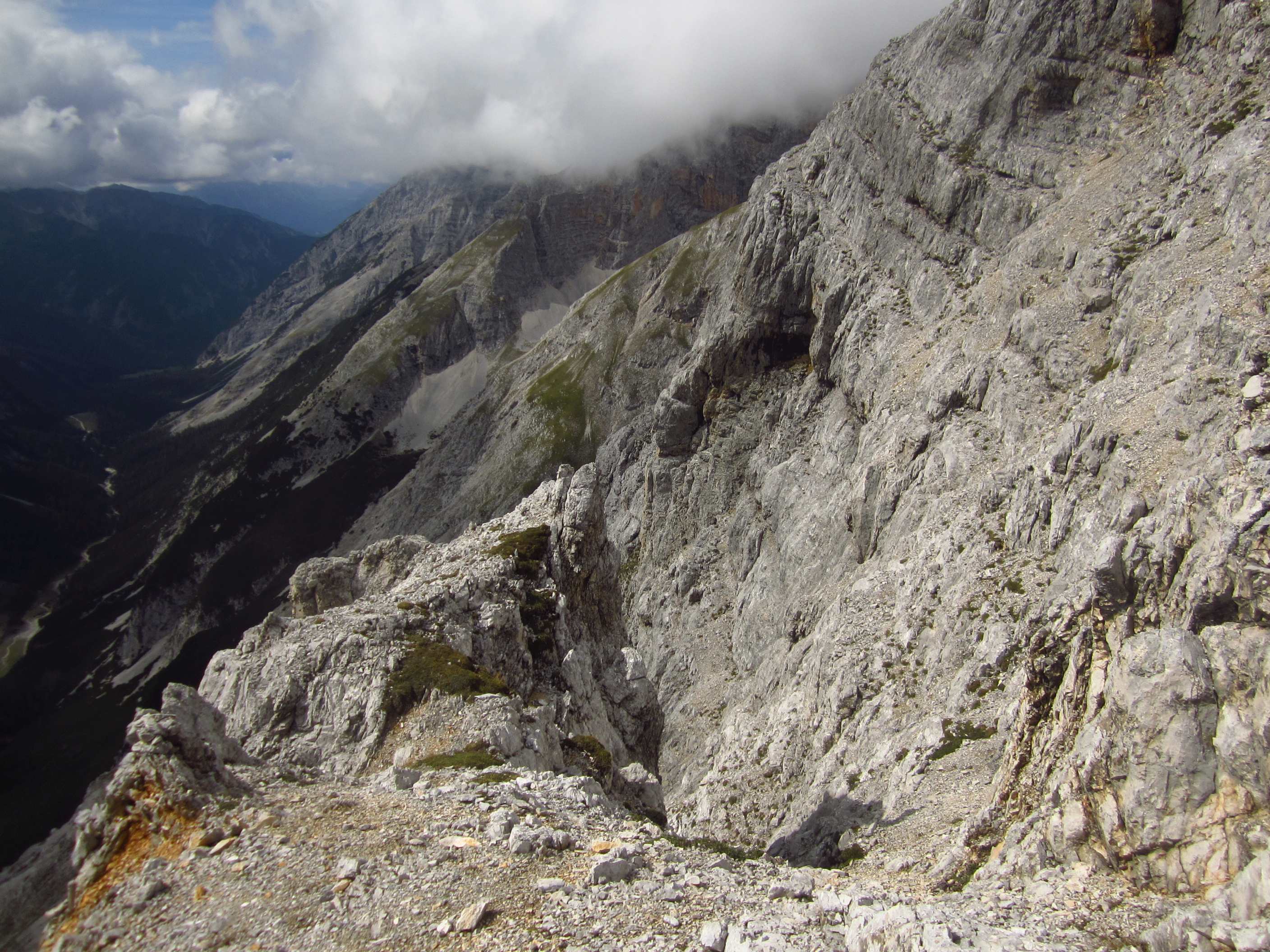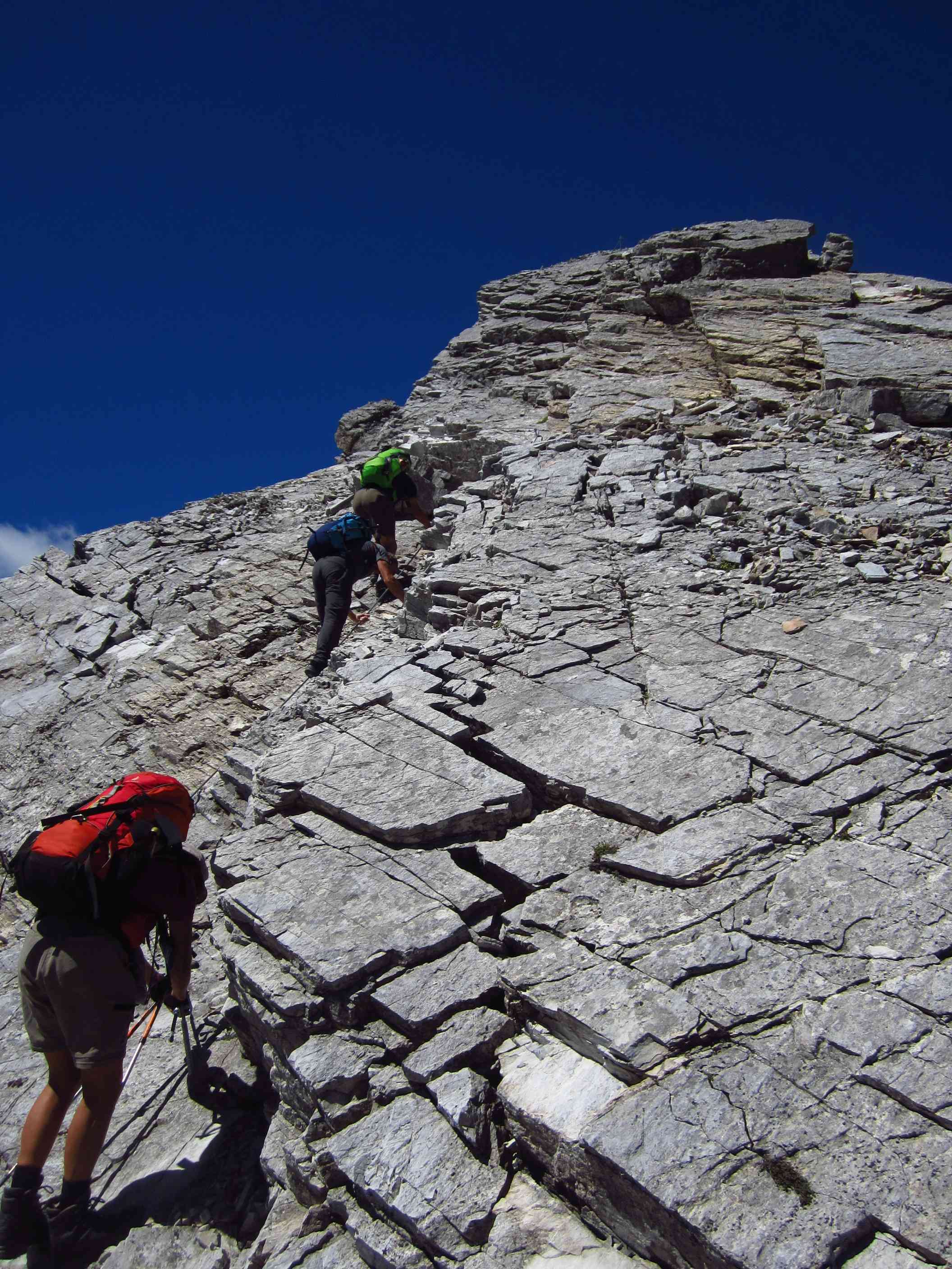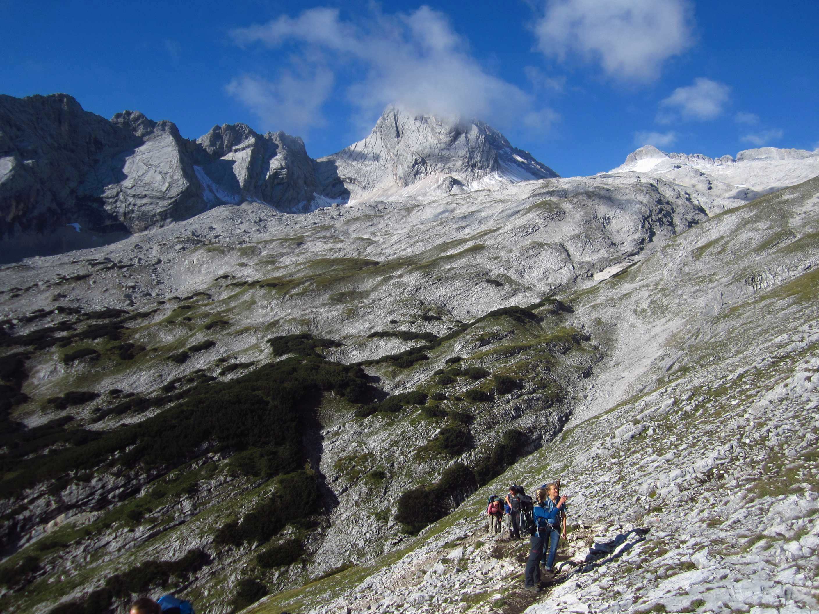 Von dort über den Schmid Huber Steig, leichte Kraxelei mit ab und zu sogar Hände benutzen hoch zur Frau Hitt. Von dort erstes Geröllfeld runter. Unterhalb des Geröllfeldes, sobald es nicht mehr so windig war, haben wir wieder Rast gemacht.