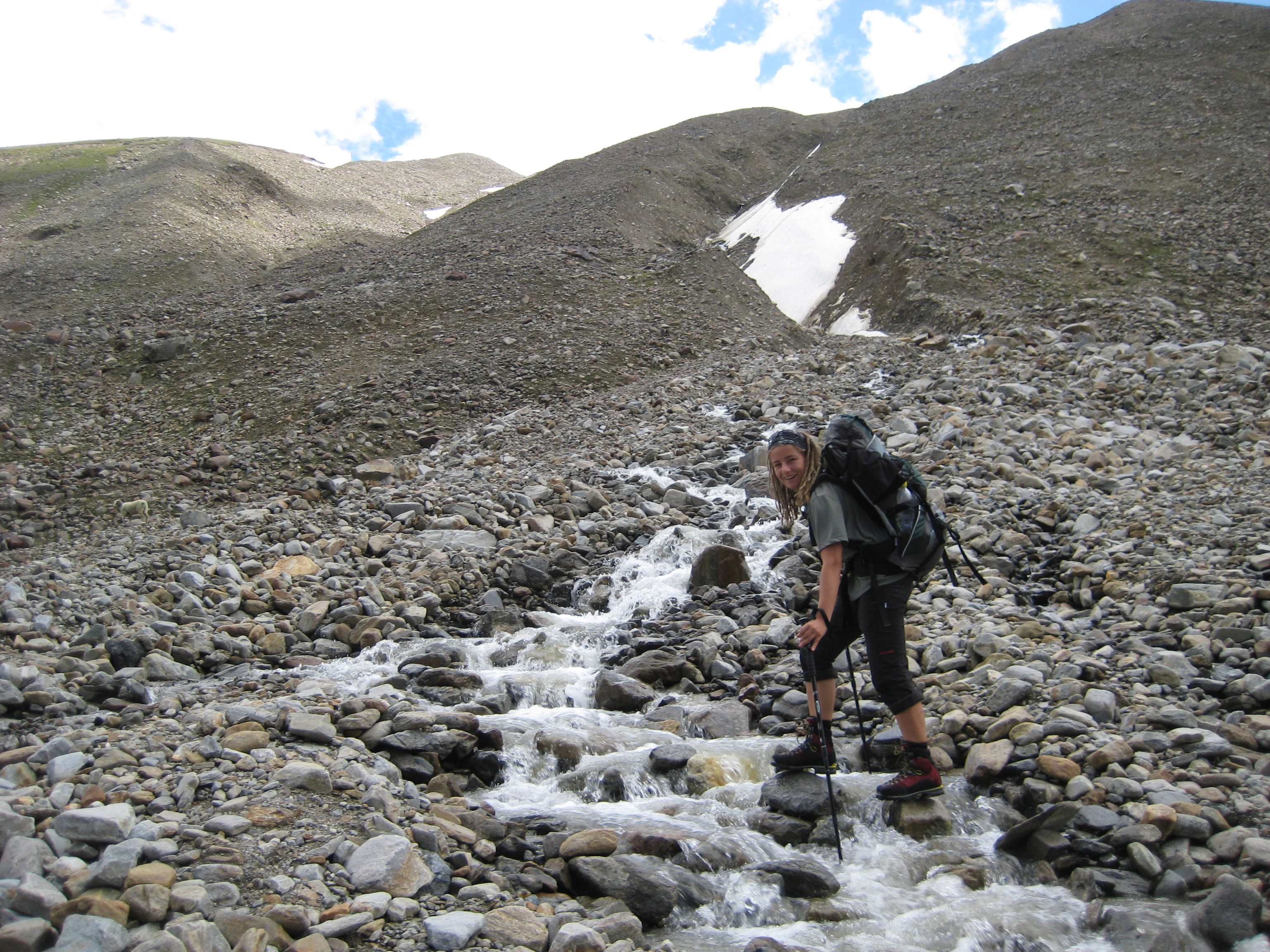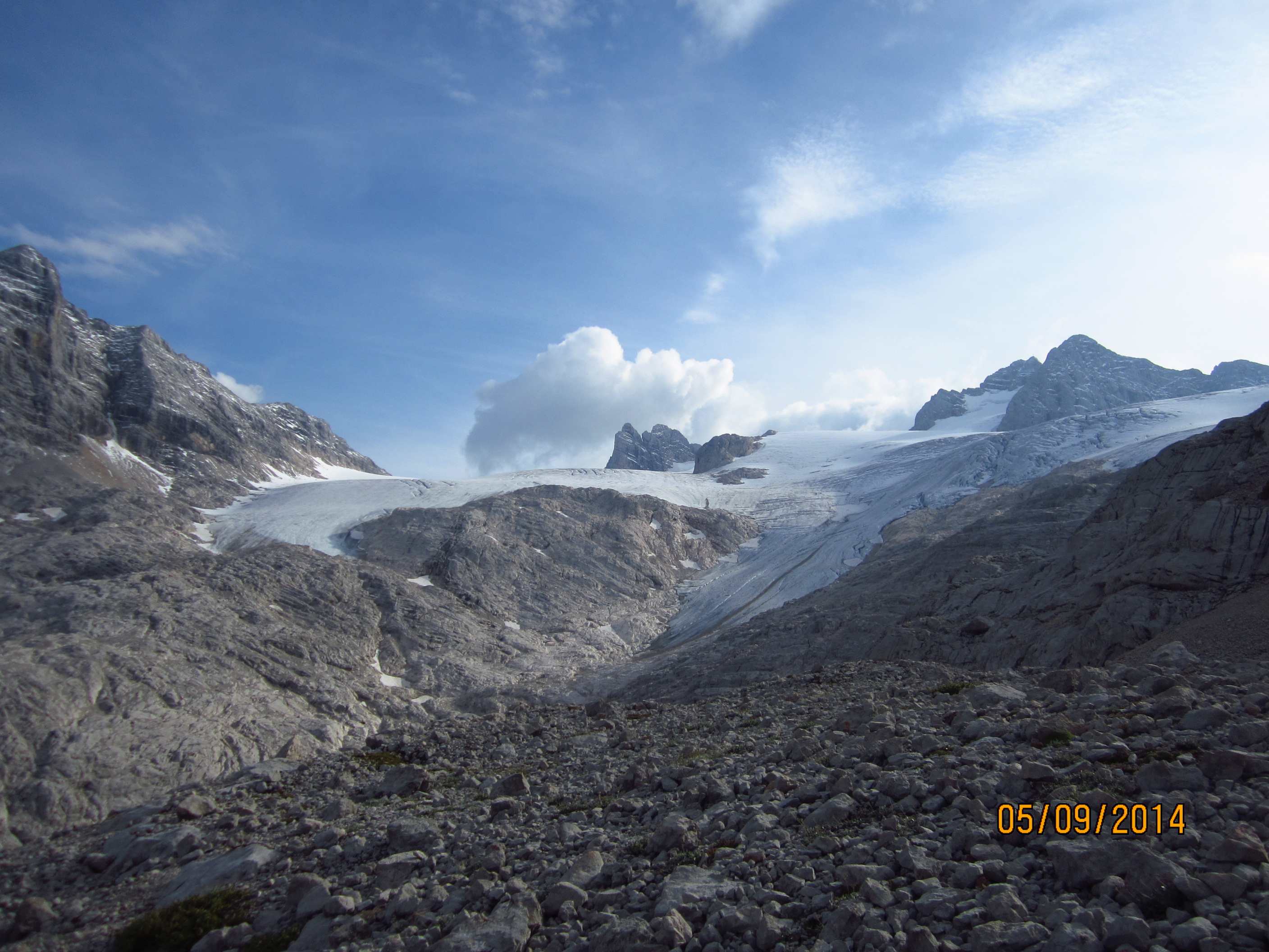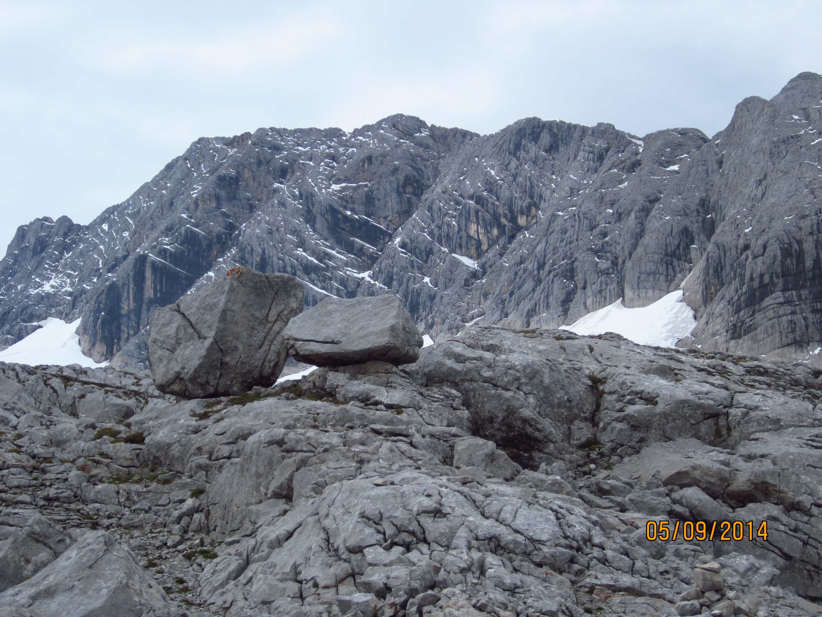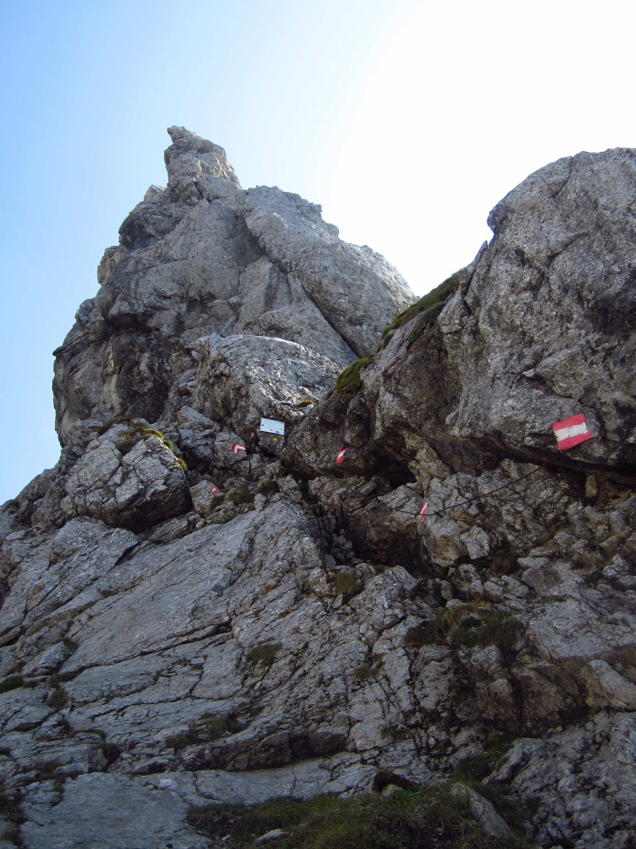 Von dort über den Schmid Huber Steig, leichte Kraxelei mit ab und zu sogar Hände benutzen hoch zur Frau Hitt. Von dort erstes Geröllfeld runter. Unterhalb des Geröllfeldes, sobald es nicht mehr so windig war, haben wir wieder Rast gemacht.