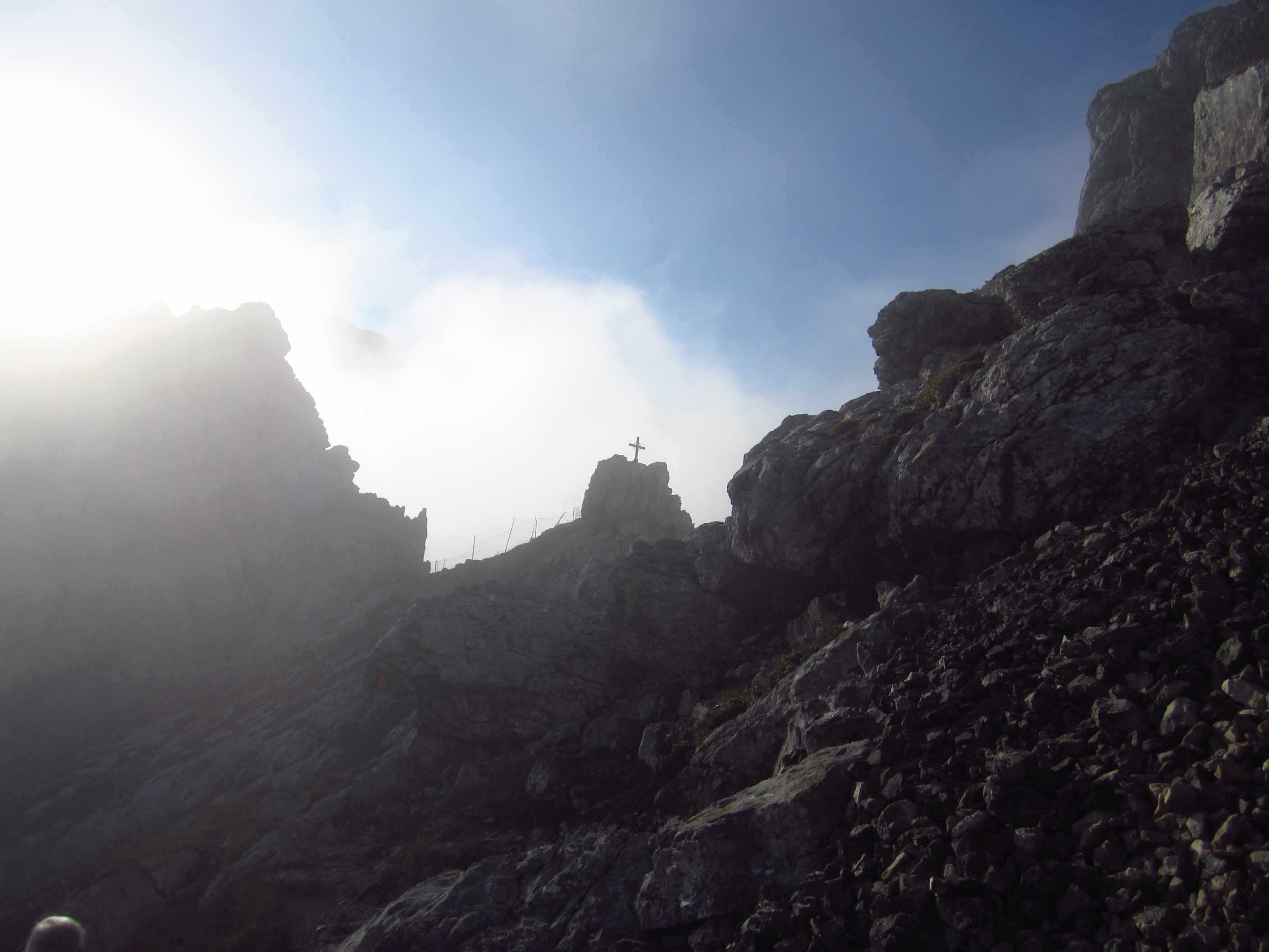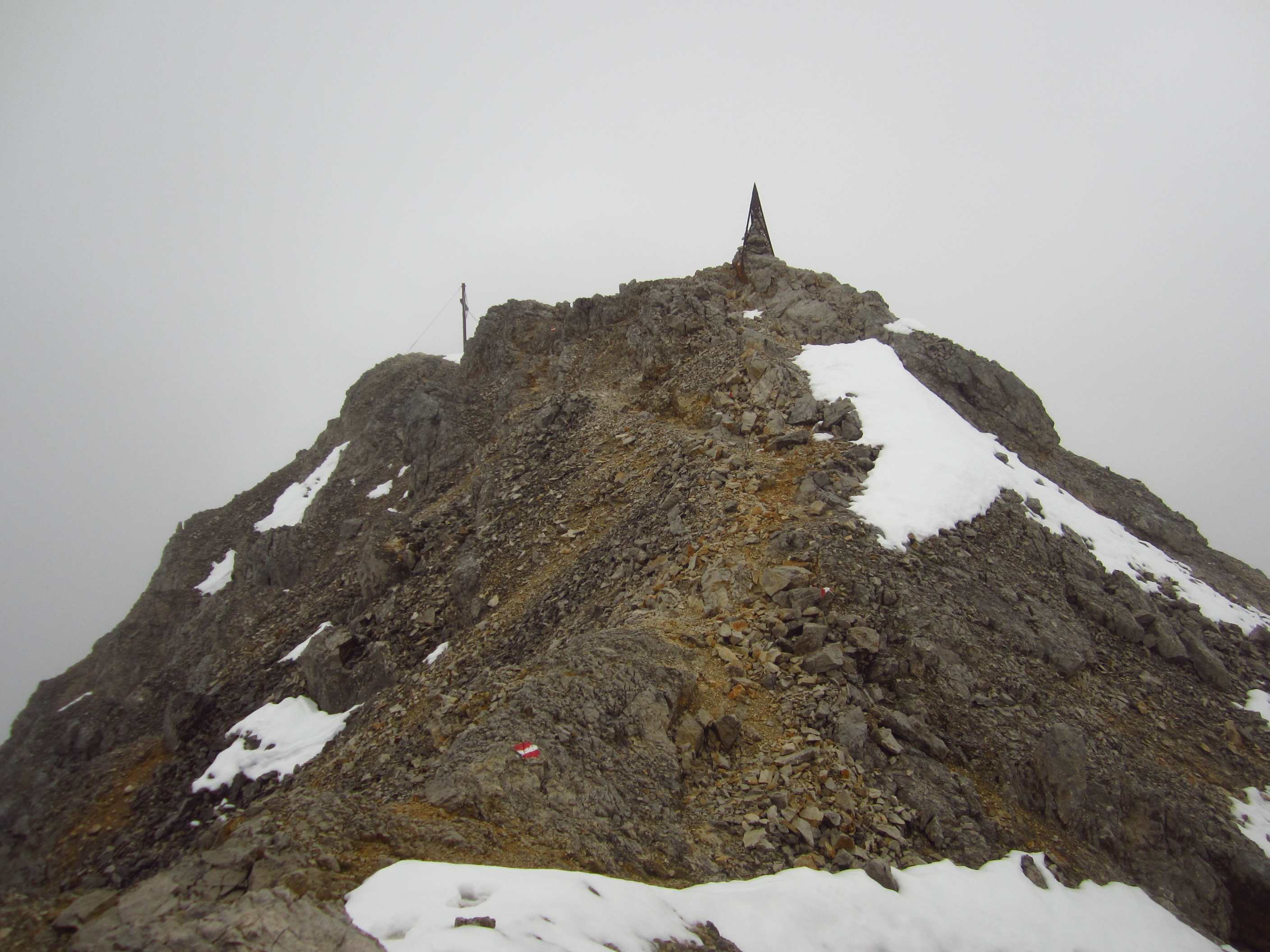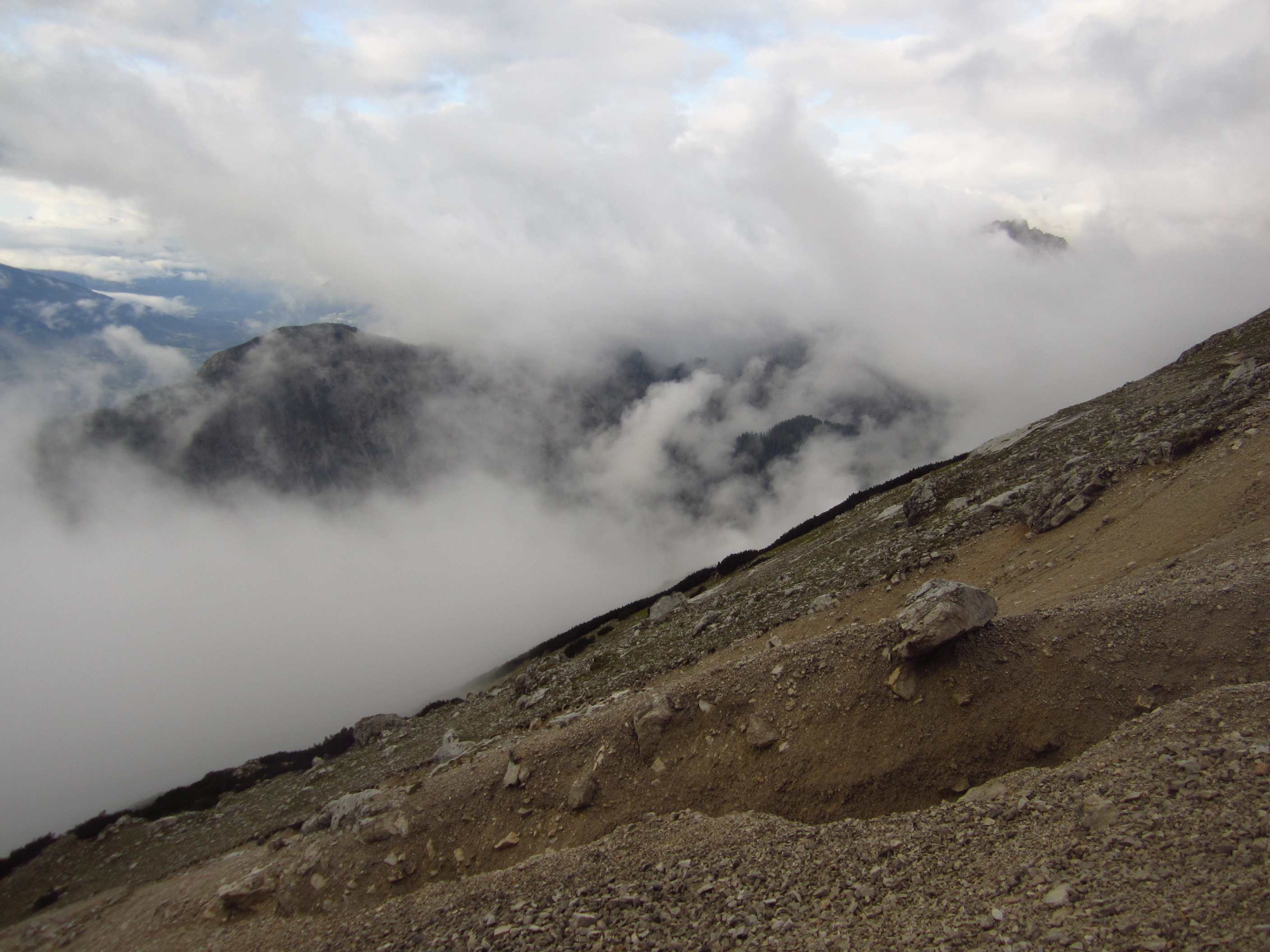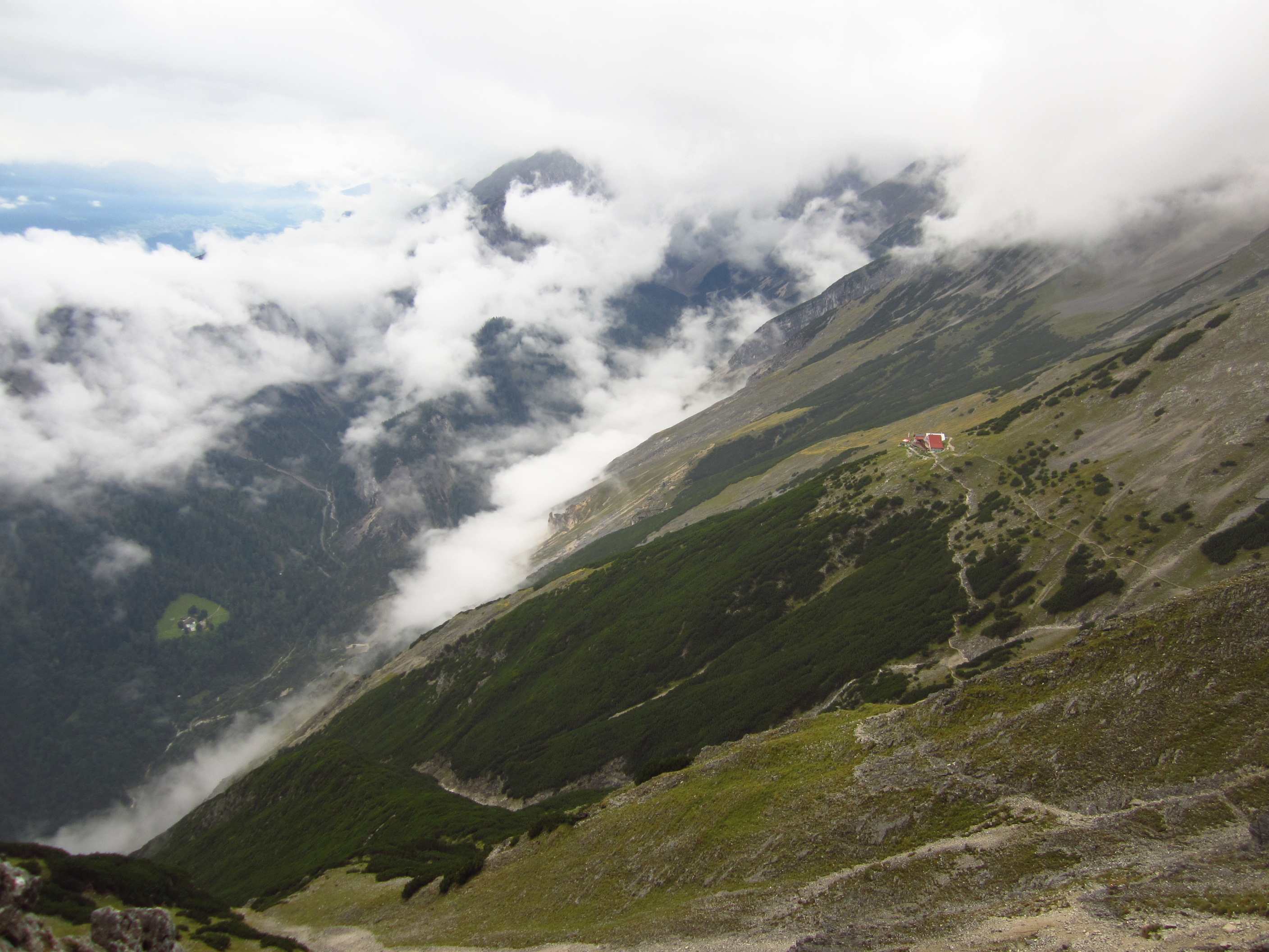 Zunächst ging es vorbei an der Hallerangerhütte, welche kurz vorher wegen Umbau/Erweiterung geschlossen wurde, dann hoch, vorbei am Metallkreuz, welches mir schon 2012 auffiel und in Erinnerung blieb weil es ohne Schild oder irgendetwas und Mitten im Hang steht, zum Lafatscher Joch. Auf dem Weg dorthin fing es an zu Regnen und am und um das Joch herum war starker Wind, die Sicht war auch nicht gut. Von dort immer am Hang entlang zur Bettelwurfhütte, eigentlich ein sehr schöner Weg, aber bei dem Wetter und keiner Sicht kein wirklicher Genuss…