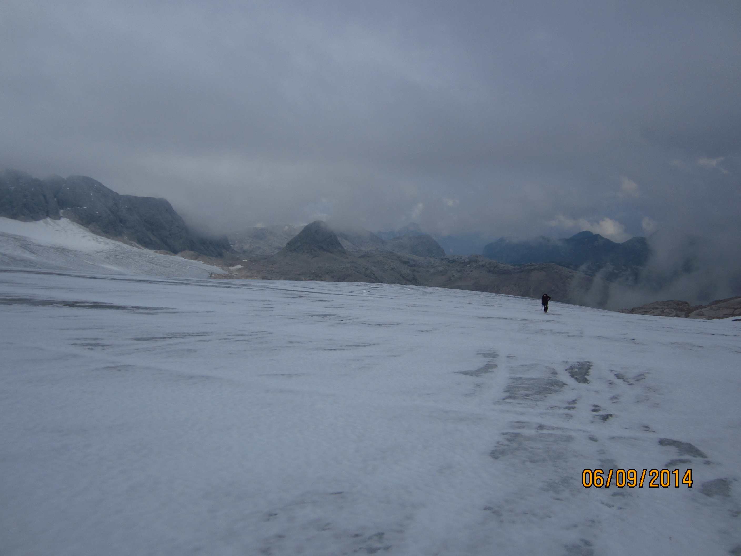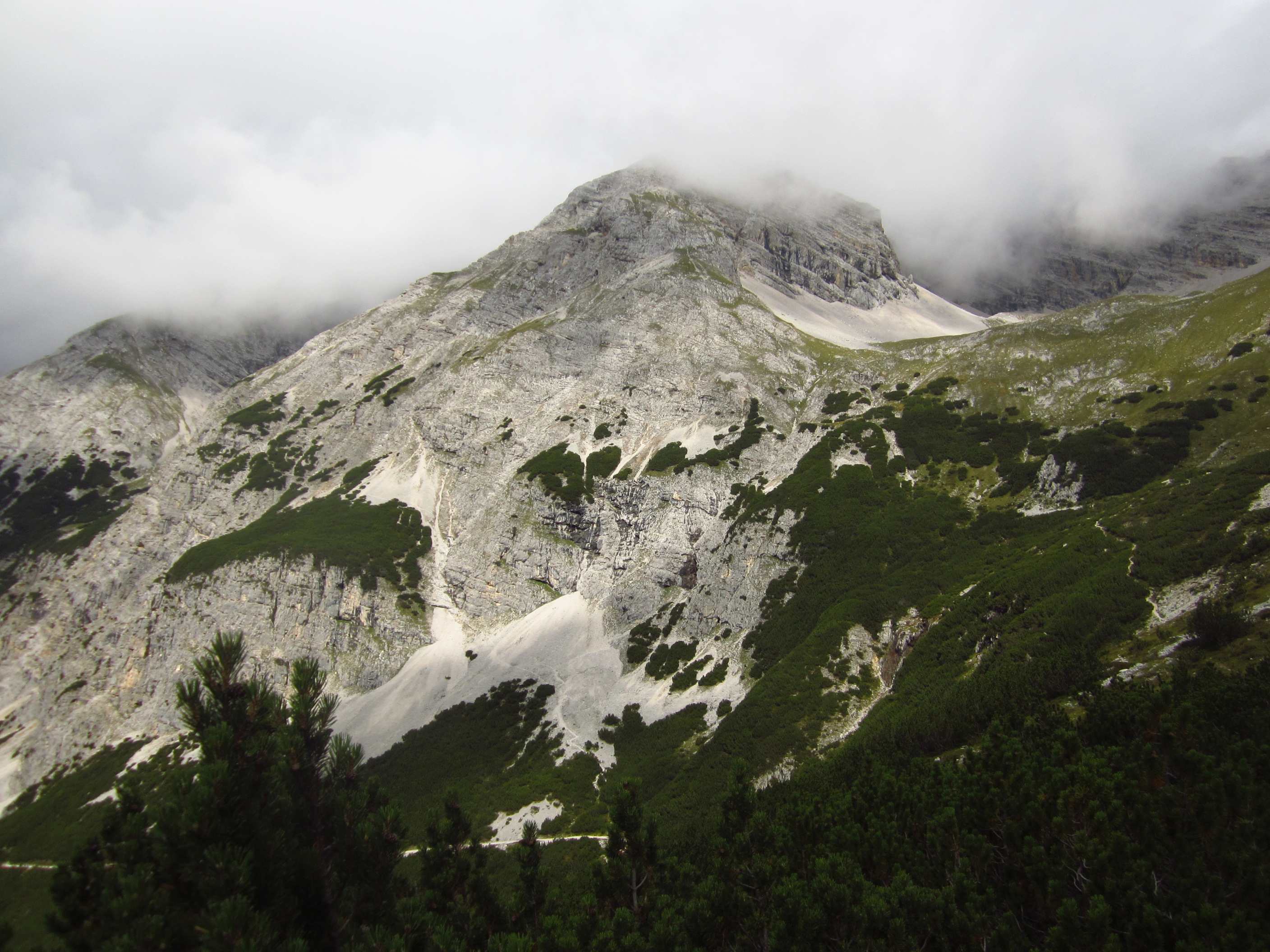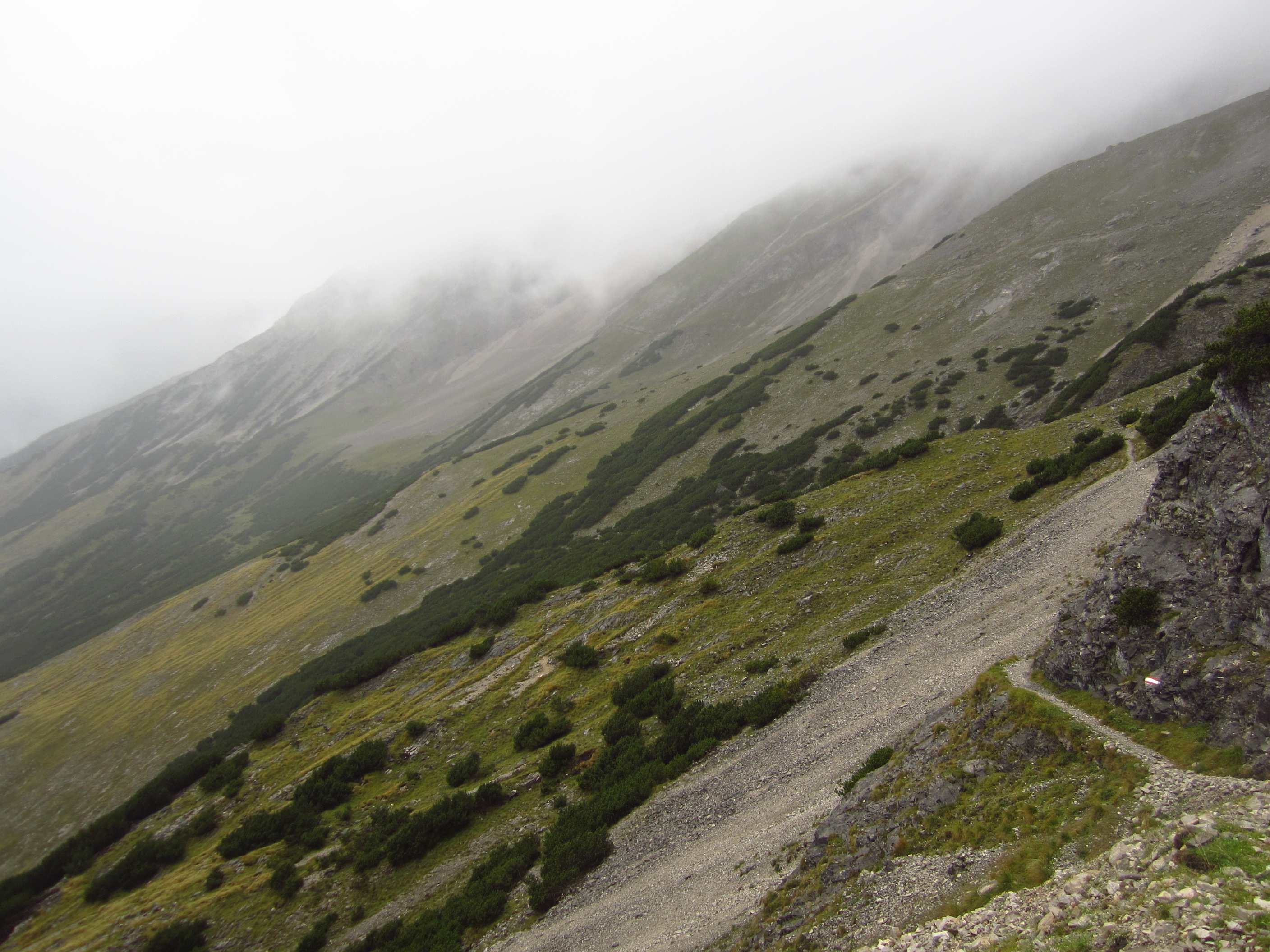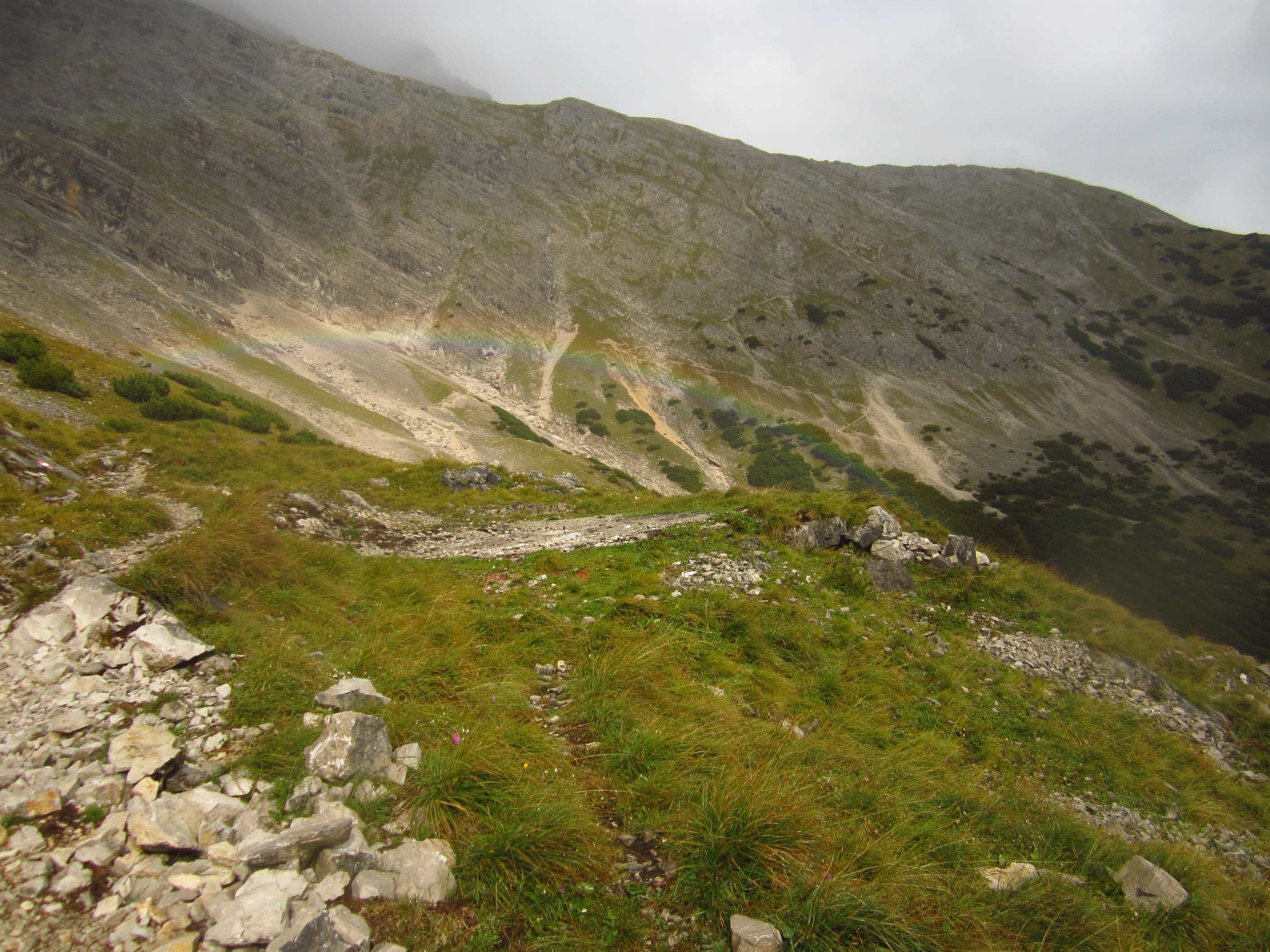 Zunächst ging es vorbei an der Hallerangerhütte, welche kurz vorher wegen Umbau/Erweiterung geschlossen wurde, dann hoch, vorbei am Metallkreuz, welches mir schon 2012 auffiel und in Erinnerung blieb weil es ohne Schild oder irgendetwas und Mitten im Hang steht, zum Lafatscher Joch. Auf dem Weg dorthin fing es an zu Regnen und am und um das Joch herum war starker Wind, die Sicht war auch nicht gut. Von dort immer am Hang entlang zur Bettelwurfhütte, eigentlich ein sehr schöner Weg, aber bei dem Wetter und keiner Sicht kein wirklicher Genuss…