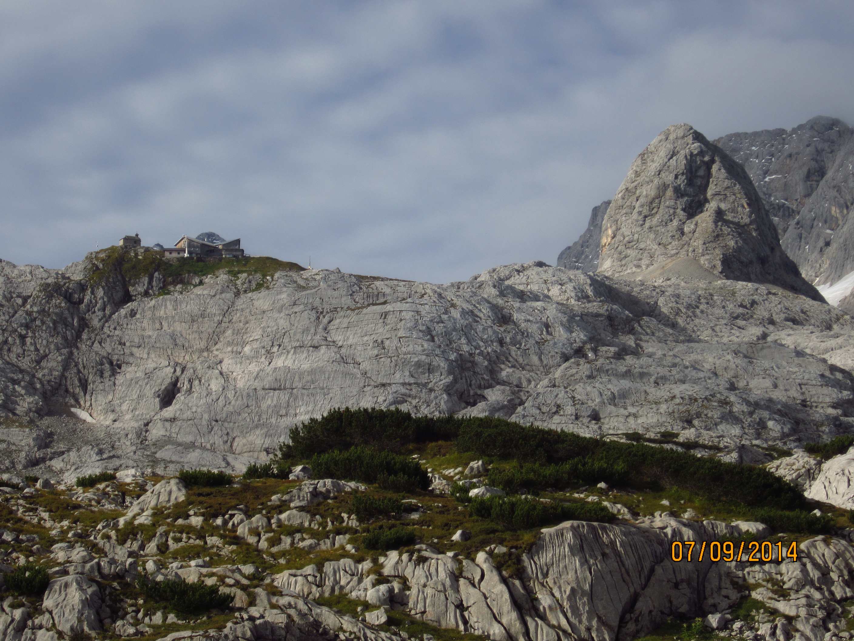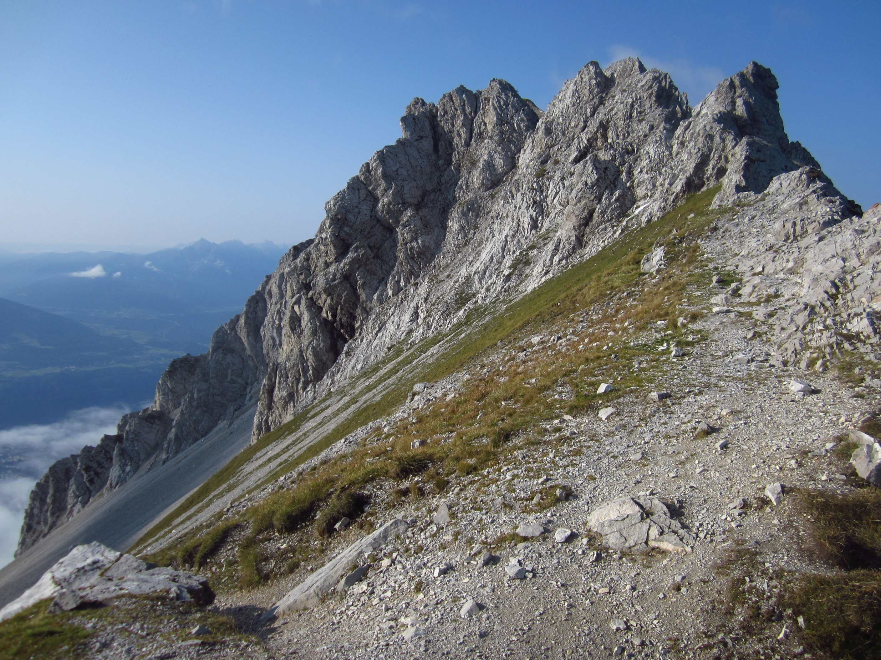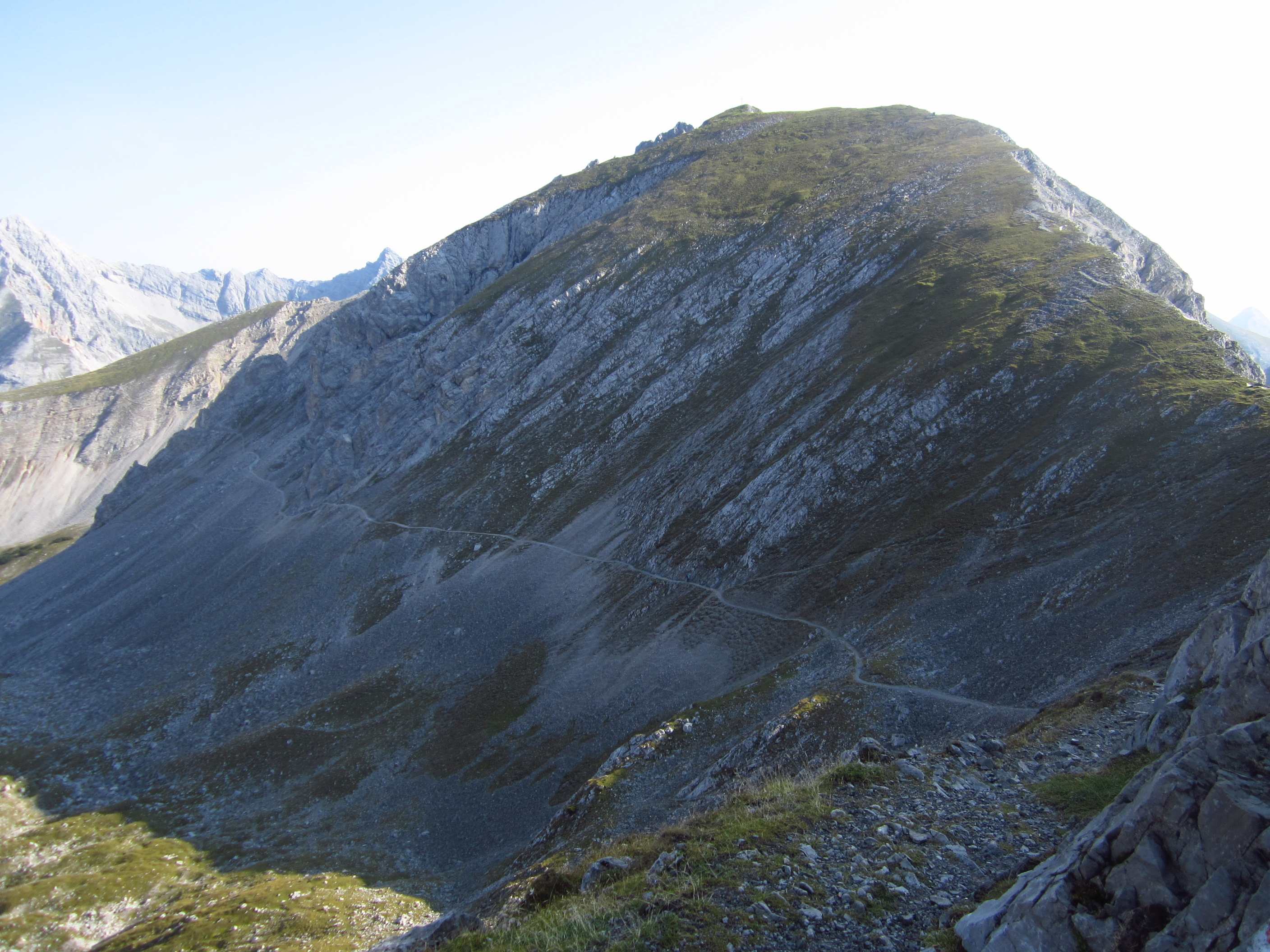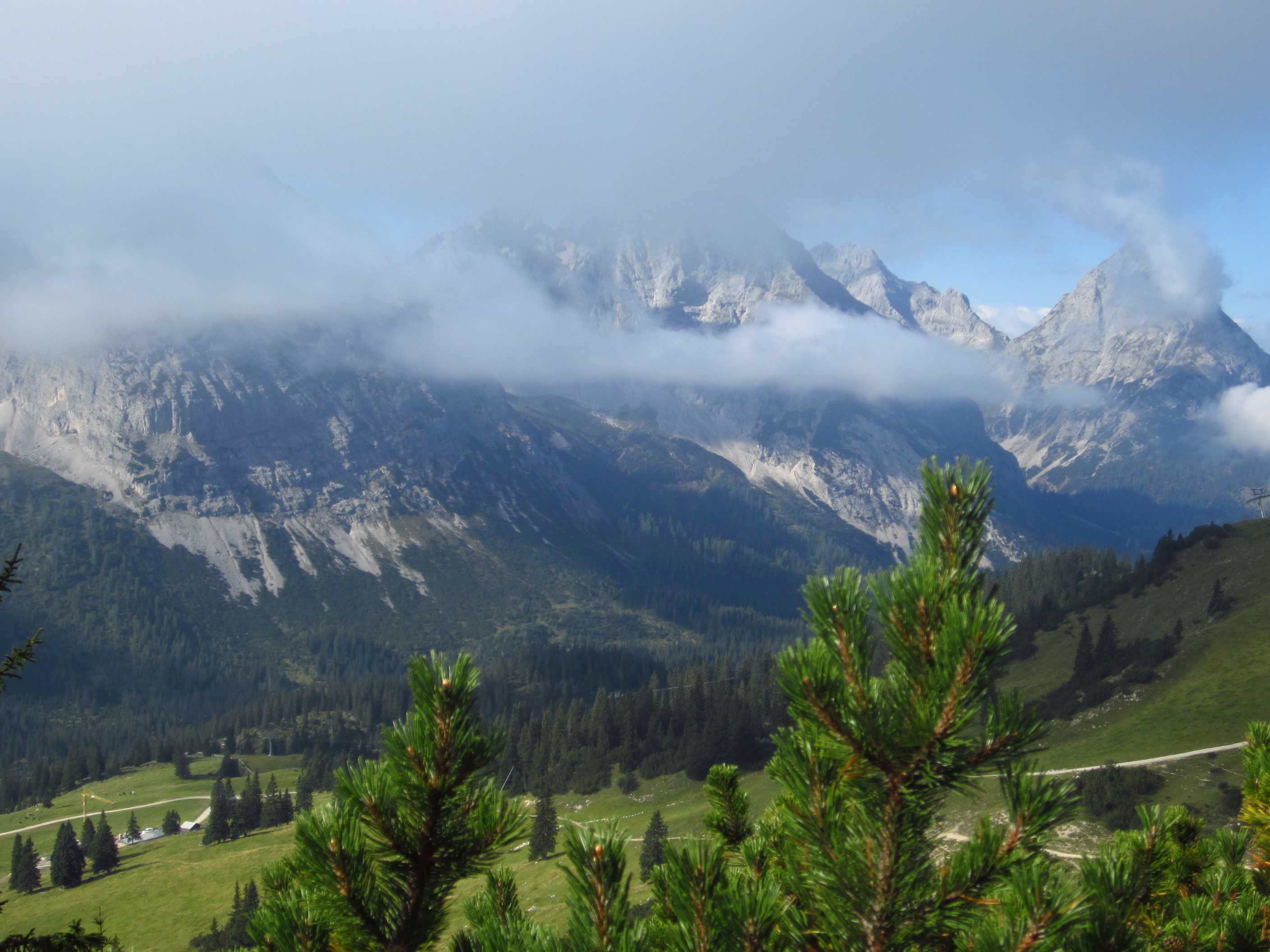 Nach einem für eine Hütte beeindruckenden Frühstücksbuffet ging es von der Hütte auf Bergpfad hinauf zur Mandelscharte, dann Weg an der Wand entlang mit Blick auf die Zugspitze und zum nächsten unbenannten Übergang auf die andere Hangseite, dann auf Bergpfad Wiesenhänge entlang und an Schafen vorbei zur Seilbahnstation Seegrube, dort haben wir kurz Pinkelpause gemacht.