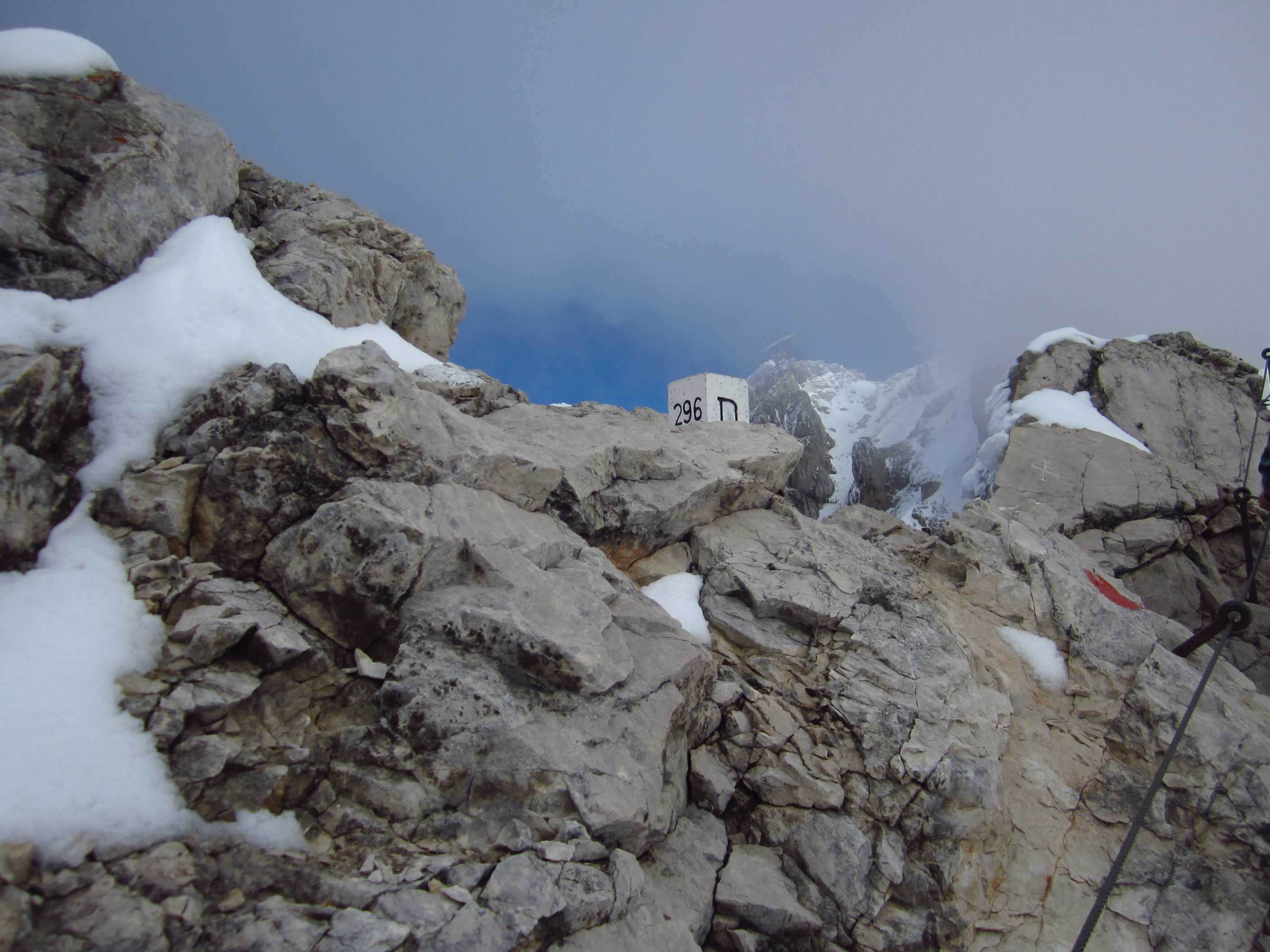 Angekommen am Bettlwurfhaus, haben wir erstmal alle Sachen zum Trocknen über den Ofen gehängt und uns eingerichtet. Dann haben wir uns selbst am Ofen aufgewärmt weil wir ziemlich durchgefroren waren… Wir haben überlegt, den Nachmittag auf der Hütte zu bleiben oder zumindest noch den leichten Klettersteig zum großen Bettelwurf zu machen. Der schwerere Klettersteig zum kleinen Bettelwurf wäre bei dem Wetter nicht sinnvoll gewesen und hätte auch bestimmt keinen Spaß gemacht. Auch weil es aufgehört hatte zu regnen sind wir los gezogen zum großen Bettelwurf. Zwar hat es wieder angefangen zu regnen, aber es war trotzdem eine schöne und lustige Kraxelei. Am Gipfel hatten wir dann sogar noch etwas Schnee, aber keine Aussicht wegen den Wolken.