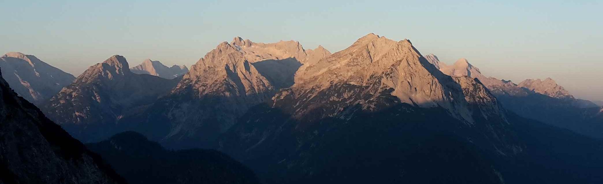 Morgens um kurz vor 6 brach ich im Dunkeln mit Stirnlampe auf. Der Weg ging steil nach oben durch den Wald, und als die Sonne so langsam hervorkam war ich bereits ein Stück jenseits der Mittenwalder Hütte und hatte einen tollen Blick zum Zugspitzmassiv.