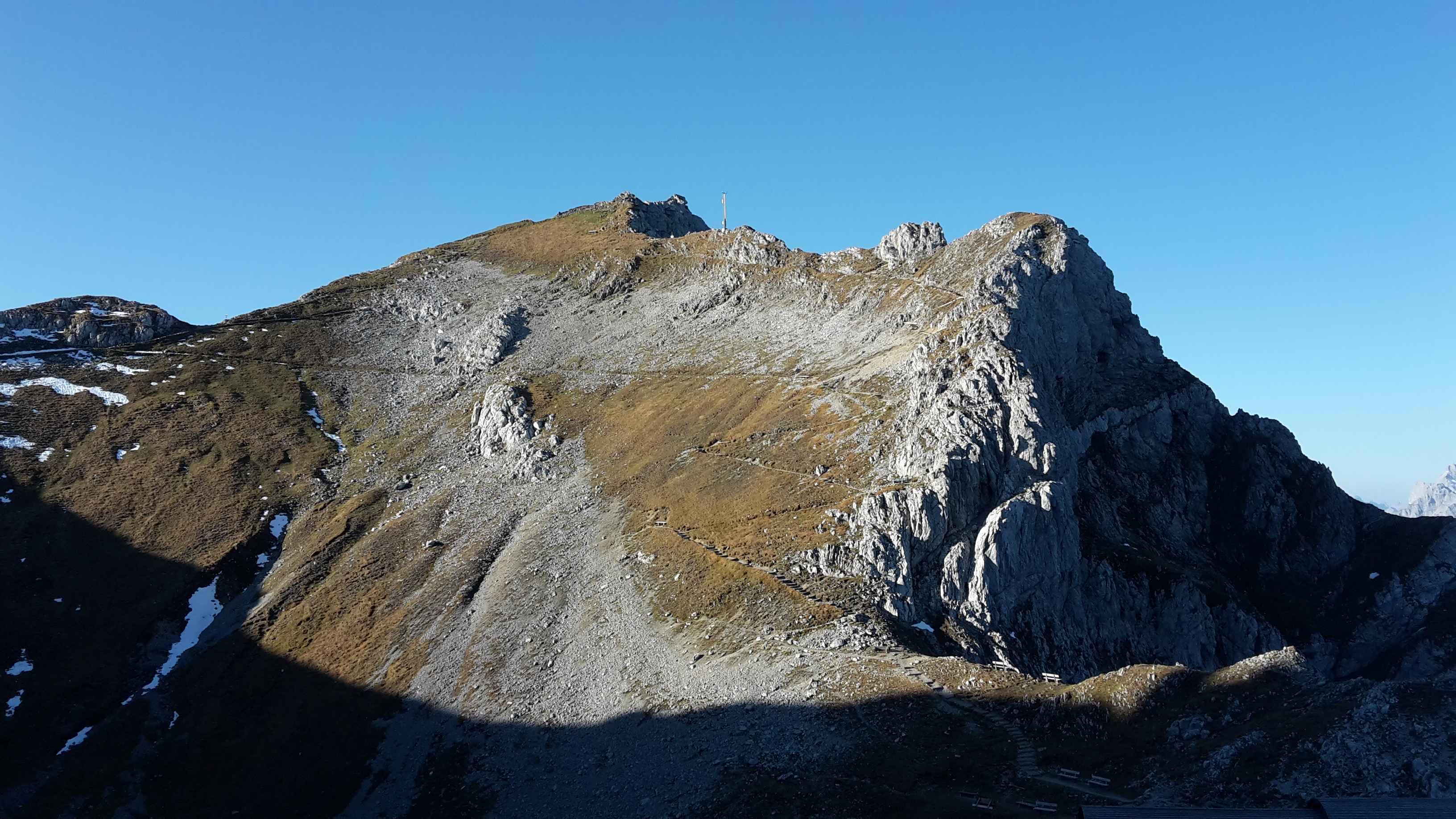 Danach ging es steinig weiter mit einigen ganz leichten Kletterstellen unterhalb der Seilbahn entlang. An der Bergstation der Seilbahn angekommen erkundigte ich mich, ob die Bahn heute weiter fahren würde, da es recht windig war. Sie bestätigten es mir, und ich machte mich auf den Weg zum Gipfel.