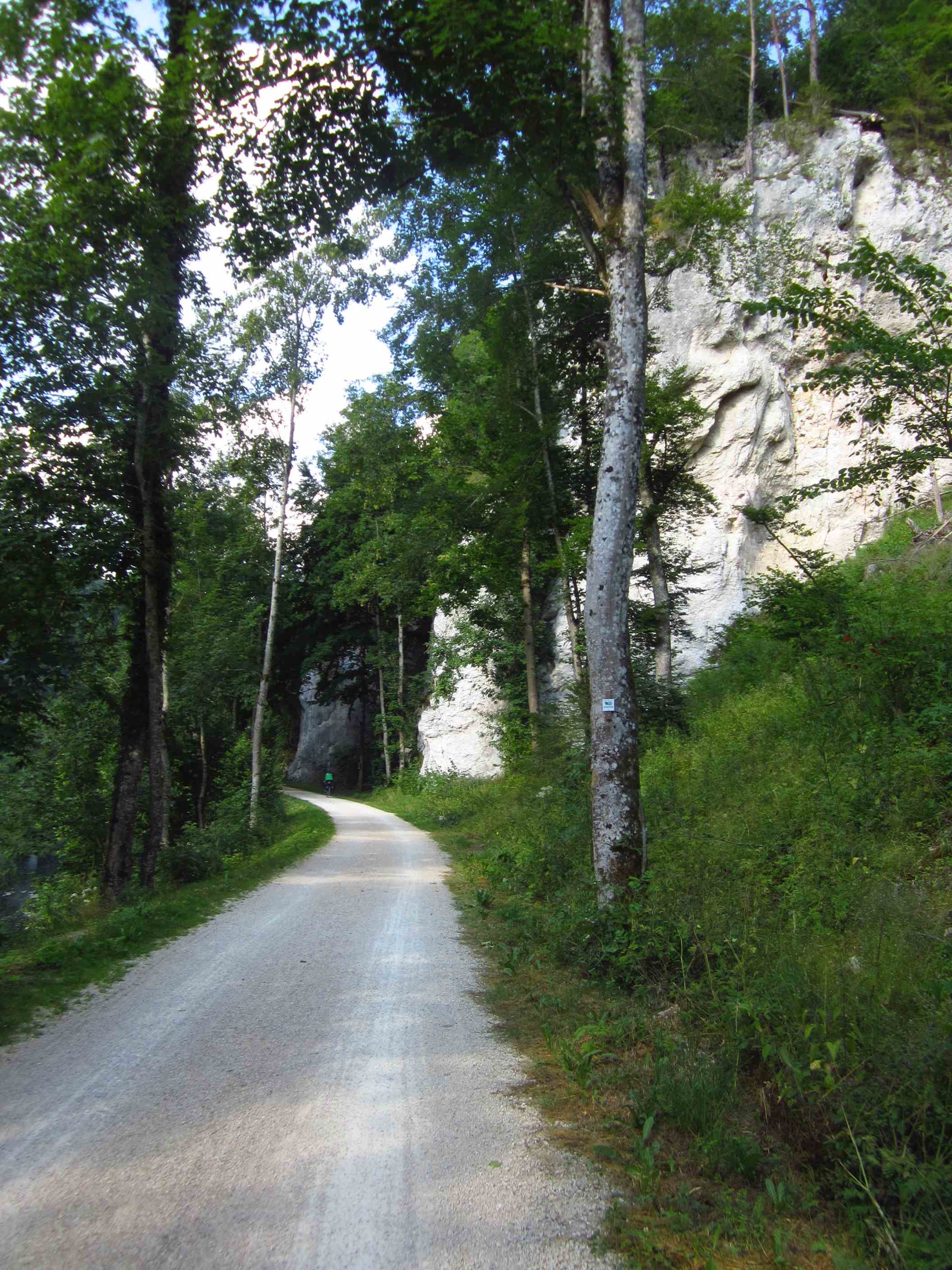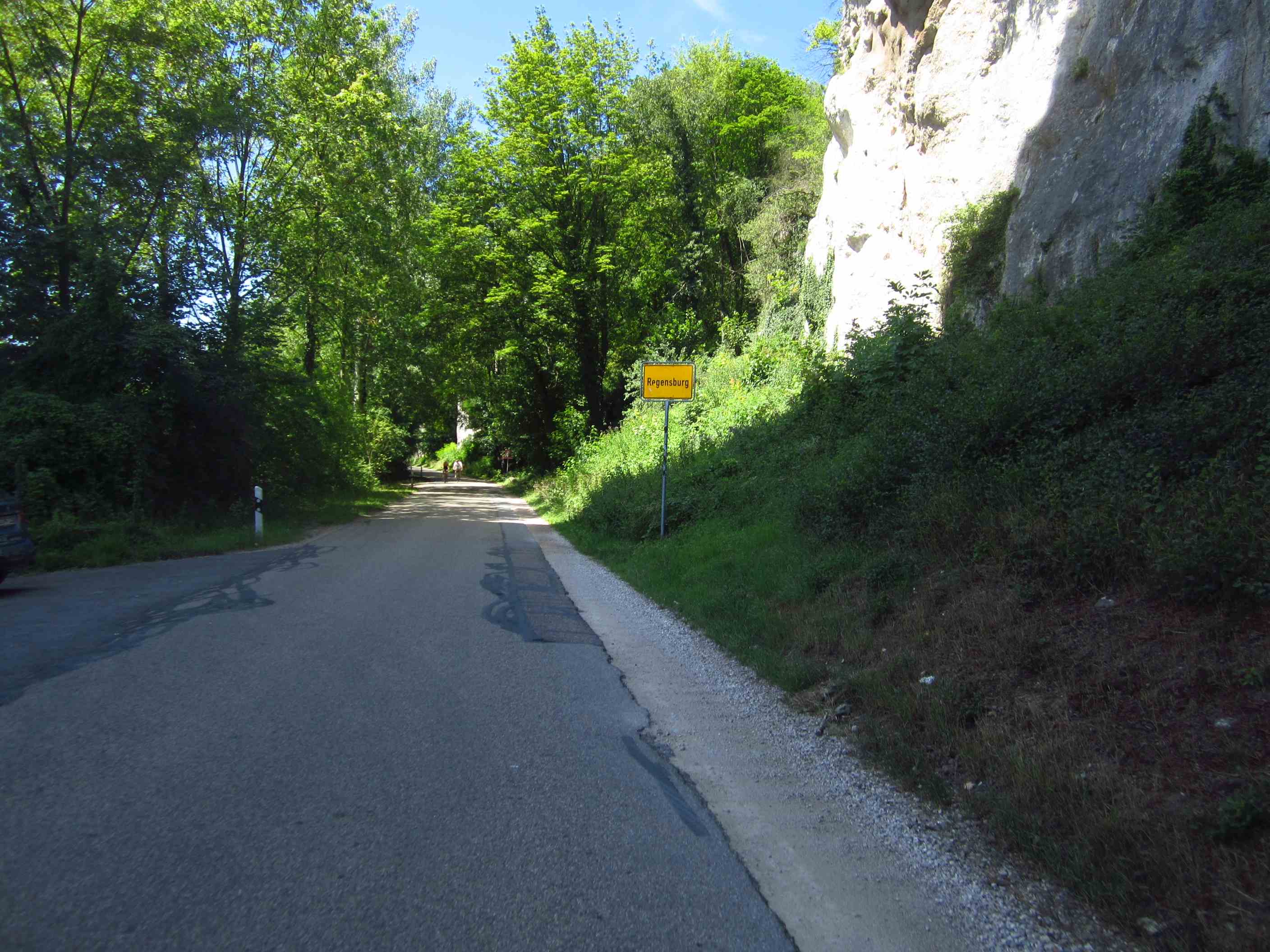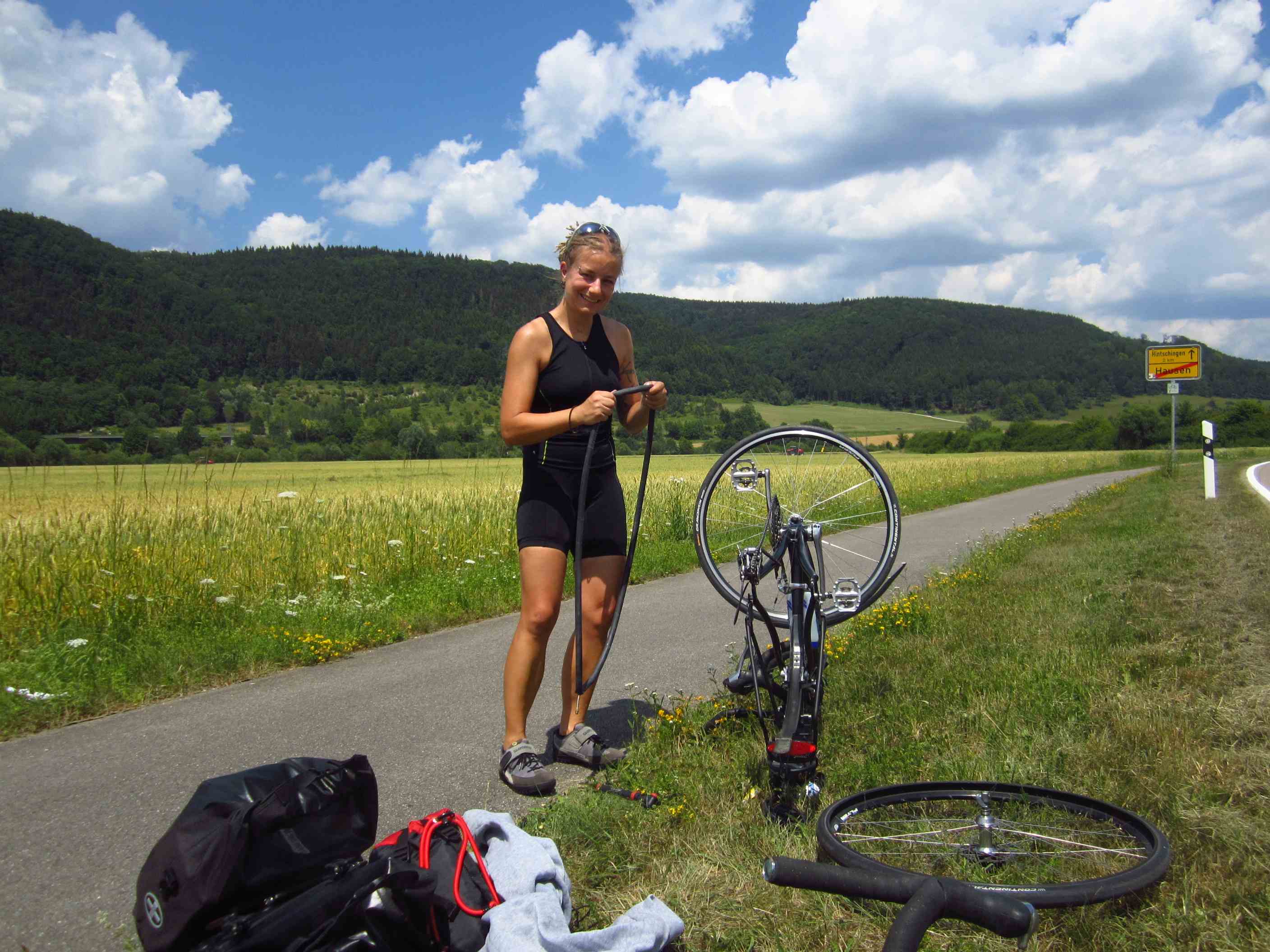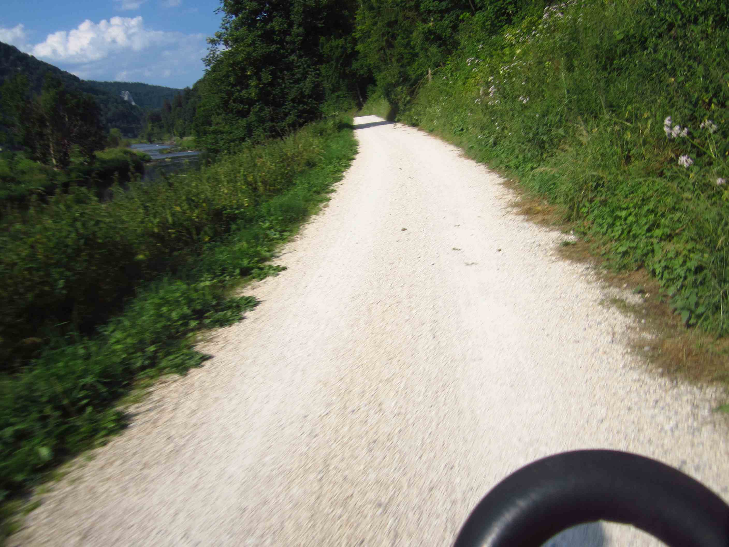 Prompt fuhr ich mir hier ziemlich genau bei Kilometer 20 den ersten Plattfuß – das ging ja gut los, dennoch mußten wir beide lachen. Viele Leute hielten an und fragten, ob wir alles hätten oder sie helfen könnten – das war schon echt ein schöner Anfang. Der Schlauch war blad geflickt und so konnte es weitergehen. Die Strecke heute beinhaltete doch einiges an Höhen, teilweise auch auf Schotterwegen, wofür unsere Räder natürlich nicht ganz gemacht sind, aber es ließ sich alles fahren – das Tal, durch das es ging, war sehr idyllisch, viele Felsen rechts und links, insgesamt ein toller Weg und Tag. Um 19:15 Uhr erreichten wir den Zeltplatz in Sigmaringen – natürlich den bei 90km, somit hatten wir schon 20 gut.