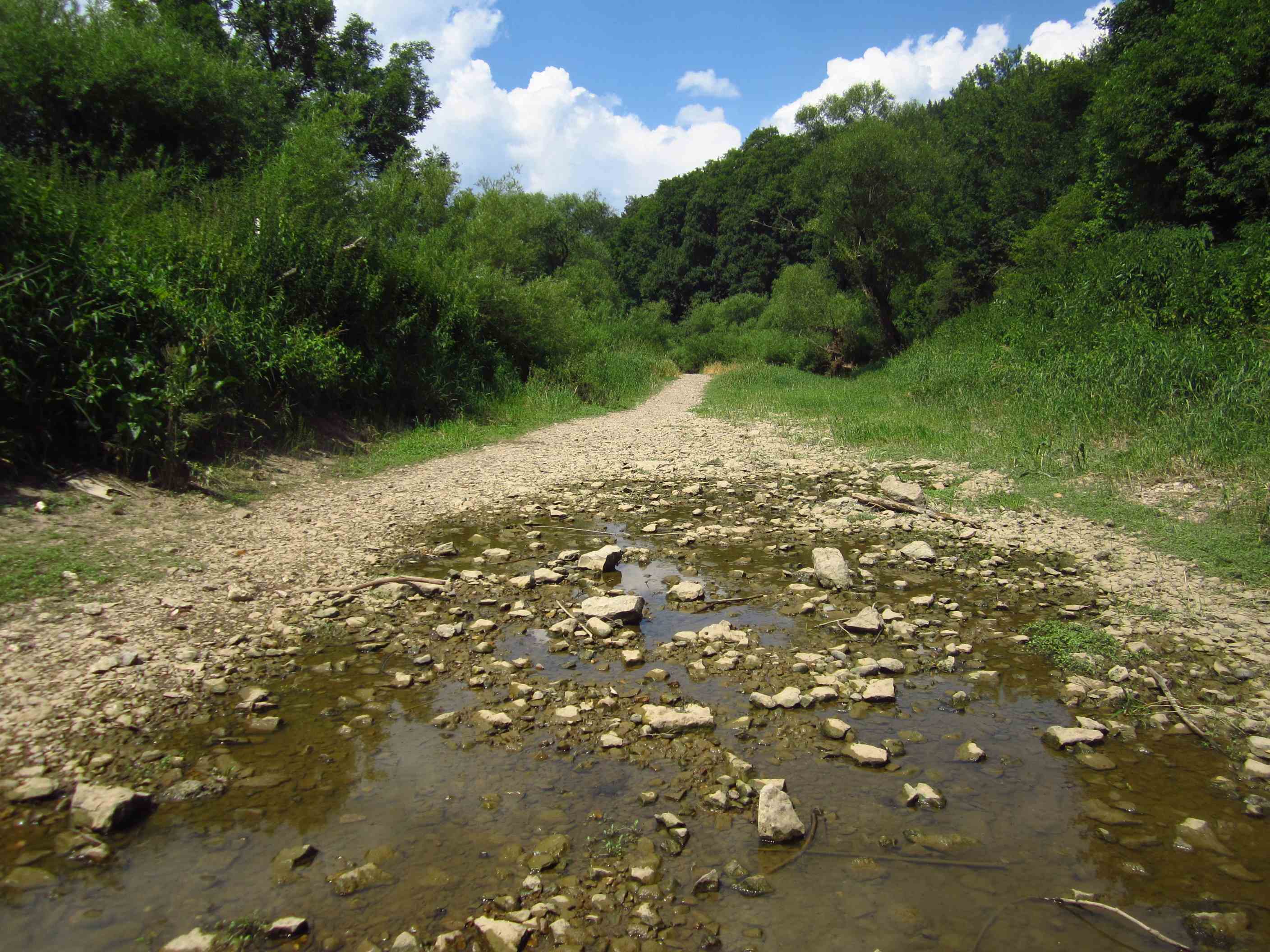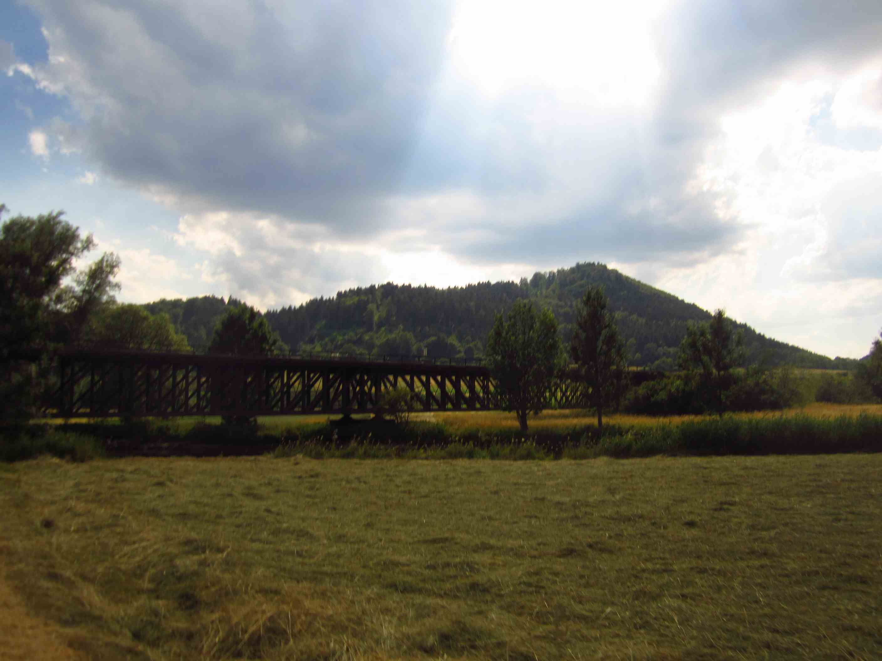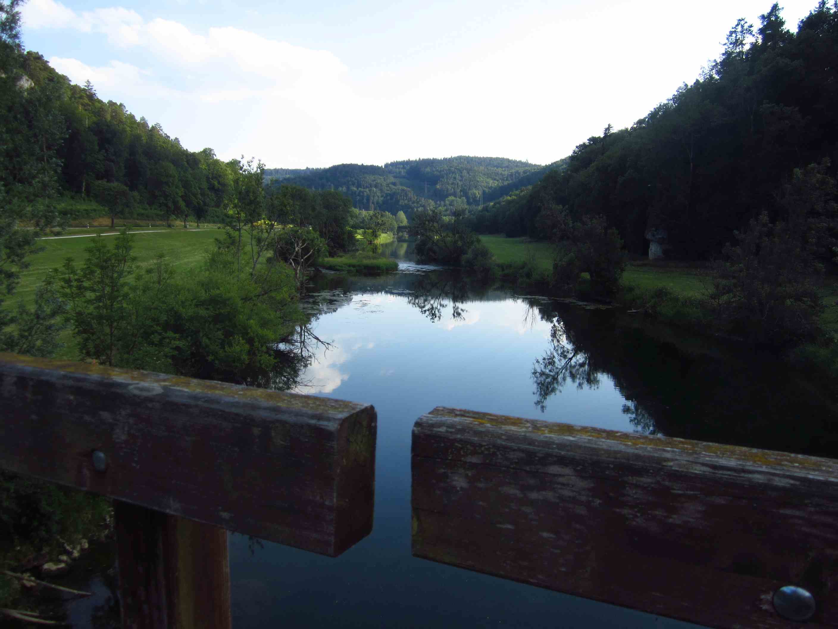 Um 6:53 Uhr ging unser Zug in Forchheim ab, das hieß um halb 6 aufstehen. Mit dreimal umsteigen kamen wir um kurz vor 13:00 Uhr relativ pünktlich in Donaueschingen an. Die Sonne strahlte, es war angenehm warm, aber ein bißchen bewölkt. Wir fuhren als erstes zur Donauquelle, die nicht weit vom Bahnhof entfernt ist, um hier zu starten. Wir hatten uns für den ersten Abend drei Zeltplätze ausgeguckt, einer bei 70, 80 und 90km. 135km im Schnitt pro Tag waren Pflicht, also sollte es heute Nachmittag doch mindestens die Hälfte einer Tagesetappe werden. Es wehte ein leichter aber nicht zu verachtender Gegenwind, dennoch starteten wir gut bis in knapp 20km eine Umleitung kam, die wir nehmen mußten.