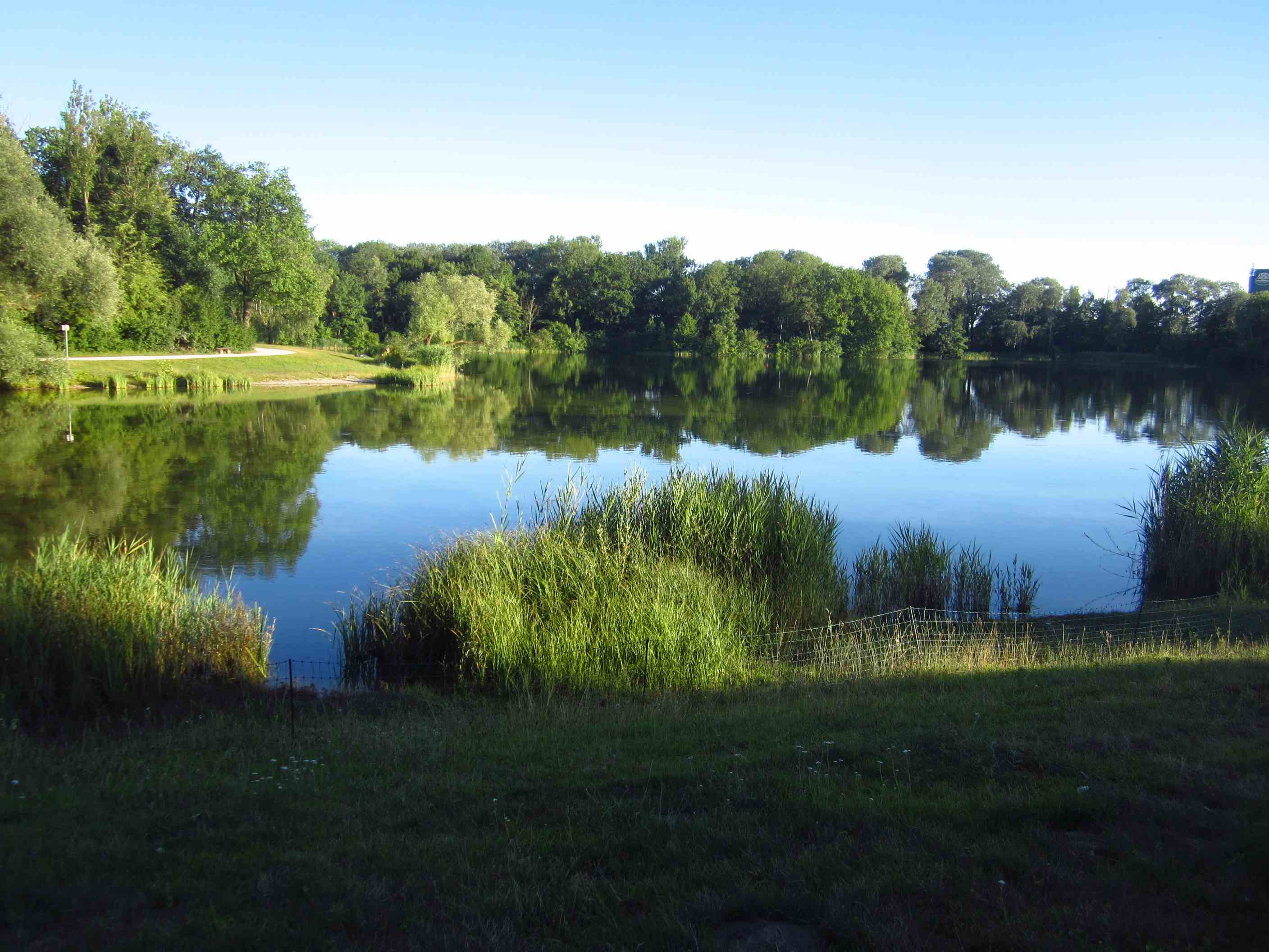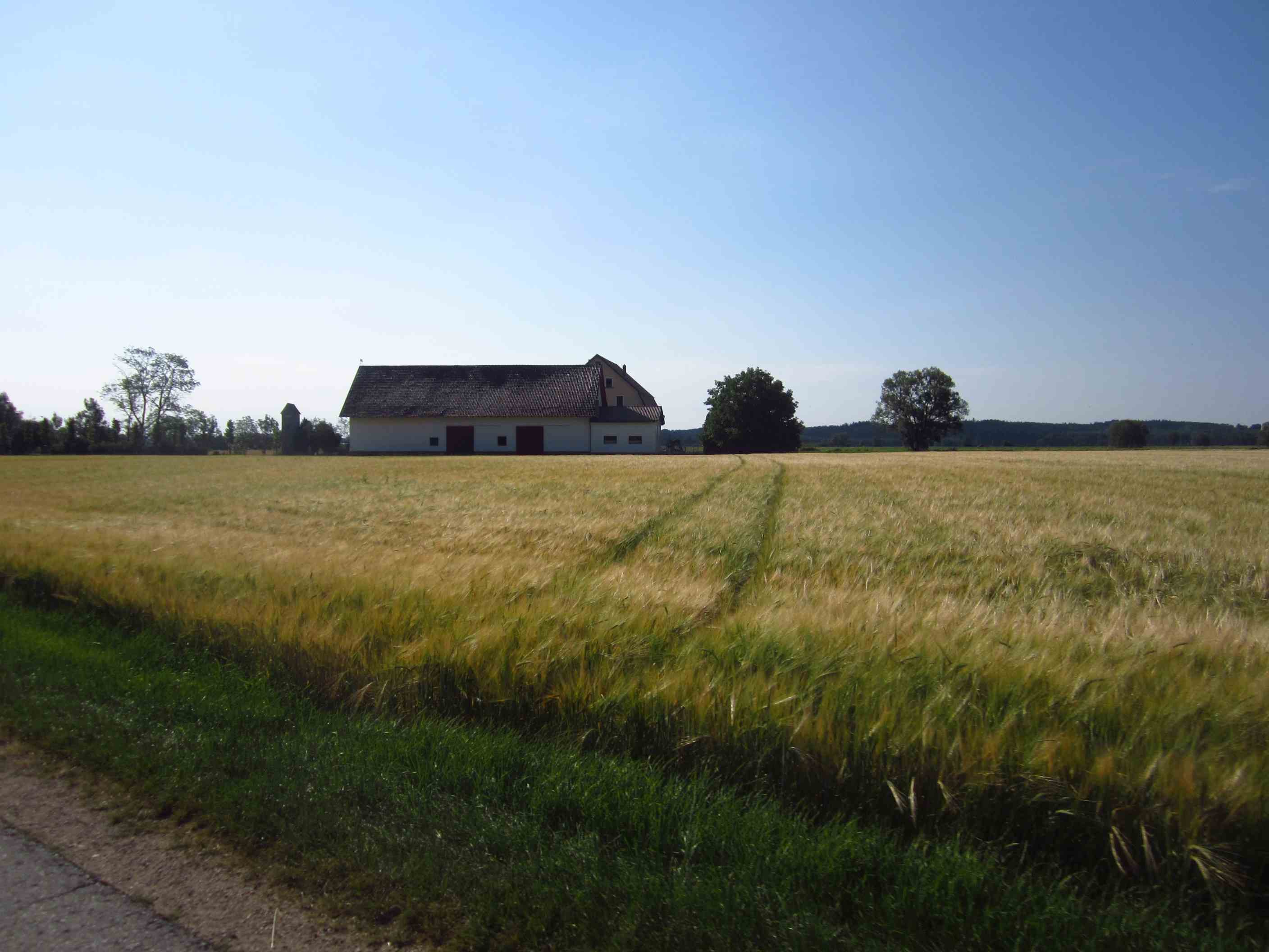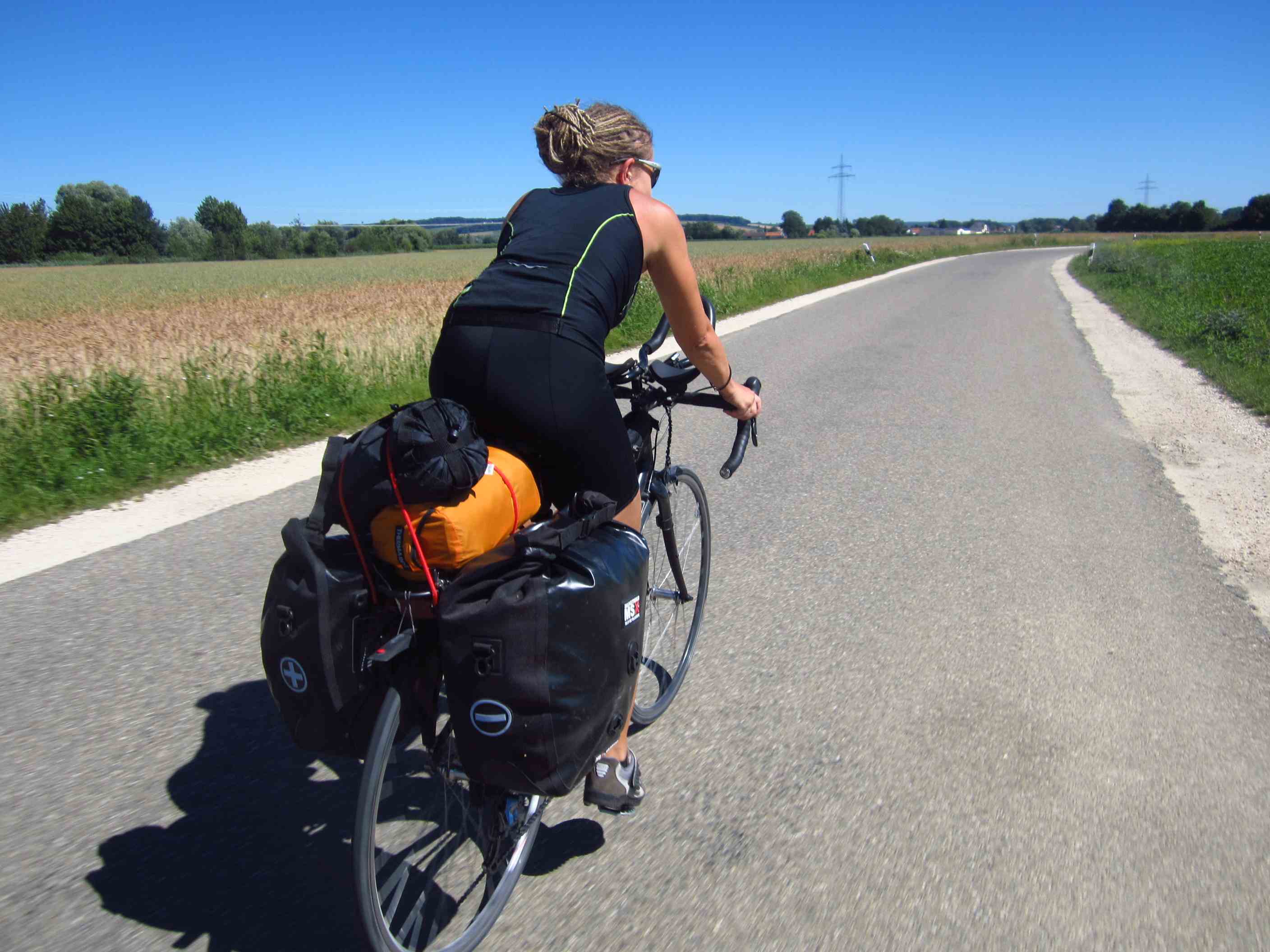 Auch früh war es feucht und kühl. Wir standen schon um halb 7 auf und starteten so gegen halb 8. Diesmal sind wir den Schotterwegen ein bißchen ausgewichen. Es gab einige starke Steigungen, der Wind kam wieder entgegen den ganzen Tag, es war keine Wolke am Himmel. Heute führten wir ein zweites Frühstück ein, Mittag gab es dann erst nach knapp 100km in Neuburg. Dort gingen wir noch einkaufen und fuhren anschließend die letzten Kilometer bis nach Ingolstadt – 124km gesamt für heute. Der Zeltplatz lag an einem See, und wir wuschen Wäsche und haben dann den Abend auf einem Steg im Sonnenuntergang genossen.