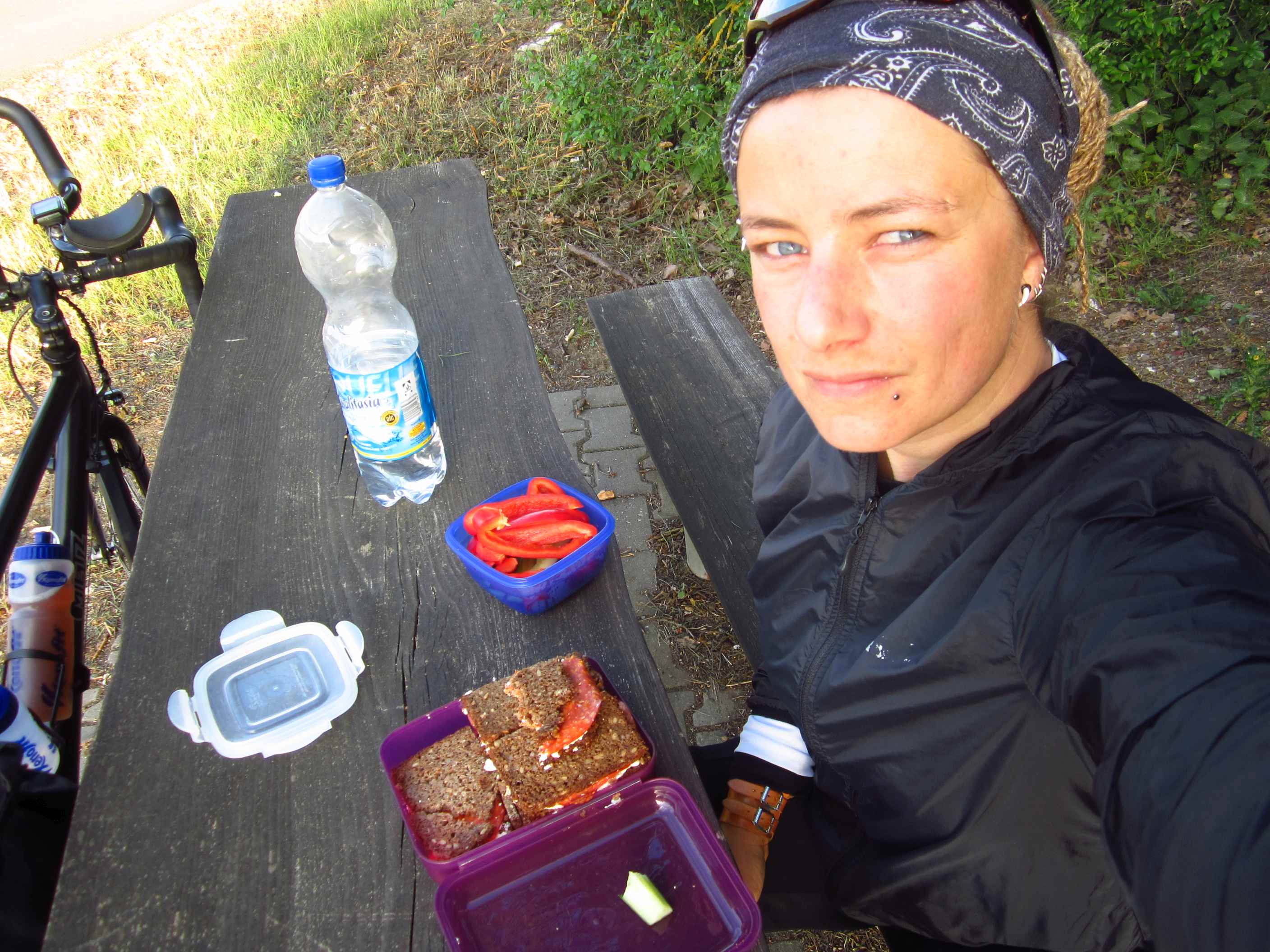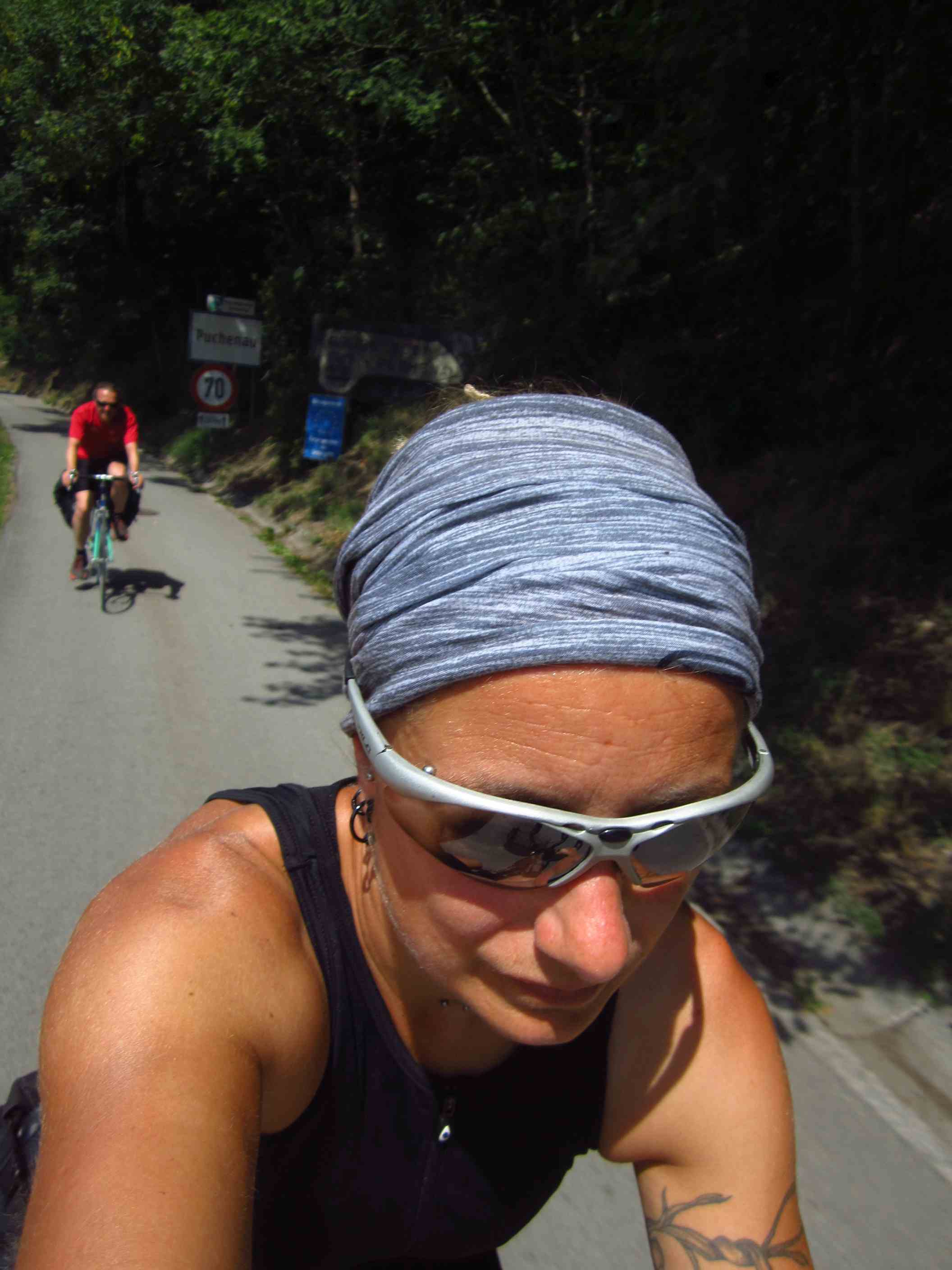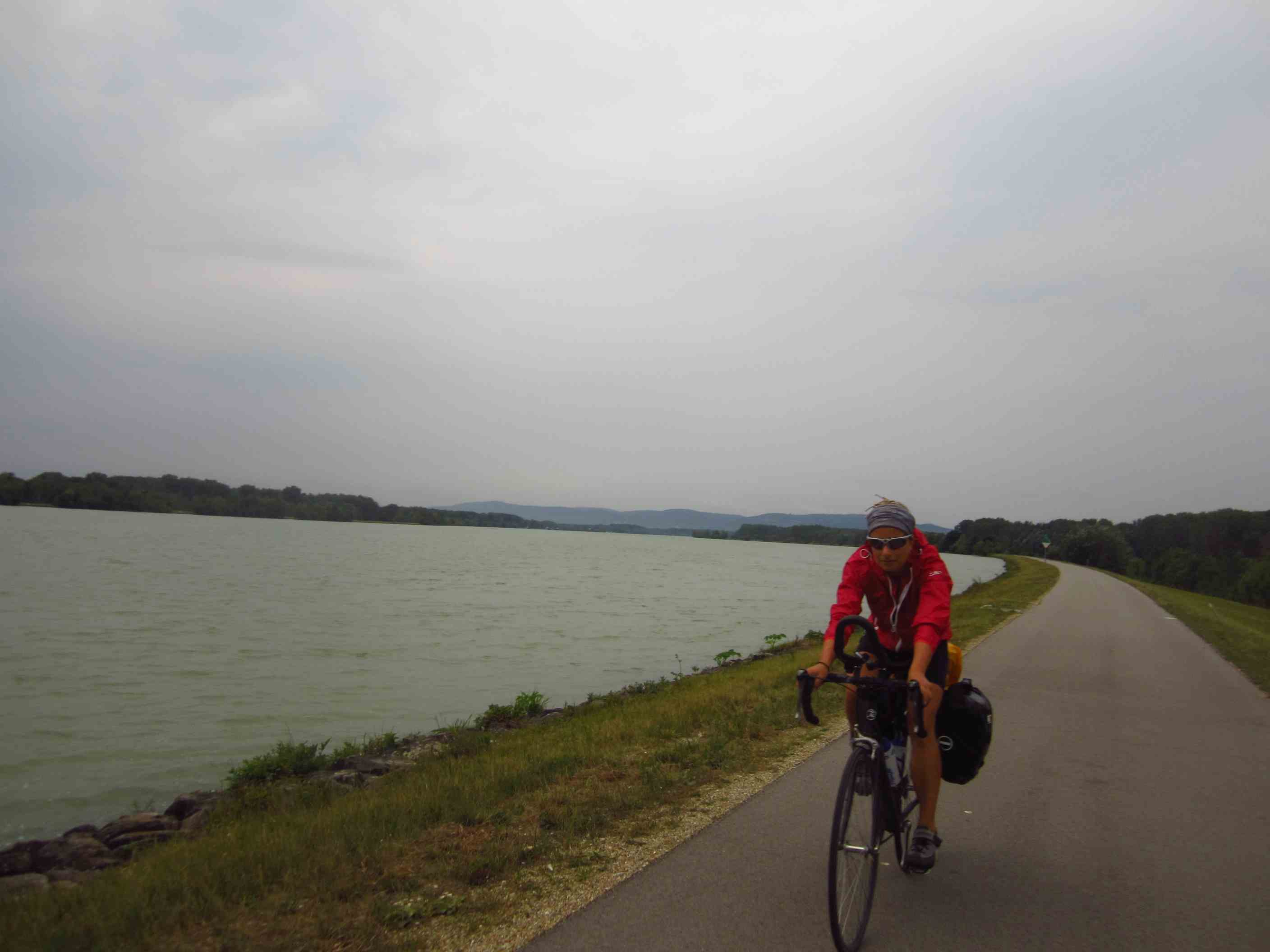 Wir trafen Moritz noch mal kurz unterwegs, dann war er weg oder wir – wie auch immer. Die Beine strampeln sich schnell wieder frei, und auch wenn man schon so viele Kilometer in den Knochen hat, macht es jeden Tag auf’s Neue Spaß und Freude! Das mit dem zweiten Frühstück hat noch geklappt, aber dann sollte es hart werden. Nachdem Wirtshäuser zu hatten, uns nicht gefallen hatten oder auch ein groß angekündigter Landgasthof ohne Ruhetag nicht geöffnet war, machten wir erst nach 120km Pause in Grein. Flo machte die Hitze sehr zu schaffen, mir meine Beine. Ein bißchen Schonhaltung zwecks meinem angeschlagenen Knie war denke ich noch dabei, so hatte ich öfters Krämpfe in der rechten Wade. Allerdings hatten wir uns auch auf einen 20er Schnitt gesteigert und kamen auch so in Granz an nach gesamt 147km. Der Zeltplatz war nicht ganz so einladend gelegen, aber die Leute dort nett. Abends saßen wir in einem Biergarten auf einem Boot im Hafen und nahmen noch ein Bier mit zum Zelt. Das Wetter sollte und schien auch umzuschlagen. Am Himmel schwarze Wolken und immer wieder Blitze, aber es blieb trocken.