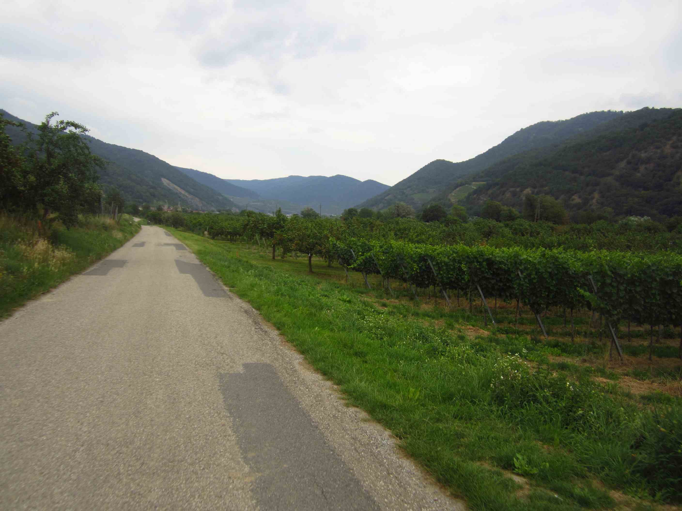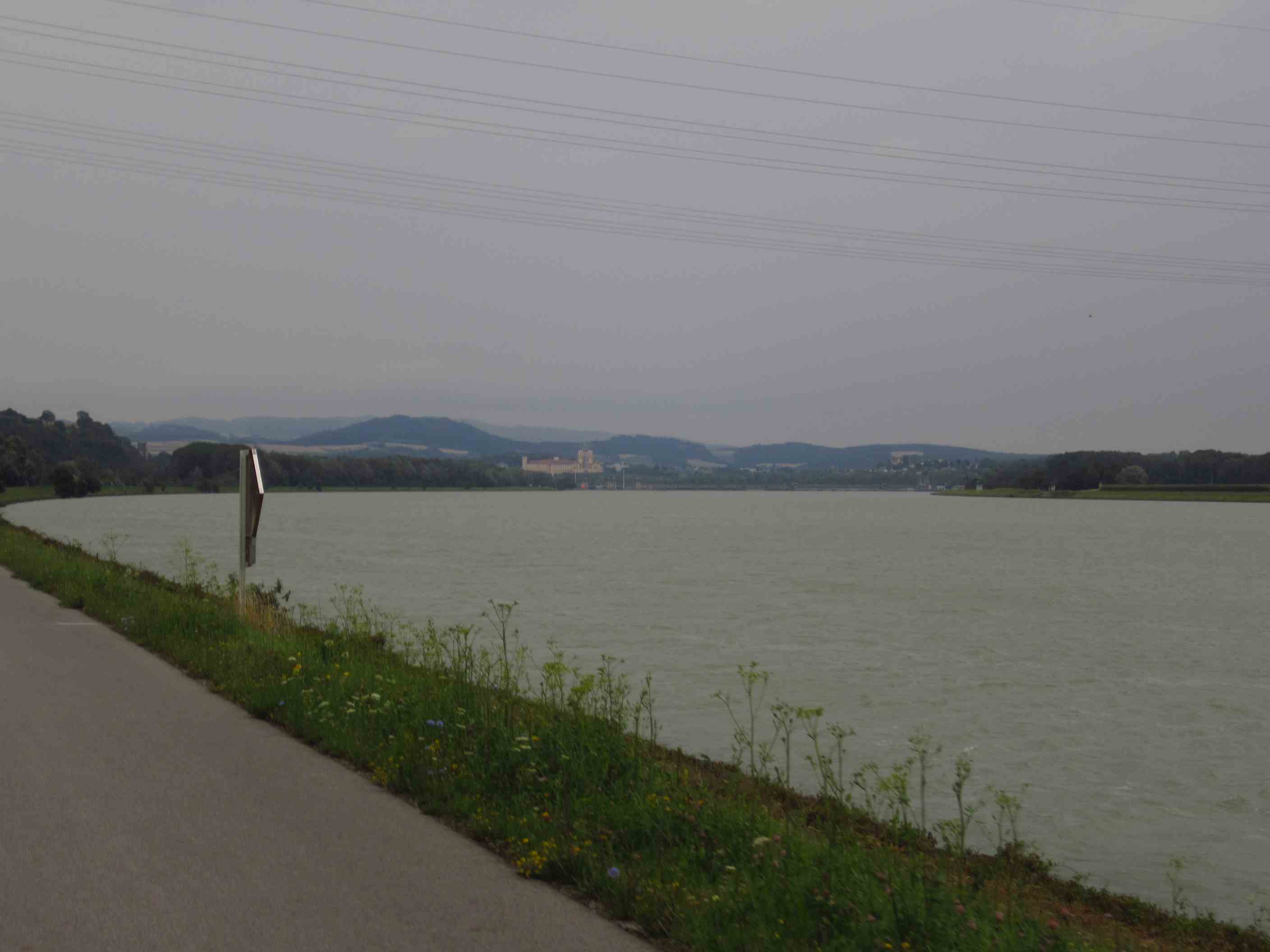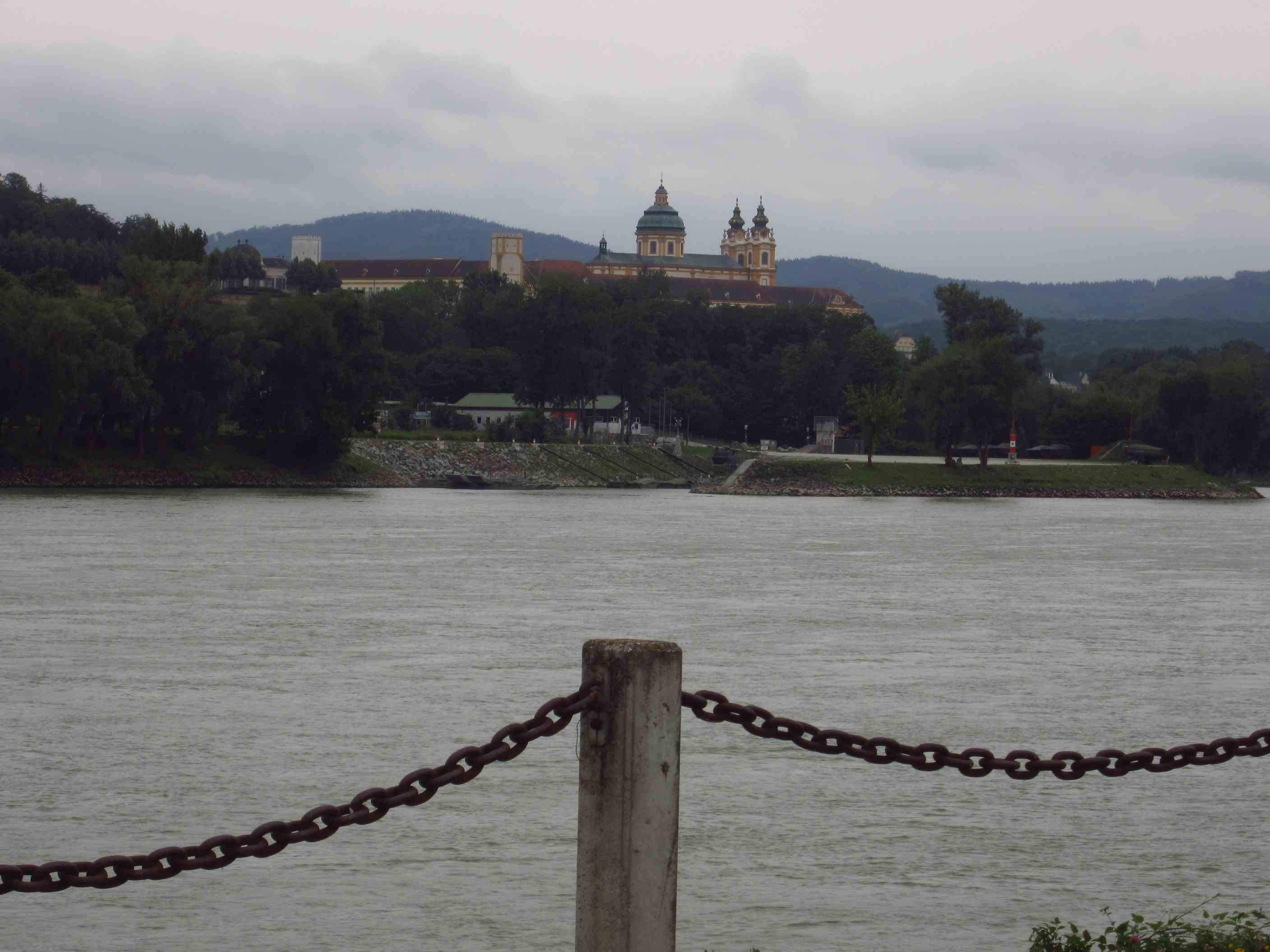 Früh war es sehr windig, allerdings in unsere Richtung. Wir brauchten heute auch mal die Regenjacken, aber es blieb dann doch beim Nieseln, solange wir auf den Rädern saßen. Es ging durch die Obst- und Weinberge der Wachau immer nahe der Donau. Mittags, als wir in Tulln beim Essen saßen, regnete es mal richtig, aber als wir weiterfuhren wurde es wieder trocken und alles war gerettet. Wir fuhren bis Klosterneuburg, 13km vor Wien, und waren gegen 15 Uhr da, so früh wie noch nie. Der Schnitt 20,5 kmh. Hätten locker bis Wien durchfahren können, aber wir wollten am Samstag bei schönem Wetter ankommen, außerdem gibt dort keinen so schönen Zeltplatz.