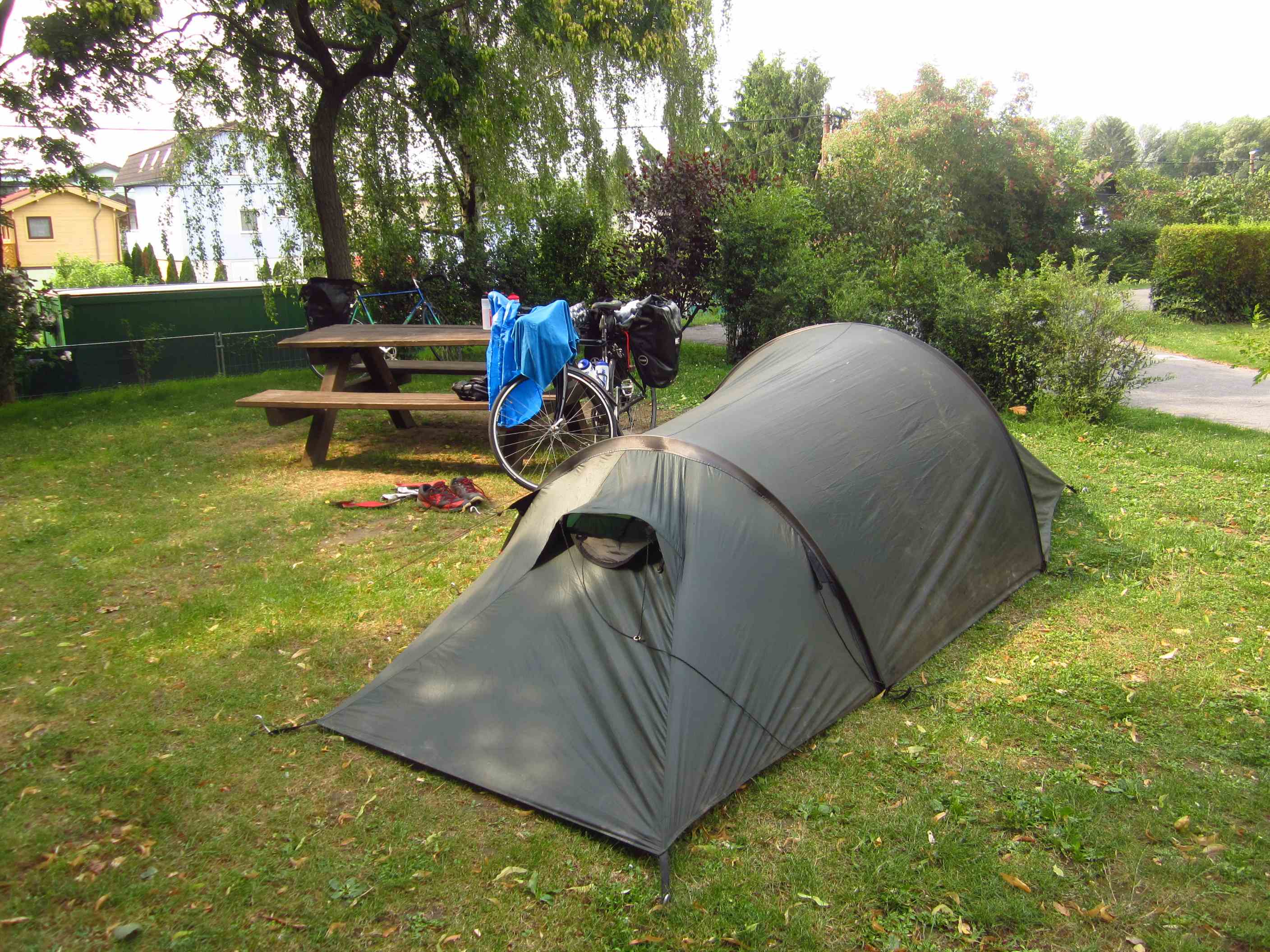 Ankommen, ein Bier trinken, dann Zelt aufbauen und duschen, danach wieder auf die Terrasse am Campingplatz, um eine Kleinigkeit zu essen. Hier machten wir Bekanntschaft mit drei Österreichern aus der Nähe von Wien. Die wollten ebenso wie wir am Samstag in Wien sein – sie fuhren von Donaueschingen quasi nach Hause. Die Nacht im Zelt war angenehm, nur laut. Ein paar Jugendliche, die hier auch campierten machten die Nacht zum Tag.