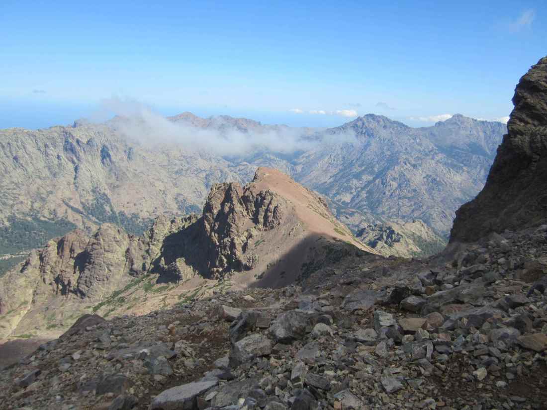 Rucksackdepot war 100m tiefer, so daß wir den Gipfel ohne Gepäck machen konnten. Beim Abstieg klarte es langsam wieder auf, es gab’ einen tollen Ausblick auf einen großen See und das Meer sah man sowieso jeden Tag immer mal wieder. Der Abstieg war lang aber toll. Segelflieger begleiteten uns. Als wir an der Refuge de Tighiettu ankamen hatte es ganz schön zugezogen, so daß wir gerade mit dem Zeltaufbau fertig waren, als es zu regnen begann. Unsere Sachen vom Wäsche waschen gestern, heute den ganzen Tag am Rucksack außen gehangen, waren noch immer nicht trocken und auch im Zelt hatte sich Feuchtigkeit gebildet, so verlief alles nicht ganz so rund.