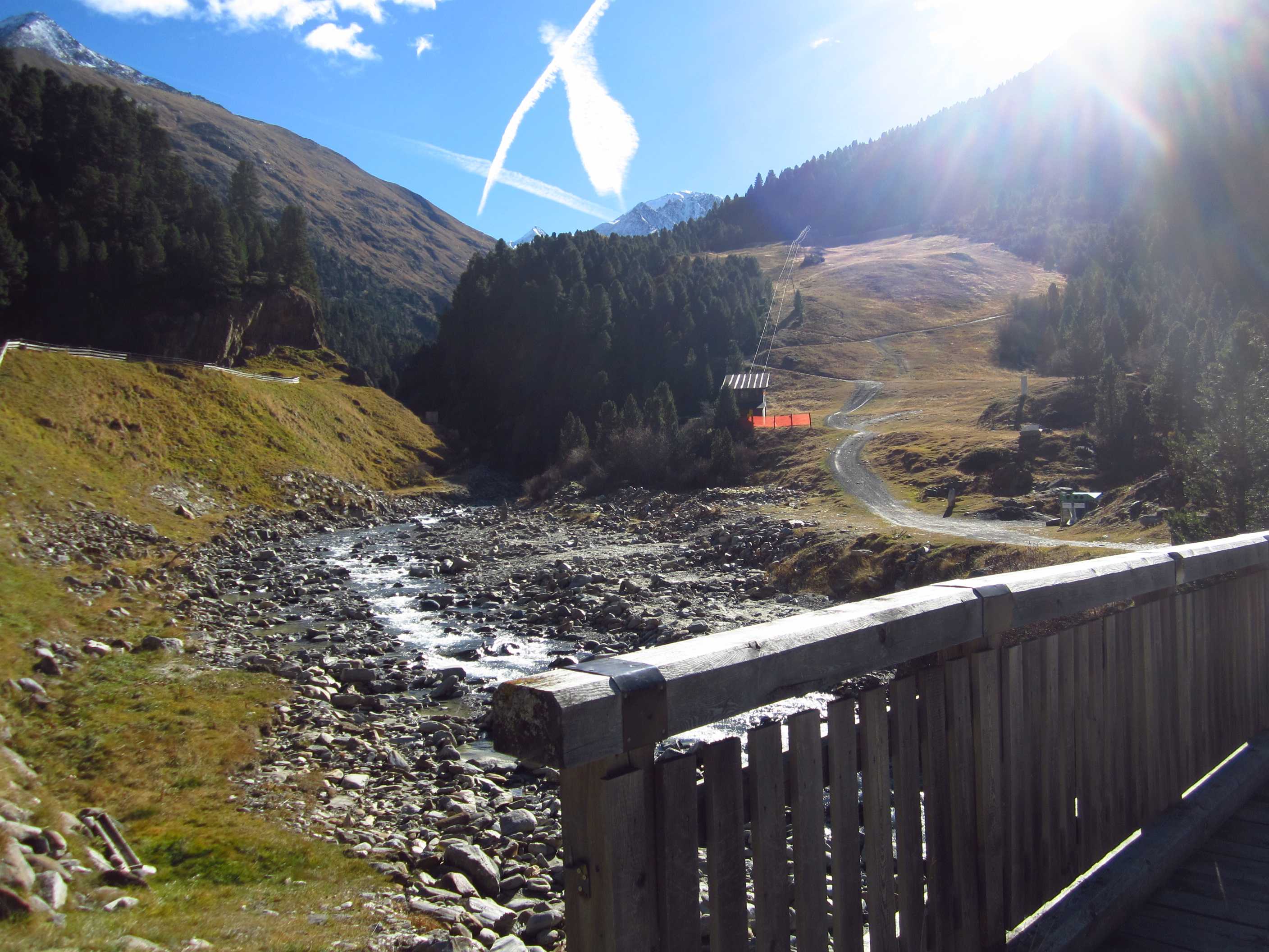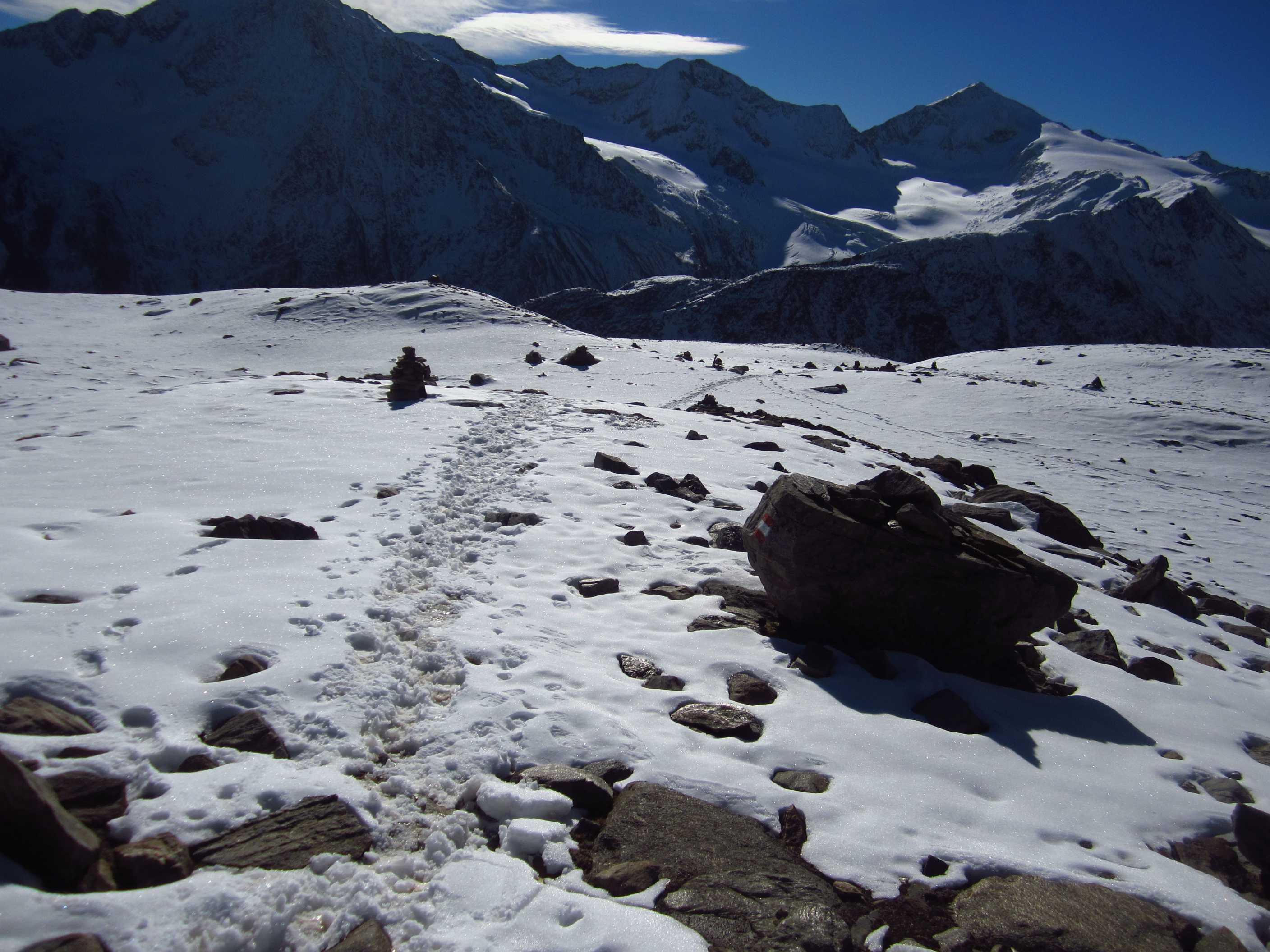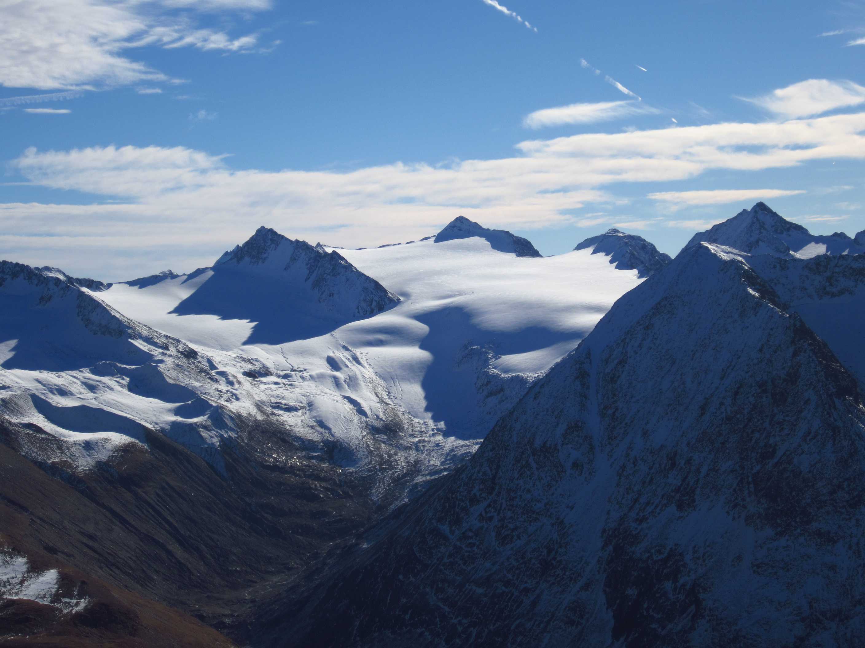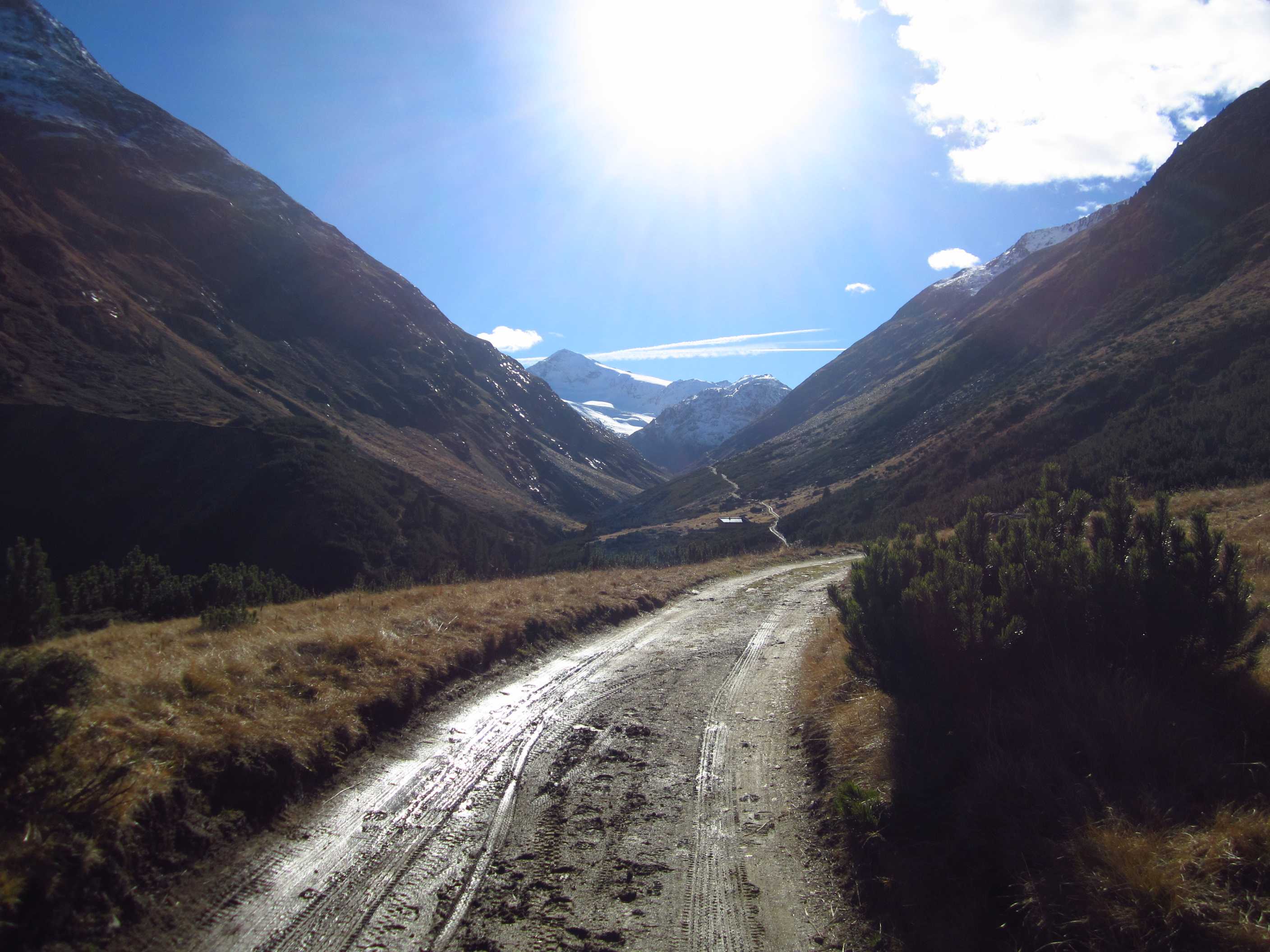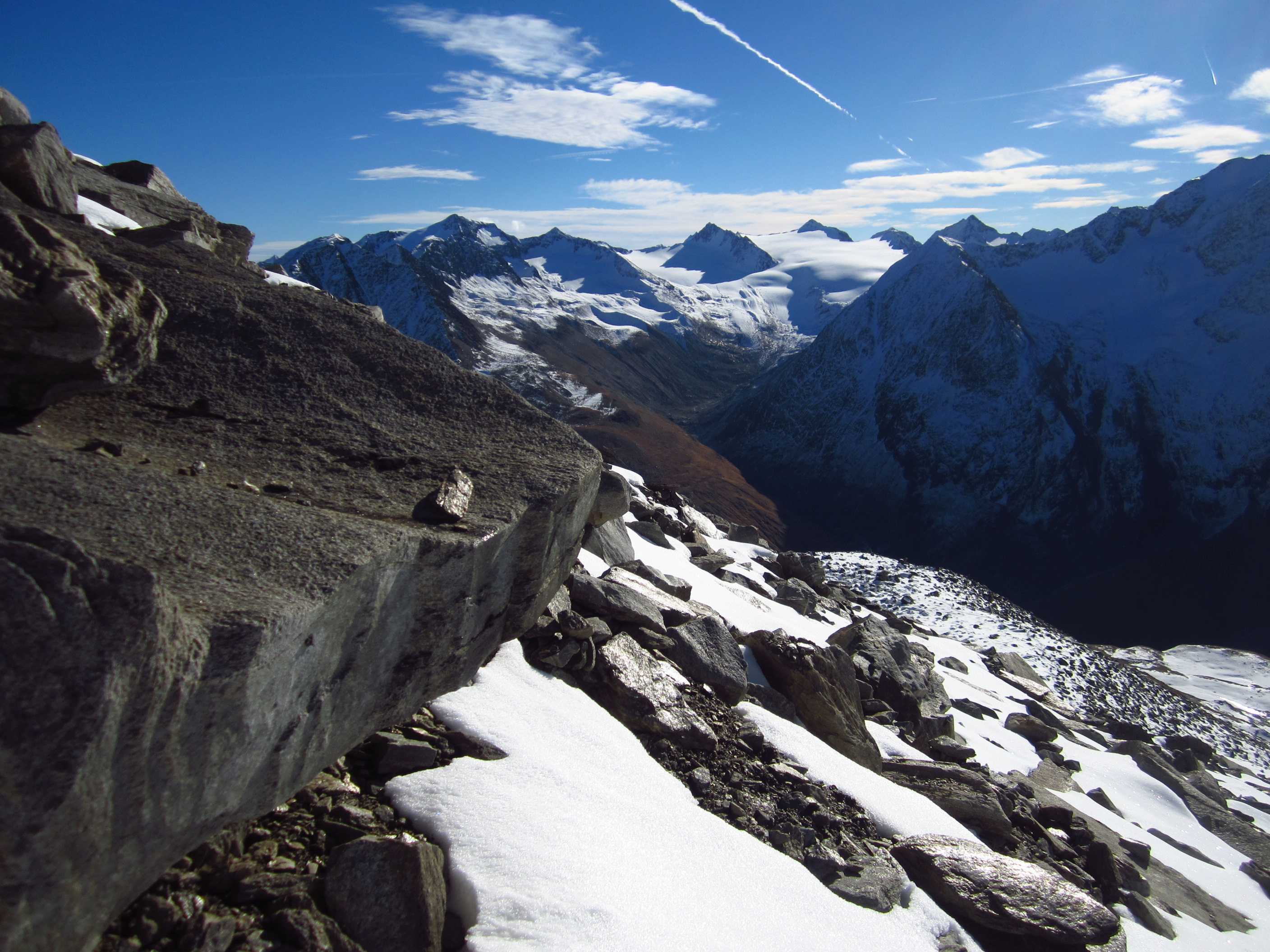 Langes Wochenende – zwei Tage davon ließen sich nutzen, um ins Ötztal zu fahren und die Kreuzspitze noch einmal zu besteigen. Ich war hier bereits gewesen, in der Ecke schon oft auf dem Gipfel schon einmal fast und einmal richtig, und ich liebe diese Ecke der Alpen! Die Schneeverhältinisse schienen noch annehmbar und die Wetterbedingungen waren mehr als gut gemeldet für dieses Wochenende! Als ich mich darauf vorbereitete, las ich im Internet, daß es in diesem Jahr zu einem Hangrutsch gekommen war, so daß der Normalweg zur Martin Busch Hütte verschüttet war und man einen Umweg nehmen mußte, der einige Zeit mehr in Anspruch nehmen würde. Ich kam am 29.10. um halb 2 in Vent an und lief gleich los. Mein Tagesziel war nur die Hütte auf 2501m, das hieß 606hm. Das Wetter war gigantisch, die Hosen hochgekrempelt und im T-Shirt lief ich bis oben.