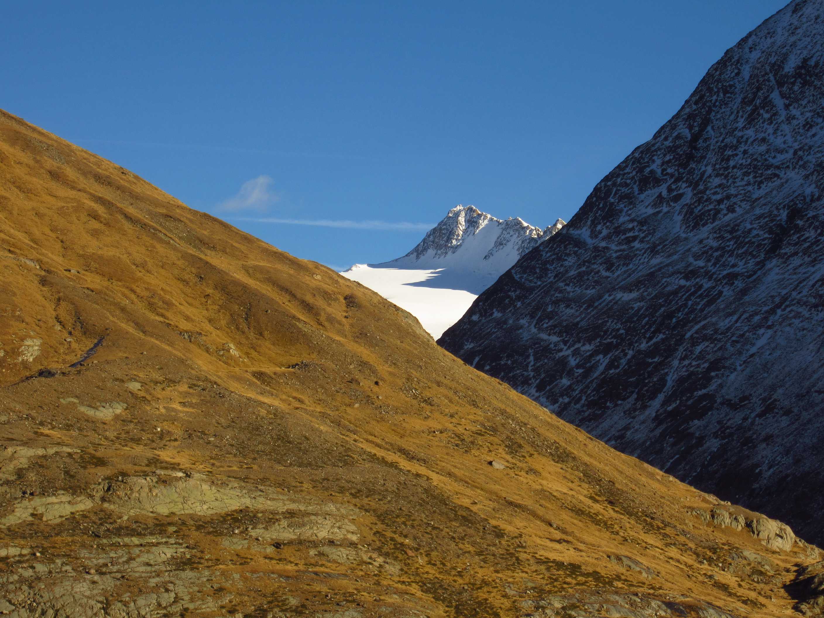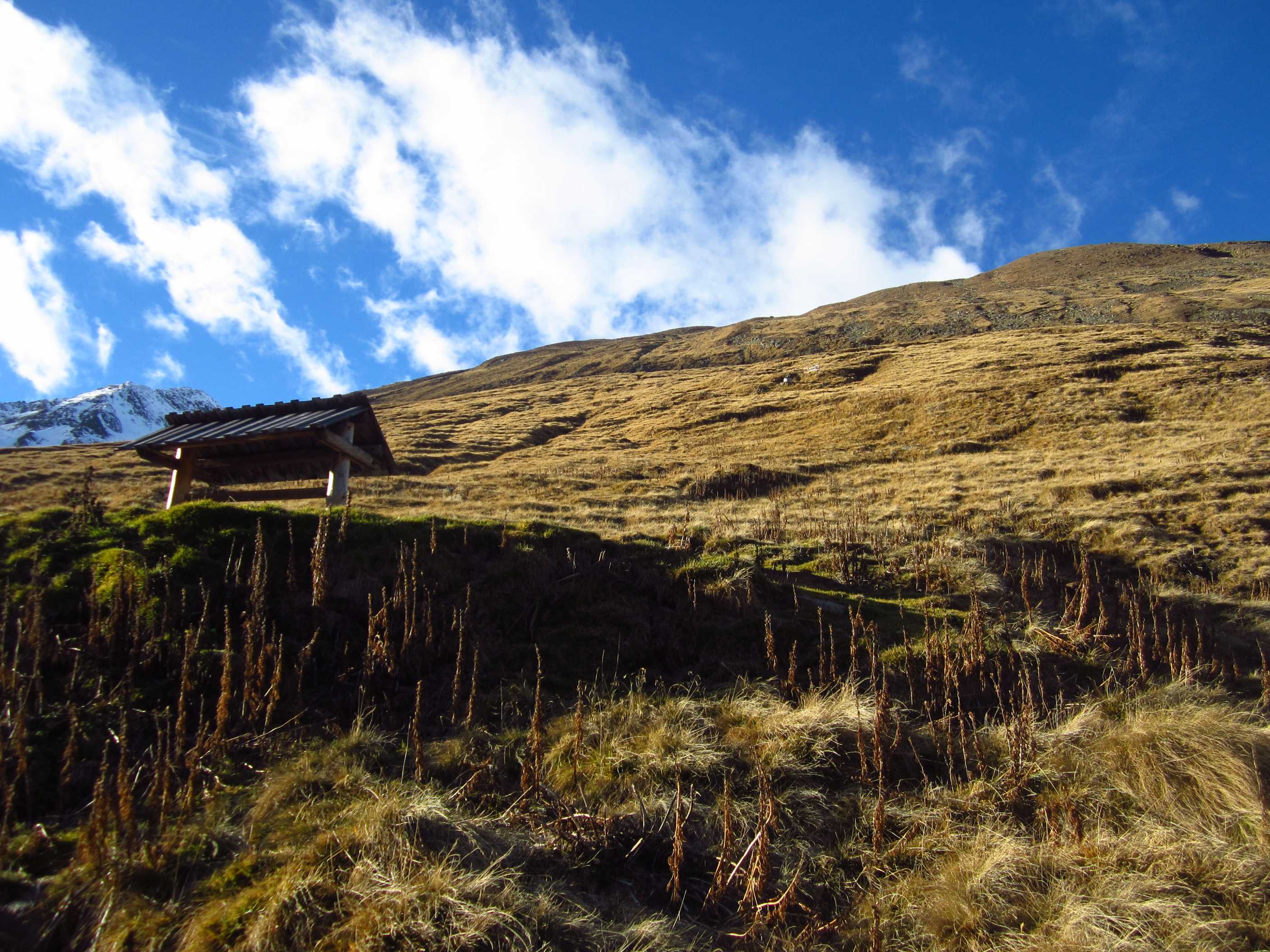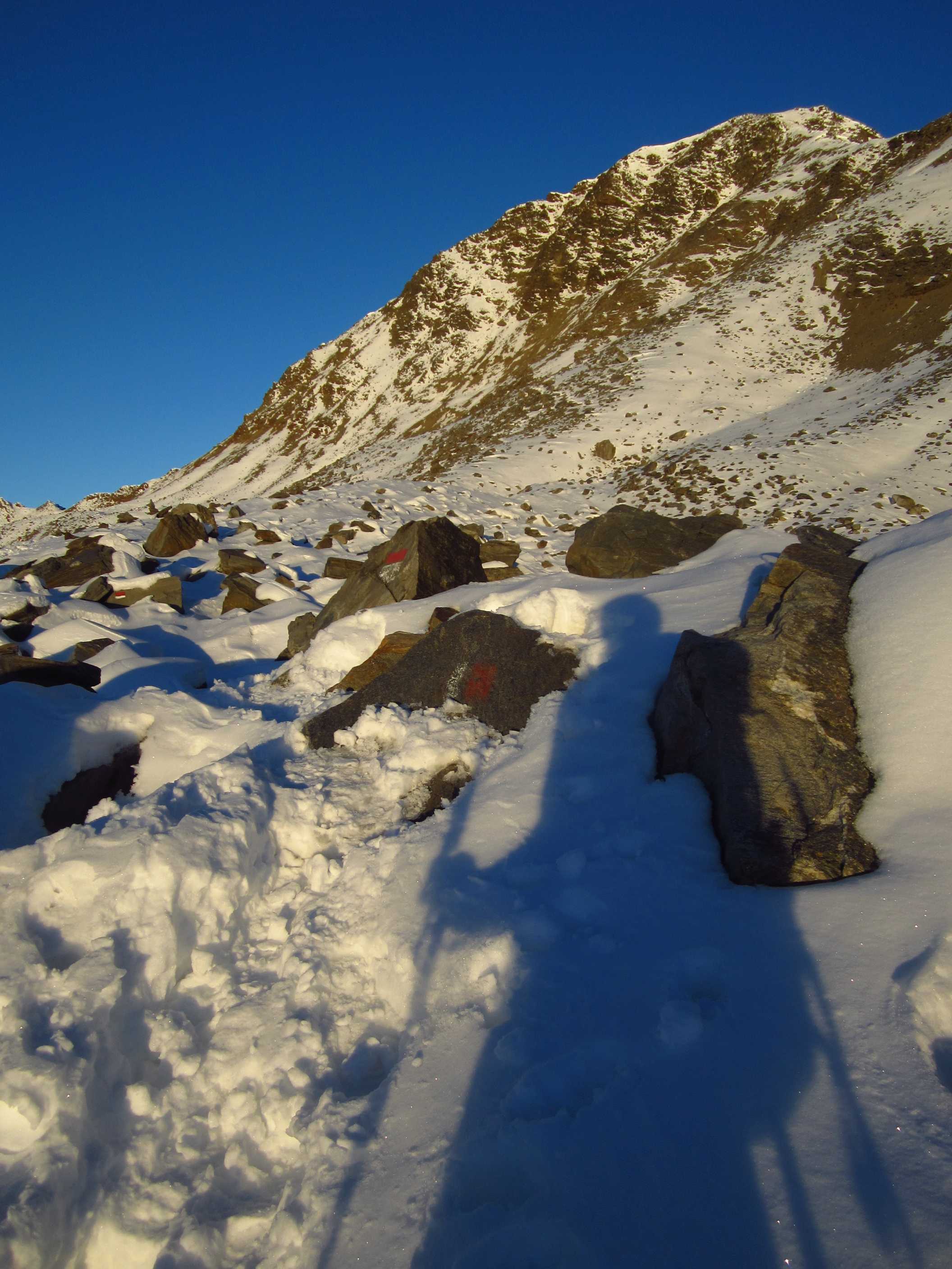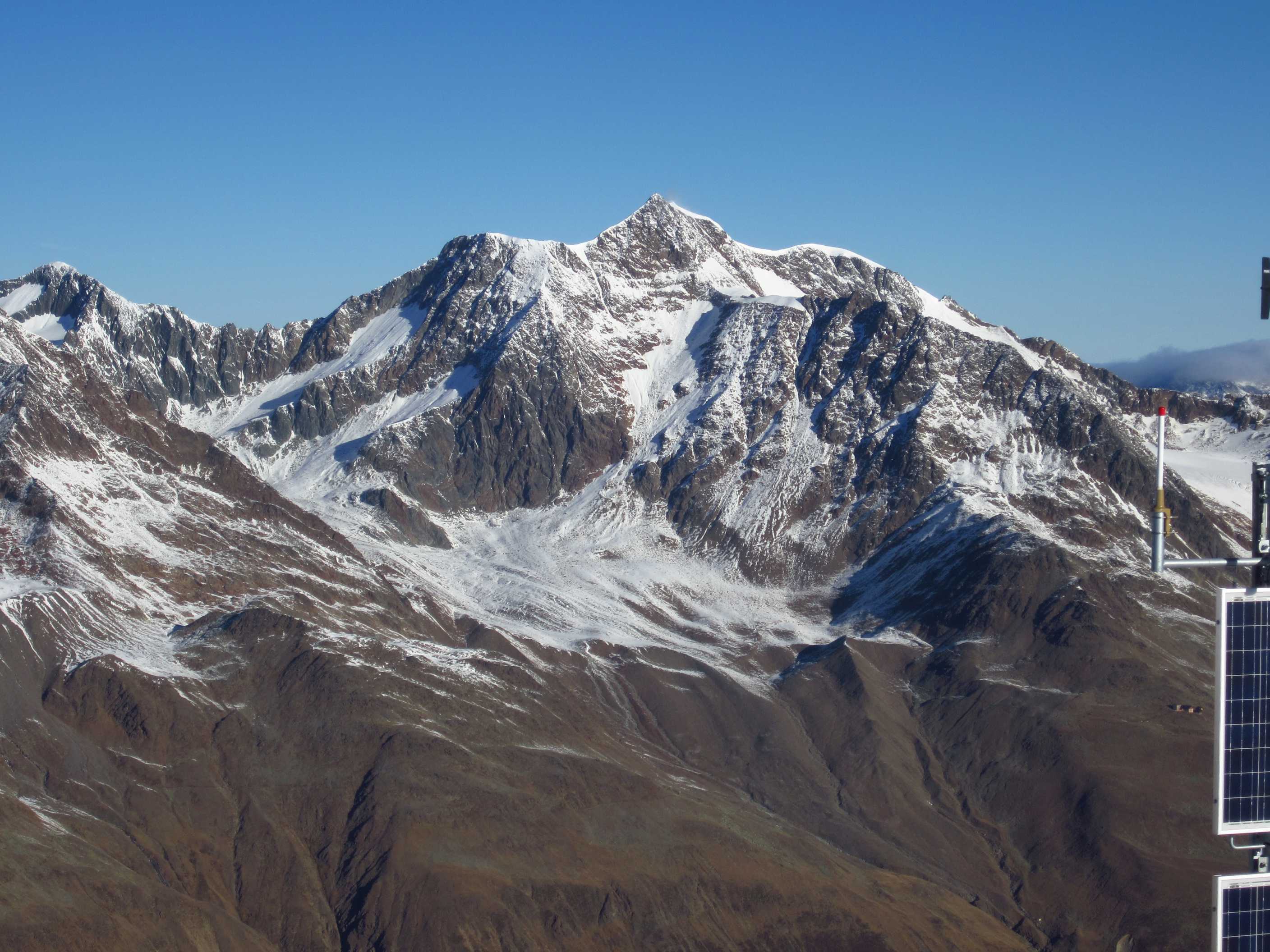 Langes Wochenende – zwei Tage davon ließen sich nutzen, um ins Ötztal zu fahren und die Kreuzspitze noch einmal zu besteigen. Ich war hier bereits gewesen, in der Ecke schon oft auf dem Gipfel schon einmal fast und einmal richtig, und ich liebe diese Ecke der Alpen! Die Schneeverhältinisse schienen noch annehmbar und die Wetterbedingungen waren mehr als gut gemeldet für dieses Wochenende! Als ich mich darauf vorbereitete, las ich im Internet, daß es in diesem Jahr zu einem Hangrutsch gekommen war, so daß der Normalweg zur Martin Busch Hütte verschüttet war und man einen Umweg nehmen mußte, der einige Zeit mehr in Anspruch nehmen würde. Ich kam am 29.10. um halb 2 in Vent an und lief gleich los. Mein Tagesziel war nur die Hütte auf 2501m, das hieß 606hm. Das Wetter war gigantisch, die Hosen hochgekrempelt und im T-Shirt lief ich bis oben.