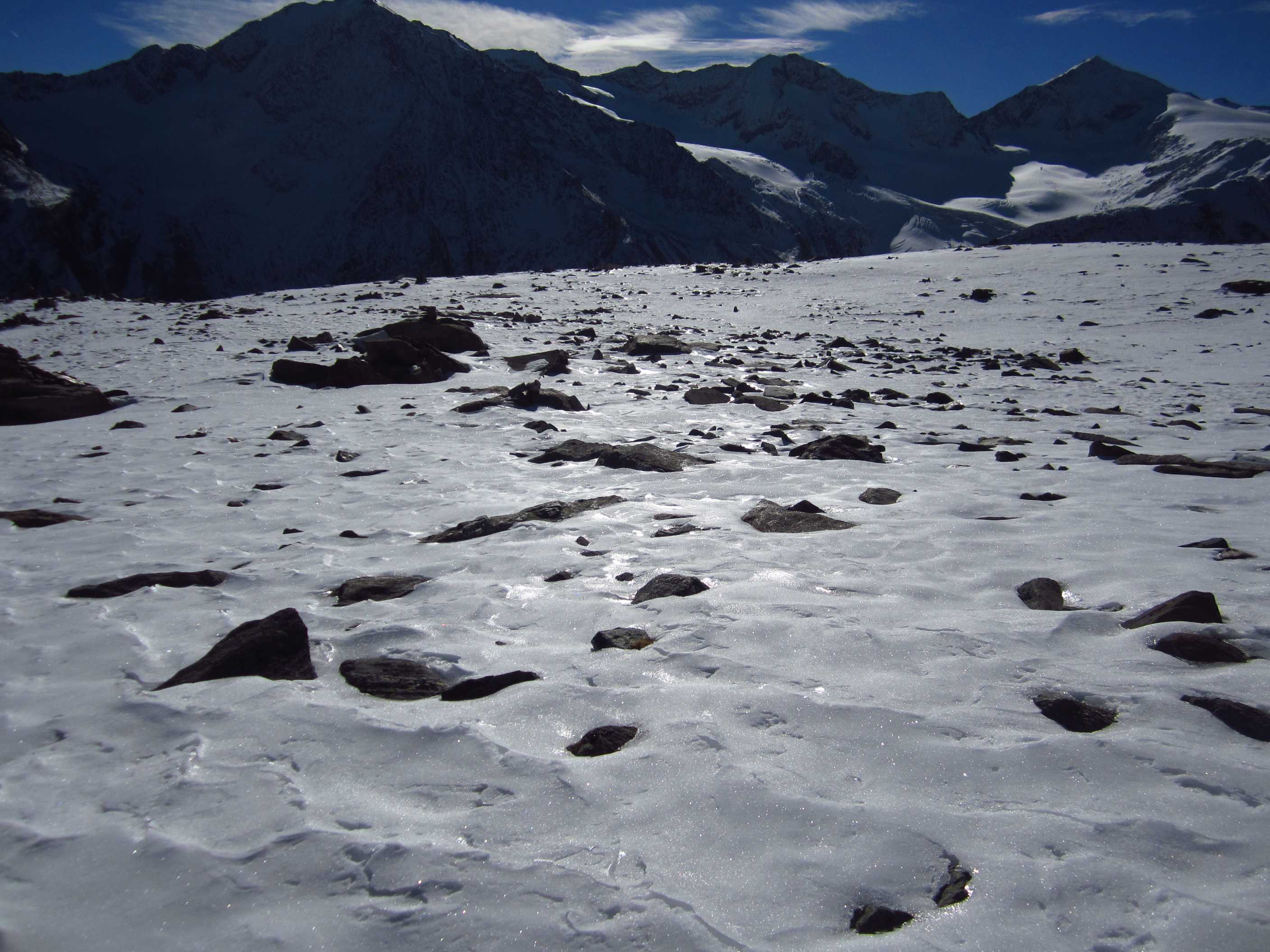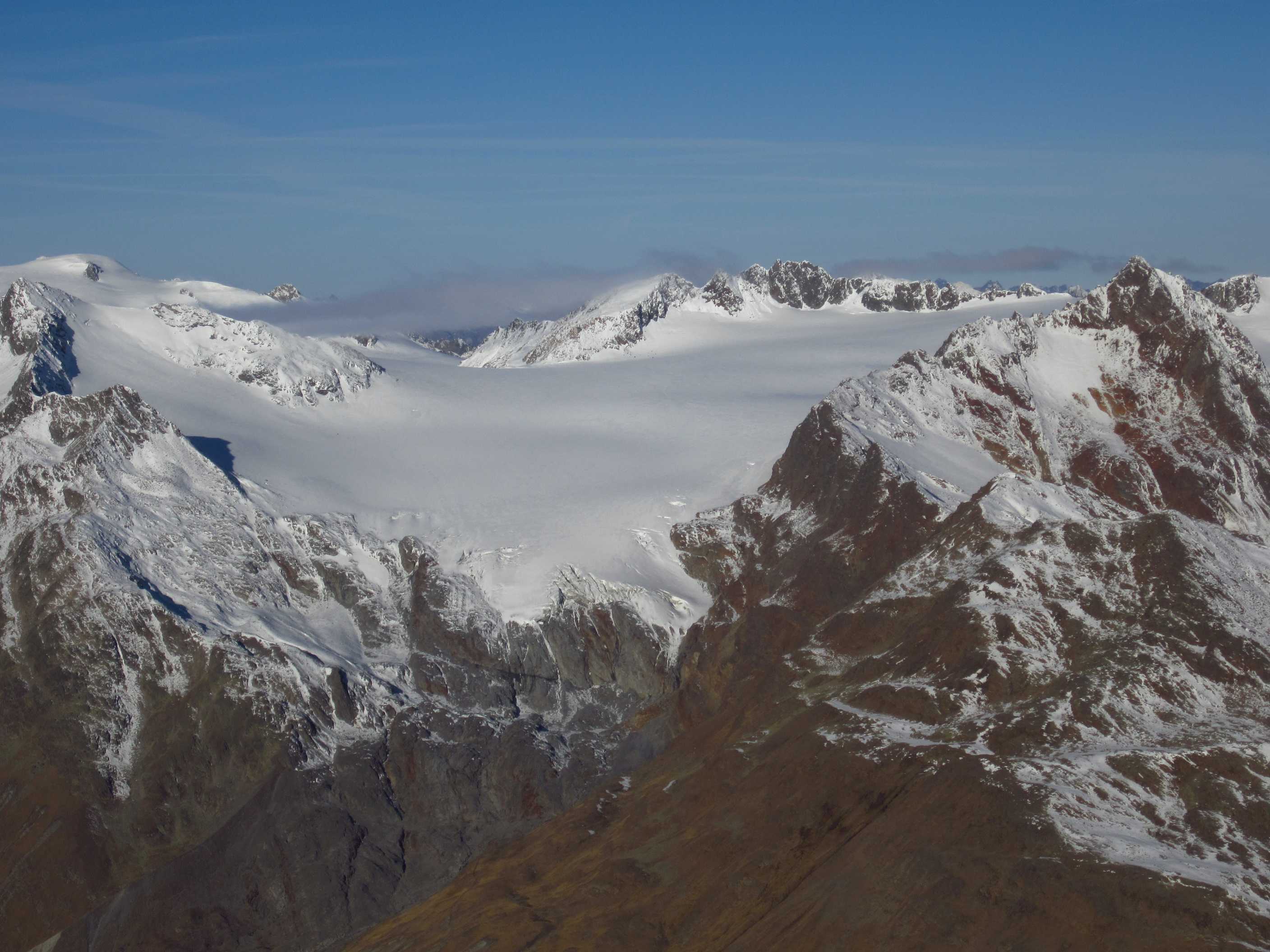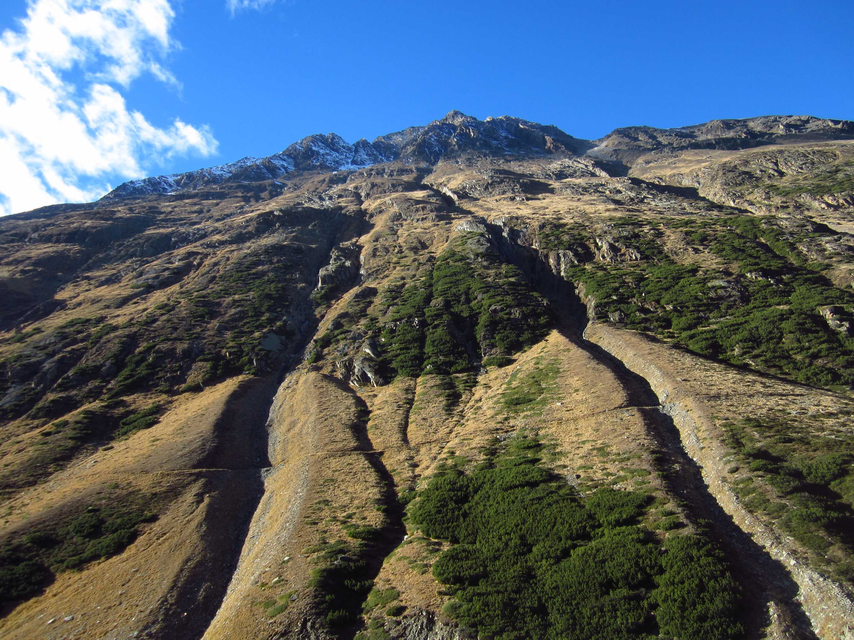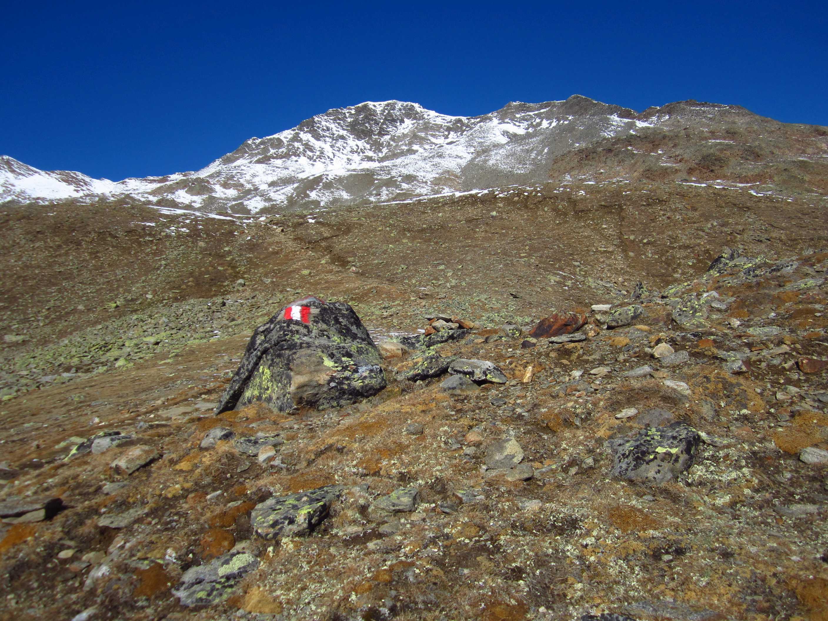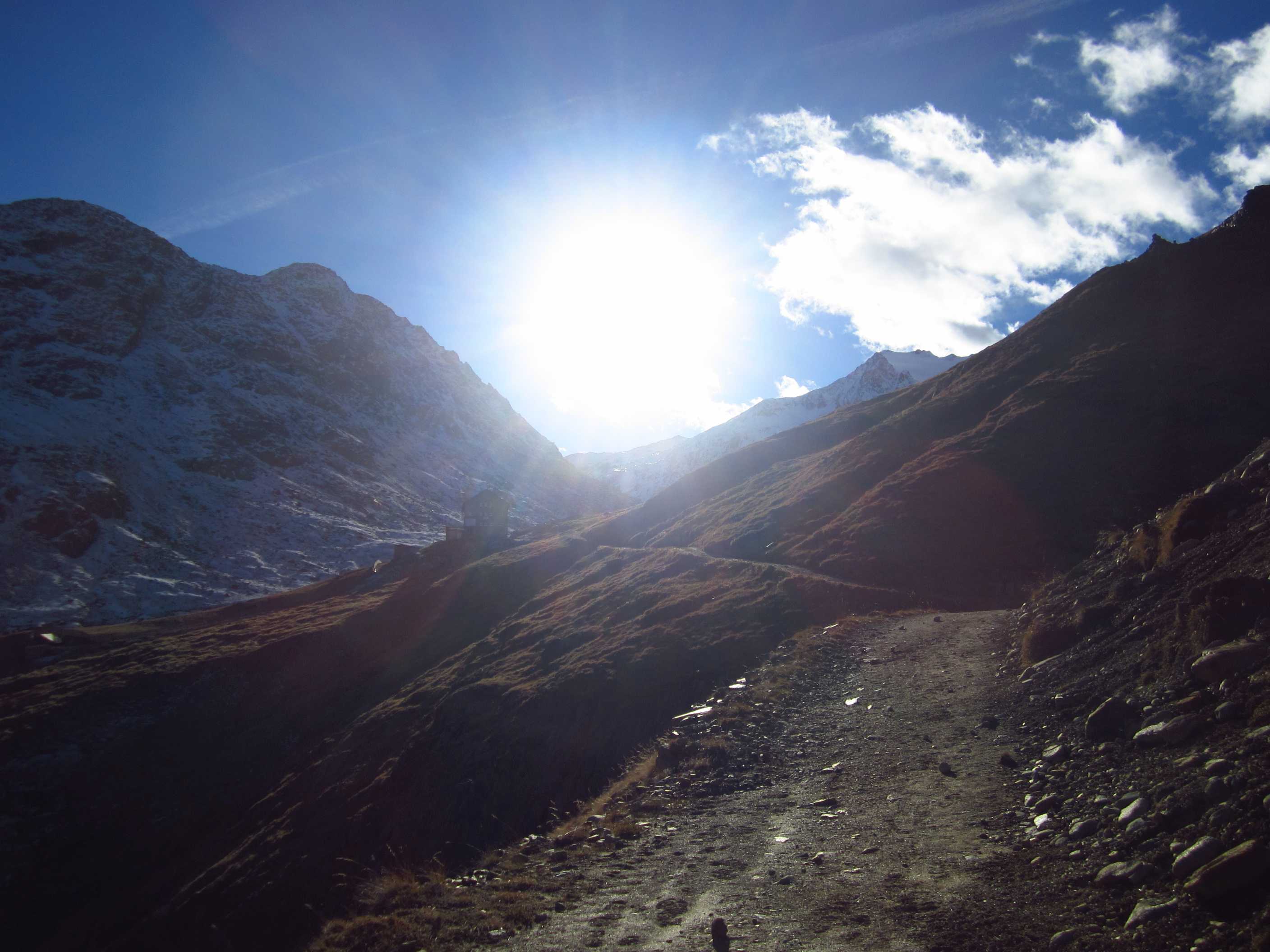 Langes Wochenende – zwei Tage davon ließen sich nutzen, um ins Ötztal zu fahren und die Kreuzspitze noch einmal zu besteigen. Ich war hier bereits gewesen, in der Ecke schon oft auf dem Gipfel schon einmal fast und einmal richtig, und ich liebe diese Ecke der Alpen! Die Schneeverhältinisse schienen noch annehmbar und die Wetterbedingungen waren mehr als gut gemeldet für dieses Wochenende! Als ich mich darauf vorbereitete, las ich im Internet, daß es in diesem Jahr zu einem Hangrutsch gekommen war, so daß der Normalweg zur Martin Busch Hütte verschüttet war und man einen Umweg nehmen mußte, der einige Zeit mehr in Anspruch nehmen würde. Ich kam am 29.10. um halb 2 in Vent an und lief gleich los. Mein Tagesziel war nur die Hütte auf 2501m, das hieß 606hm. Das Wetter war gigantisch, die Hosen hochgekrempelt und im T-Shirt lief ich bis oben.
