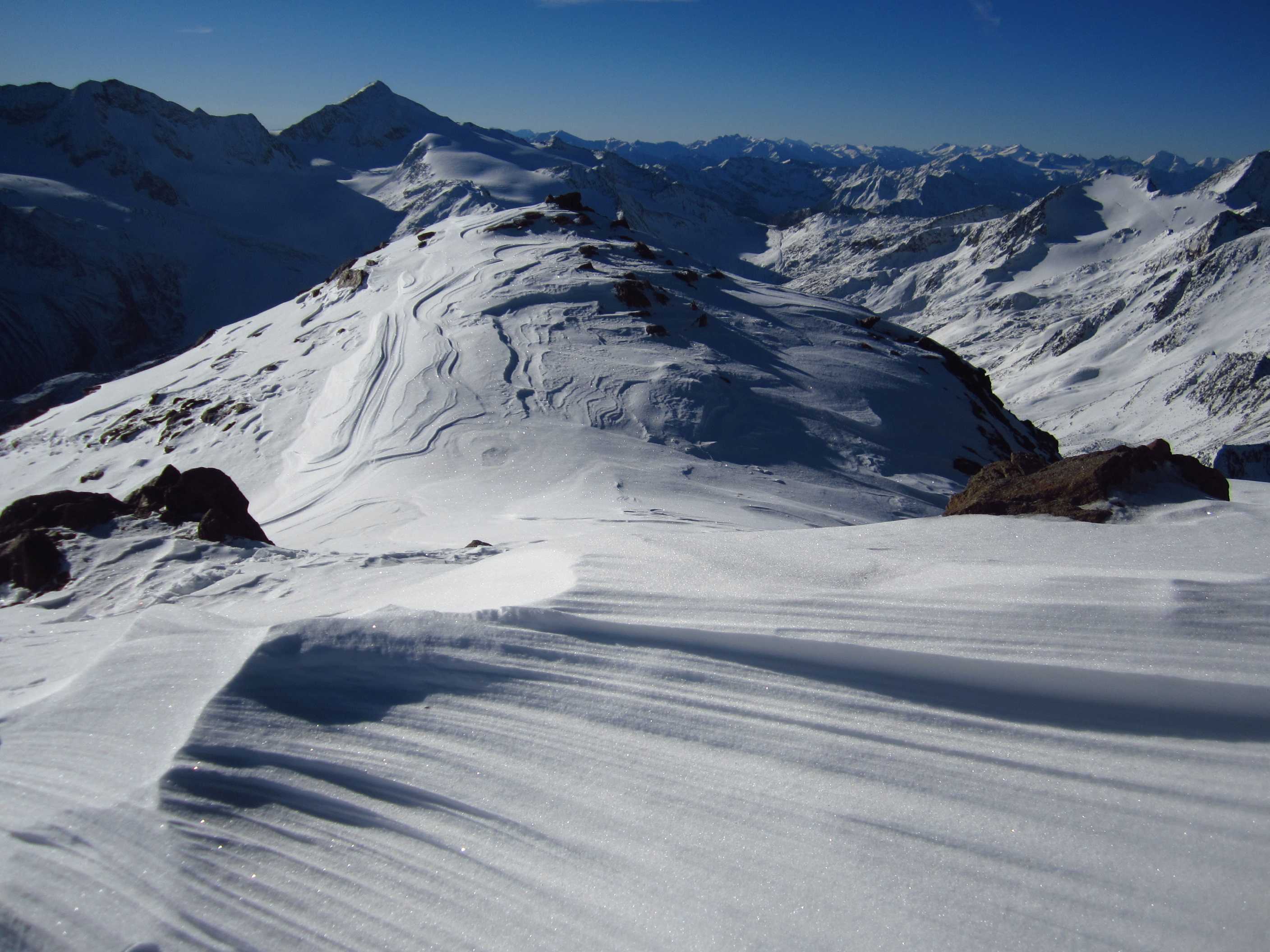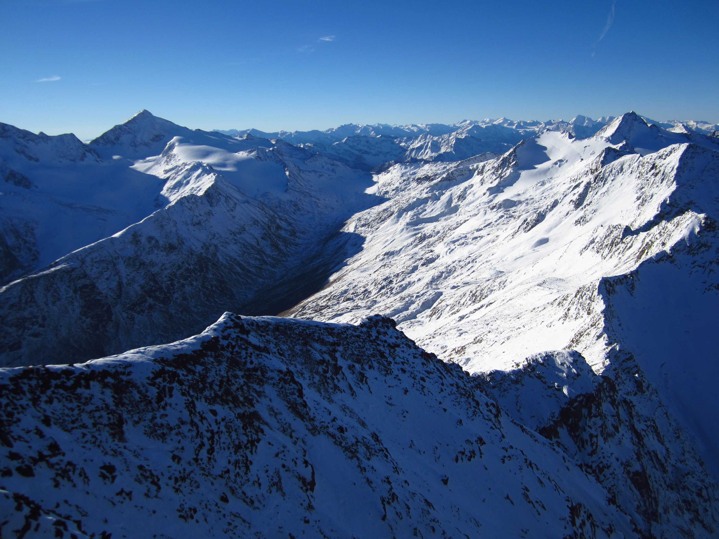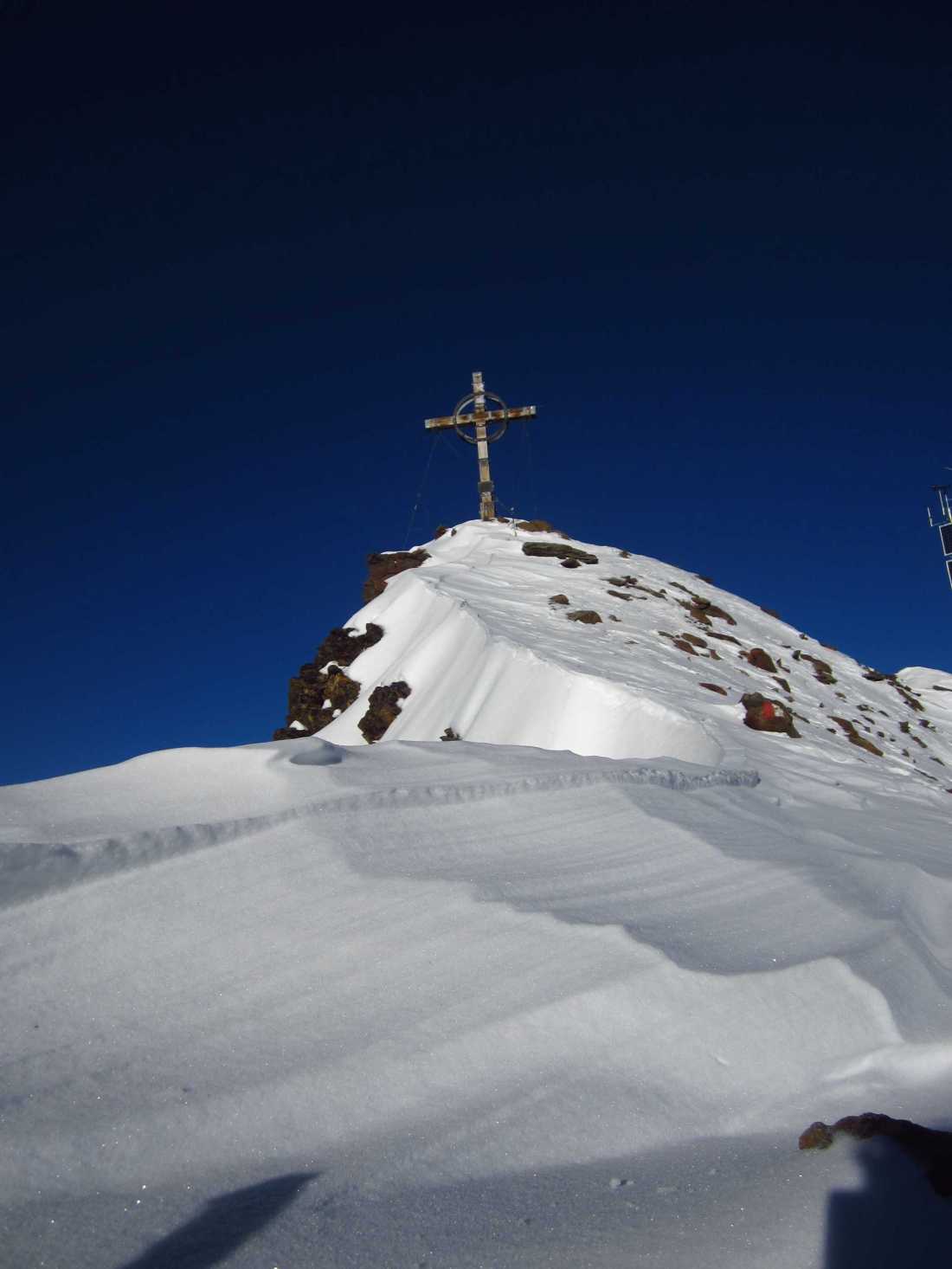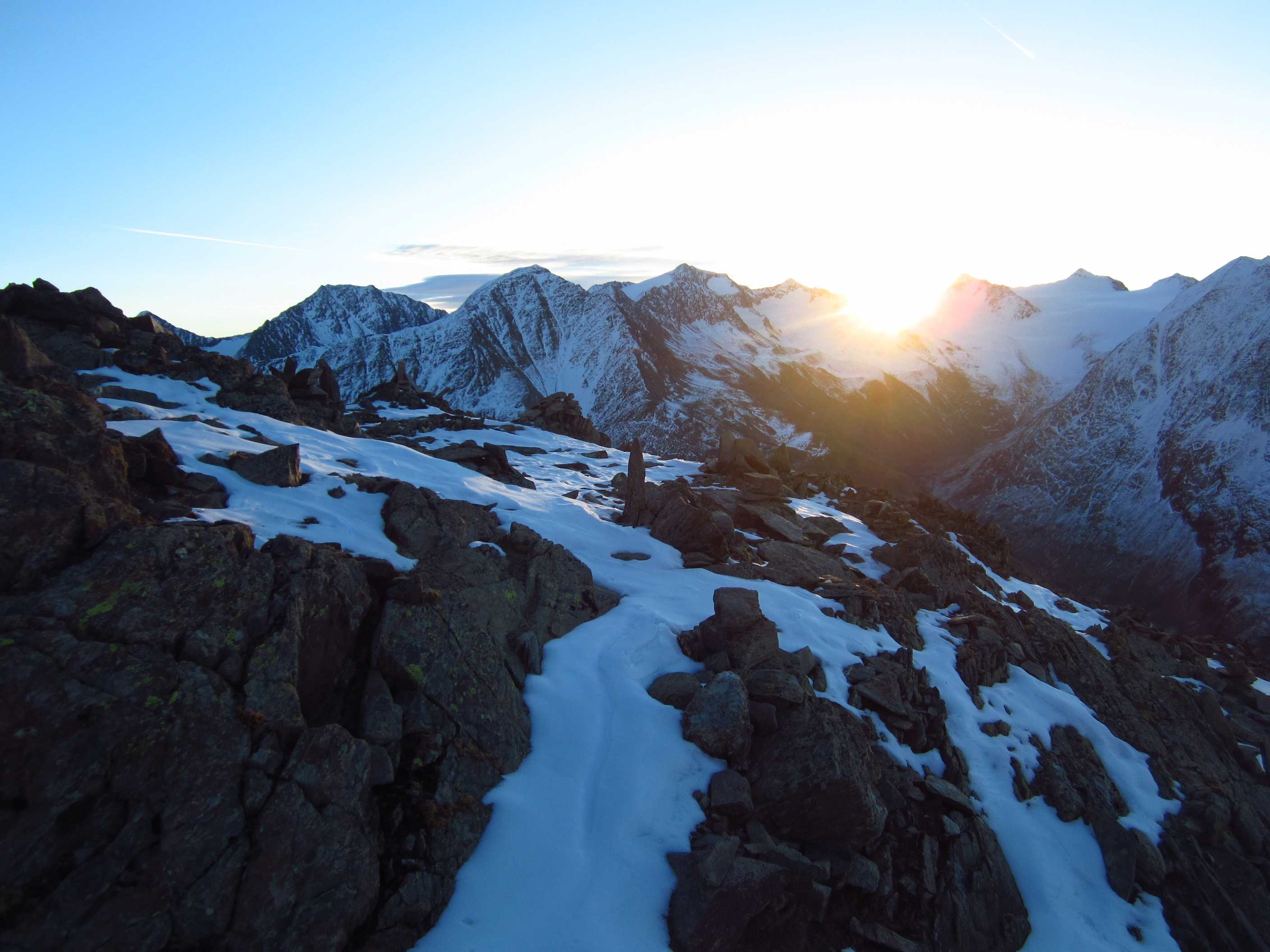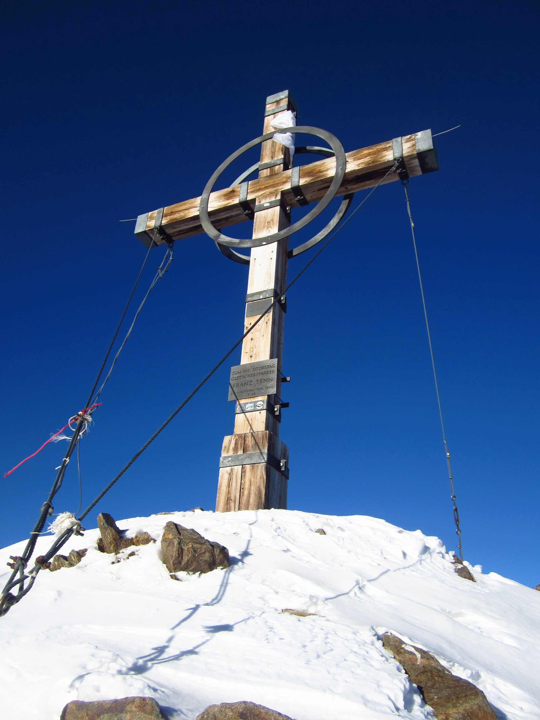 Übernachtung war im Winterraum, da die Hütte bereits geschlossen war um diese Jahreszeit, die Nacht unruhig, da einige Tschechen die Nacht zum Tag machten – egal – gegen 5:30 stieg ich los in Richtung Gipfel, zunächst mit Stirnlampe bis der Sonnenaufgang einsetzte. Die Bergwelt war fantastisch, ich war ganz allein. Die Sonne kam aus Richtung Obergurgel und beleuchtete zunächst den Similaun, später alles Weitere. Ich forderte mich, aber ich war nicht überfordert, so stand ich kurz vor neun am Gipfel. Im letzten Teilstück waren Schneeverwehungen zu überqueren, die mich zunächst etwas unsicher machten, aber sie waren kein Problem. Der Blick war überragend, nur Schleierwölkchen am Himmel, alles in eine leicht schneebedeckte Oberfläche getaucht und Sonne über Sonne. Ich war glücklich!