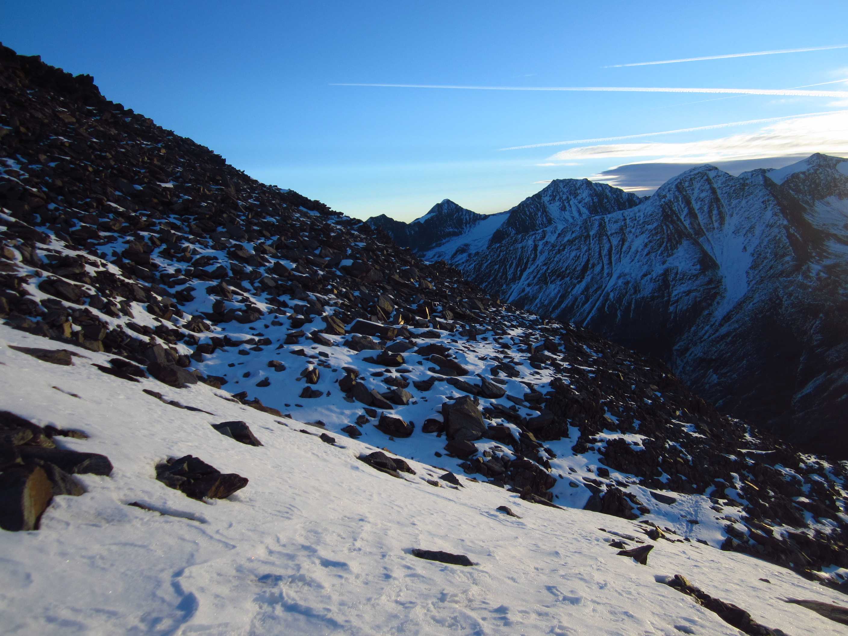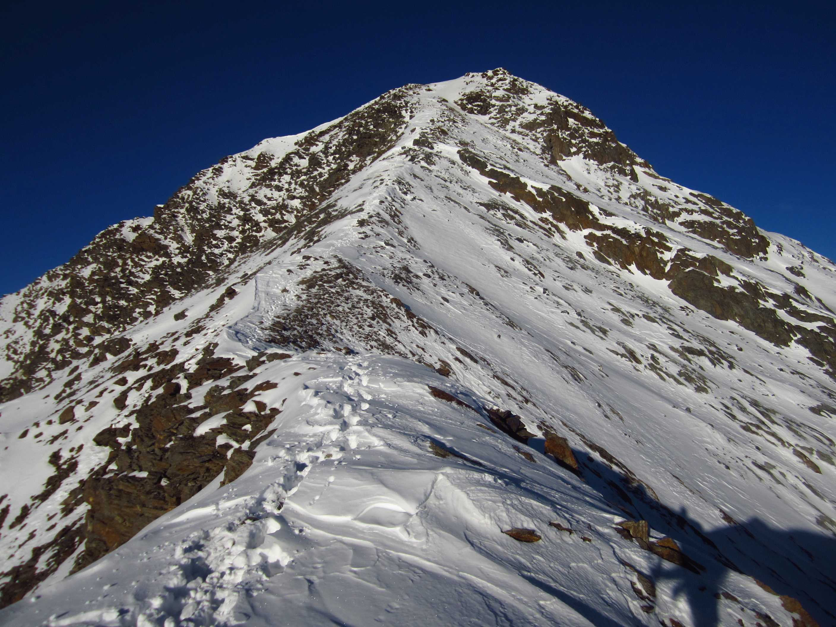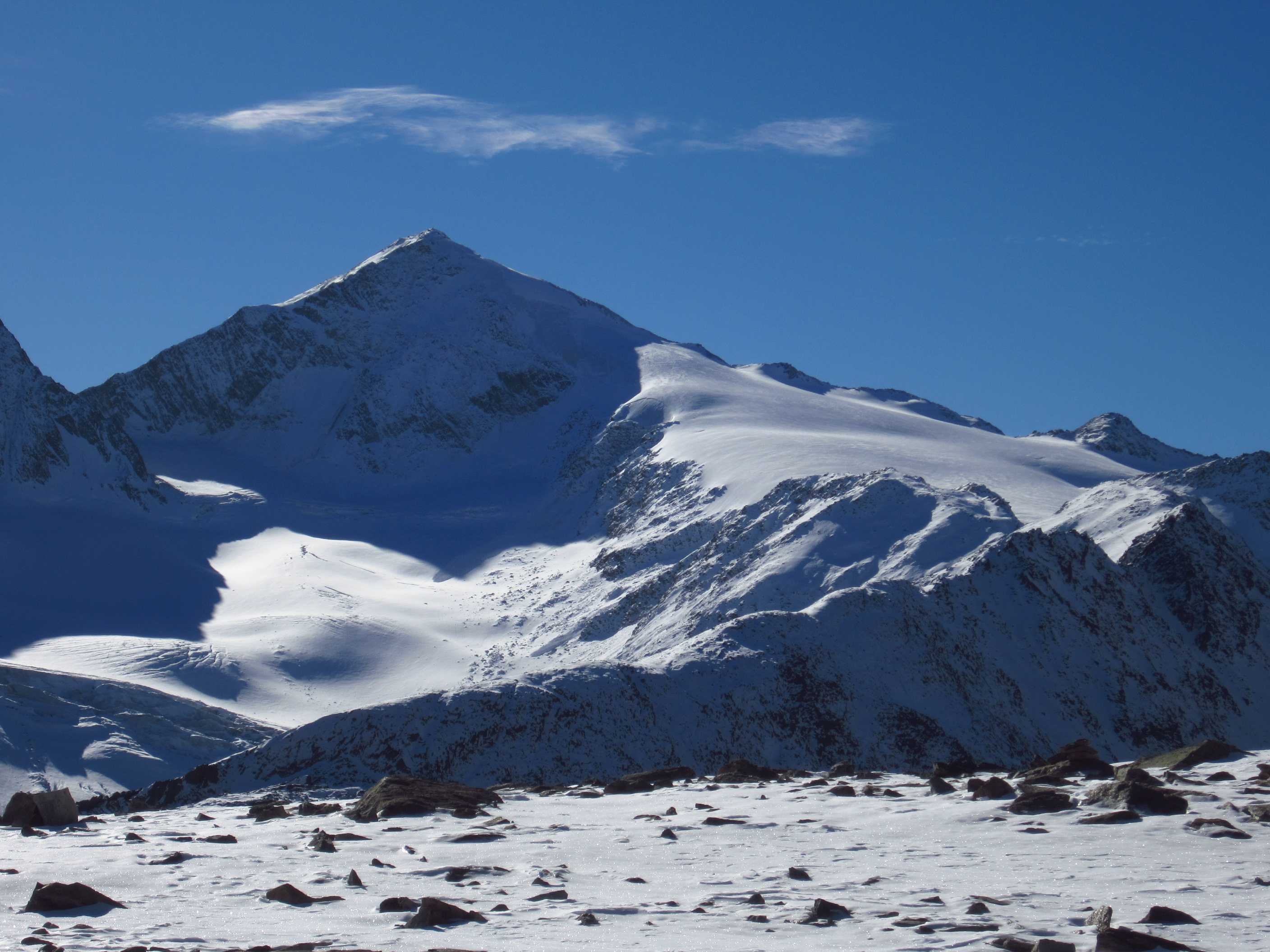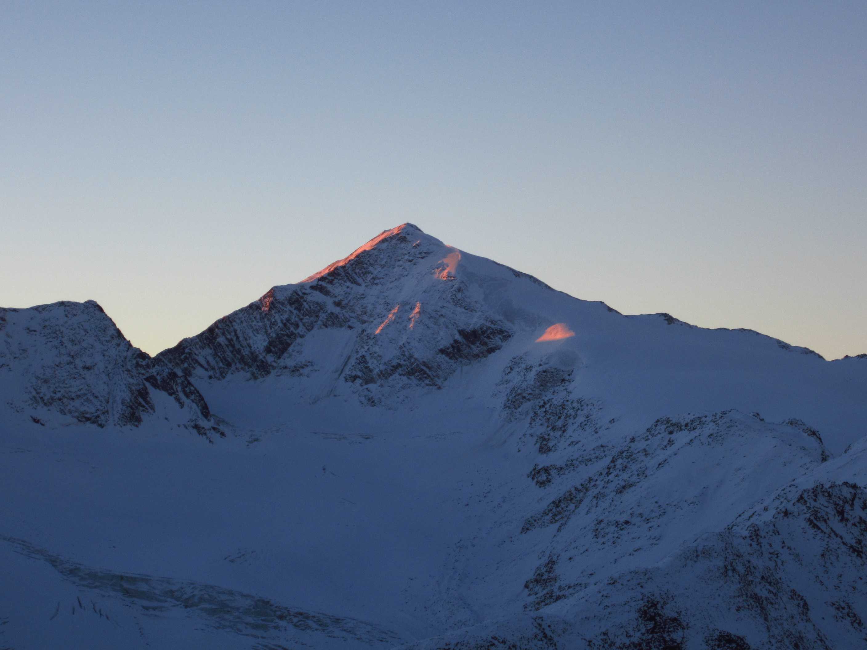 Übernachtung war im Winterraum, da die Hütte bereits geschlossen war um diese Jahreszeit, die Nacht unruhig, da einige Tschechen die Nacht zum Tag machten – egal – gegen 5:30 stieg ich los in Richtung Gipfel, zunächst mit Stirnlampe bis der Sonnenaufgang einsetzte. Die Bergwelt war fantastisch, ich war ganz allein. Die Sonne kam aus Richtung Obergurgel und beleuchtete zunächst den Similaun, später alles Weitere. Ich forderte mich, aber ich war nicht überfordert, so stand ich kurz vor neun am Gipfel. Im letzten Teilstück waren Schneeverwehungen zu überqueren, die mich zunächst etwas unsicher machten, aber sie waren kein Problem. Der Blick war überragend, nur Schleierwölkchen am Himmel, alles in eine leicht schneebedeckte Oberfläche getaucht und Sonne über Sonne. Ich war glücklich!