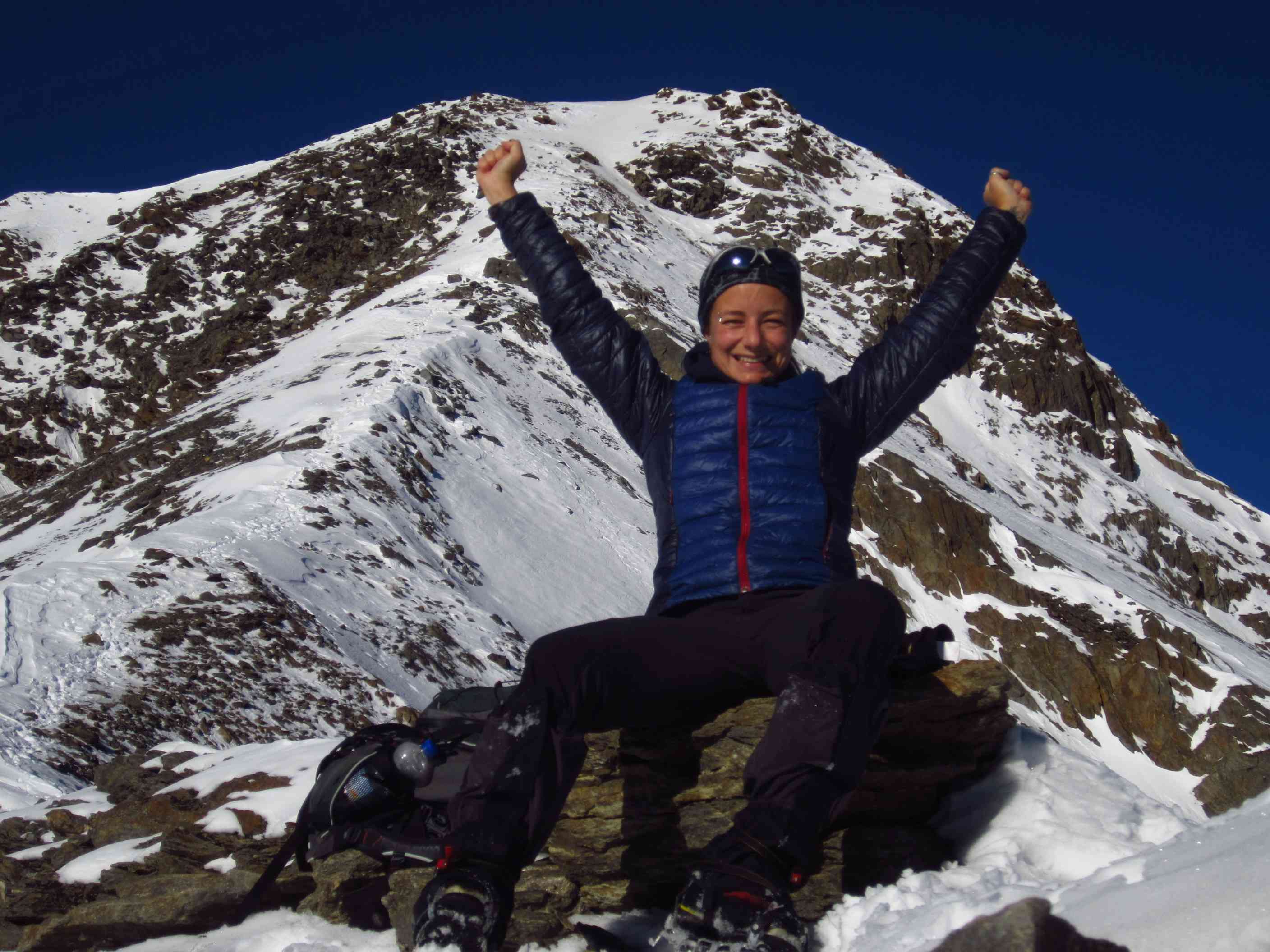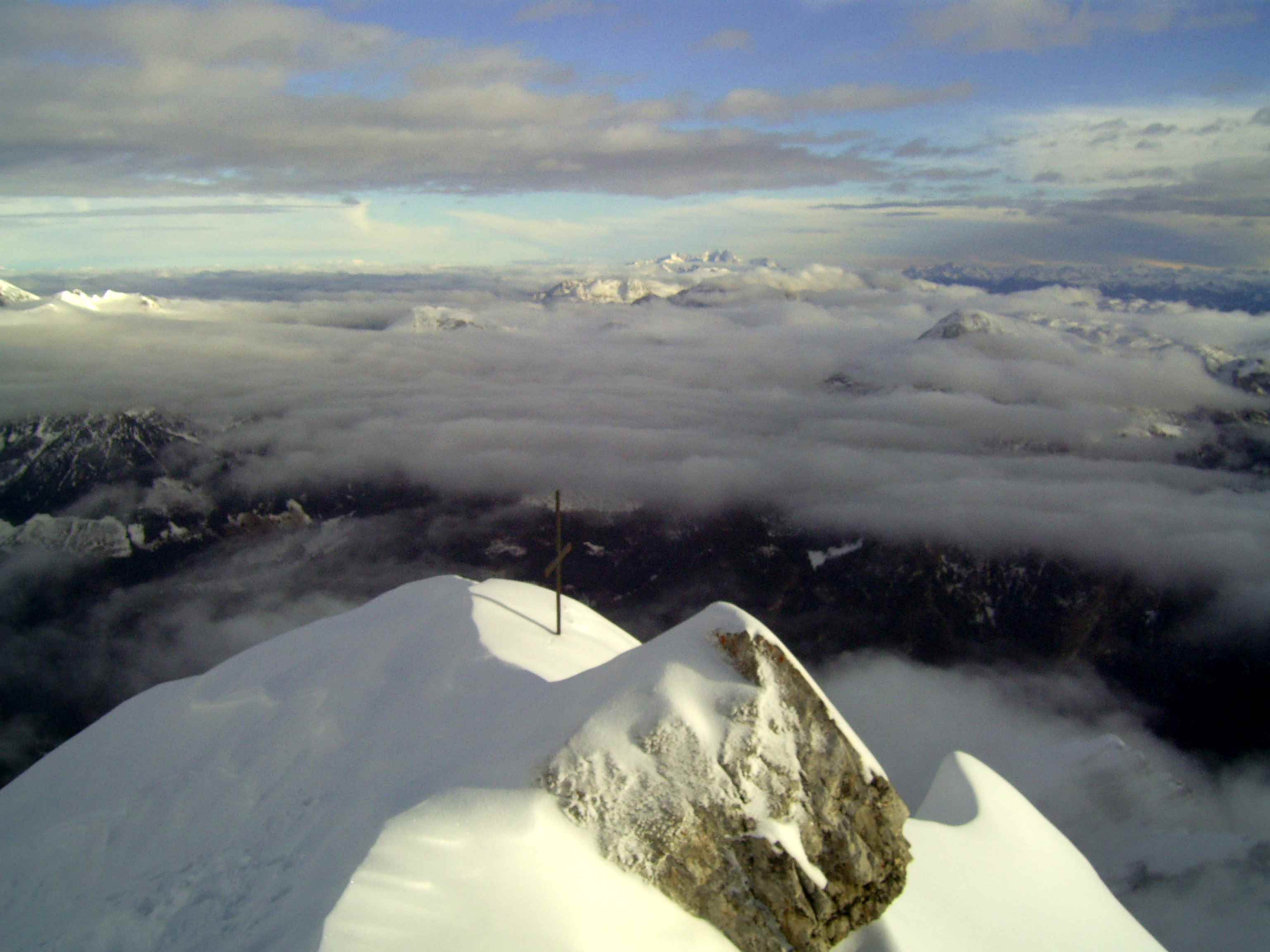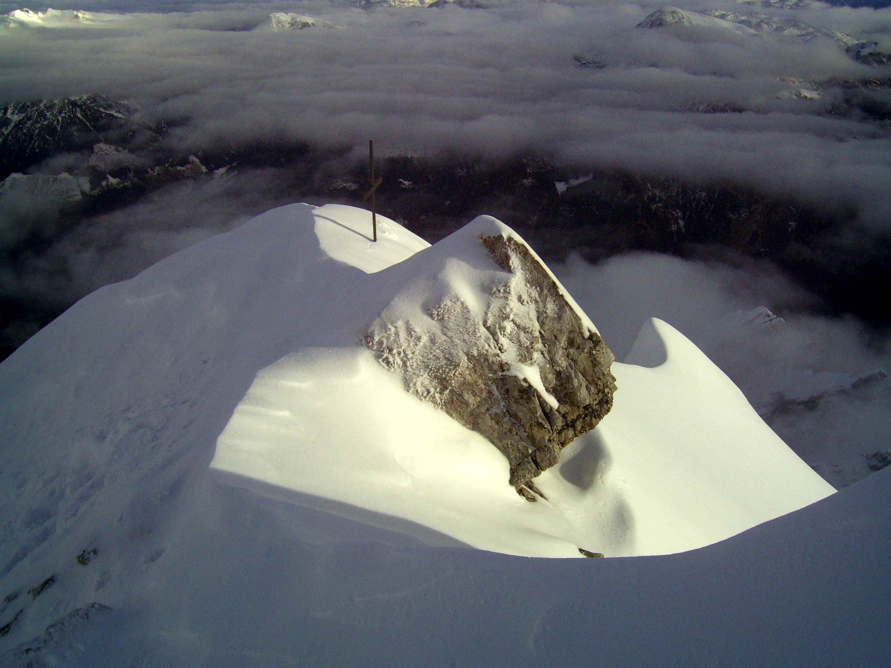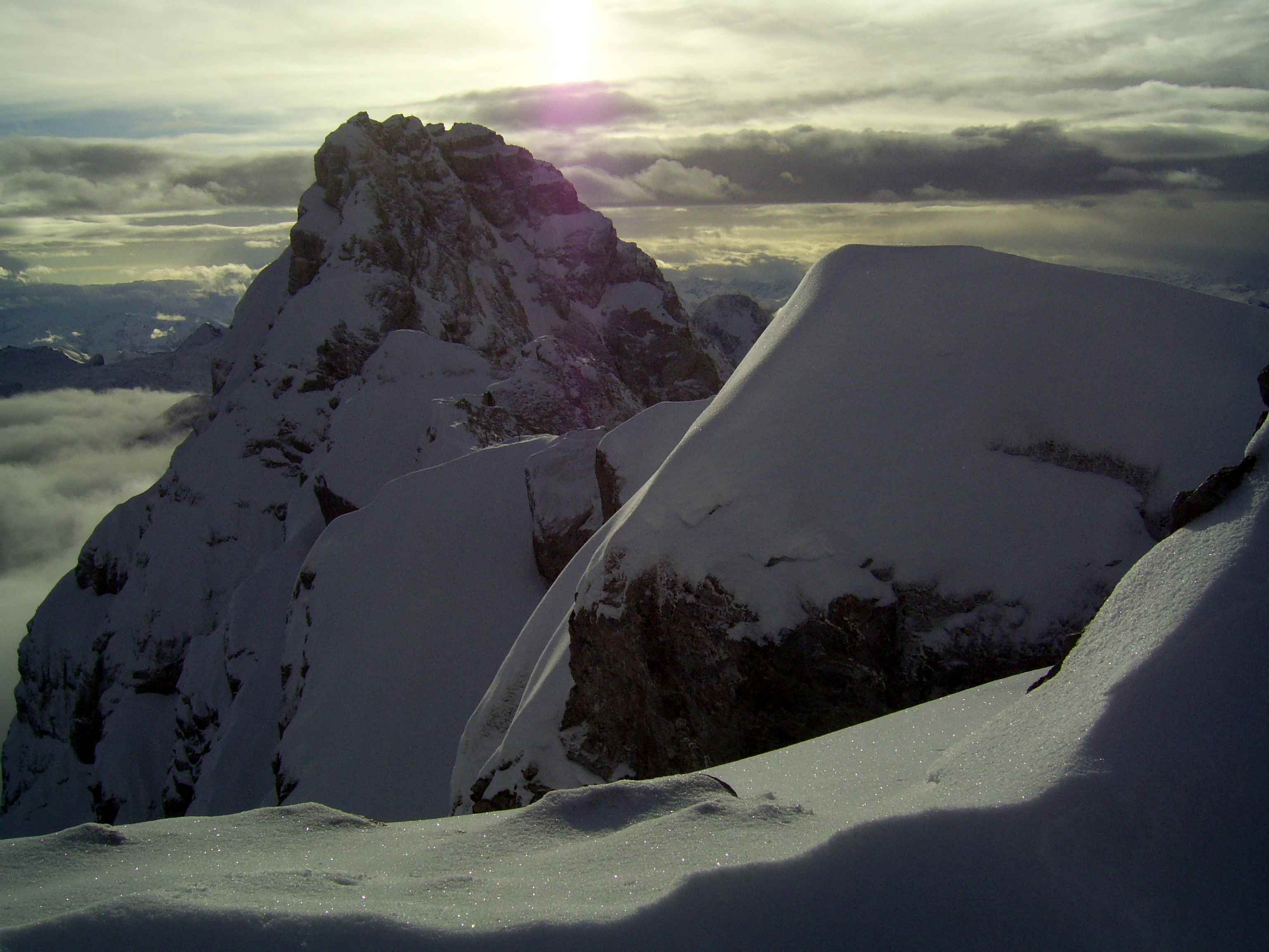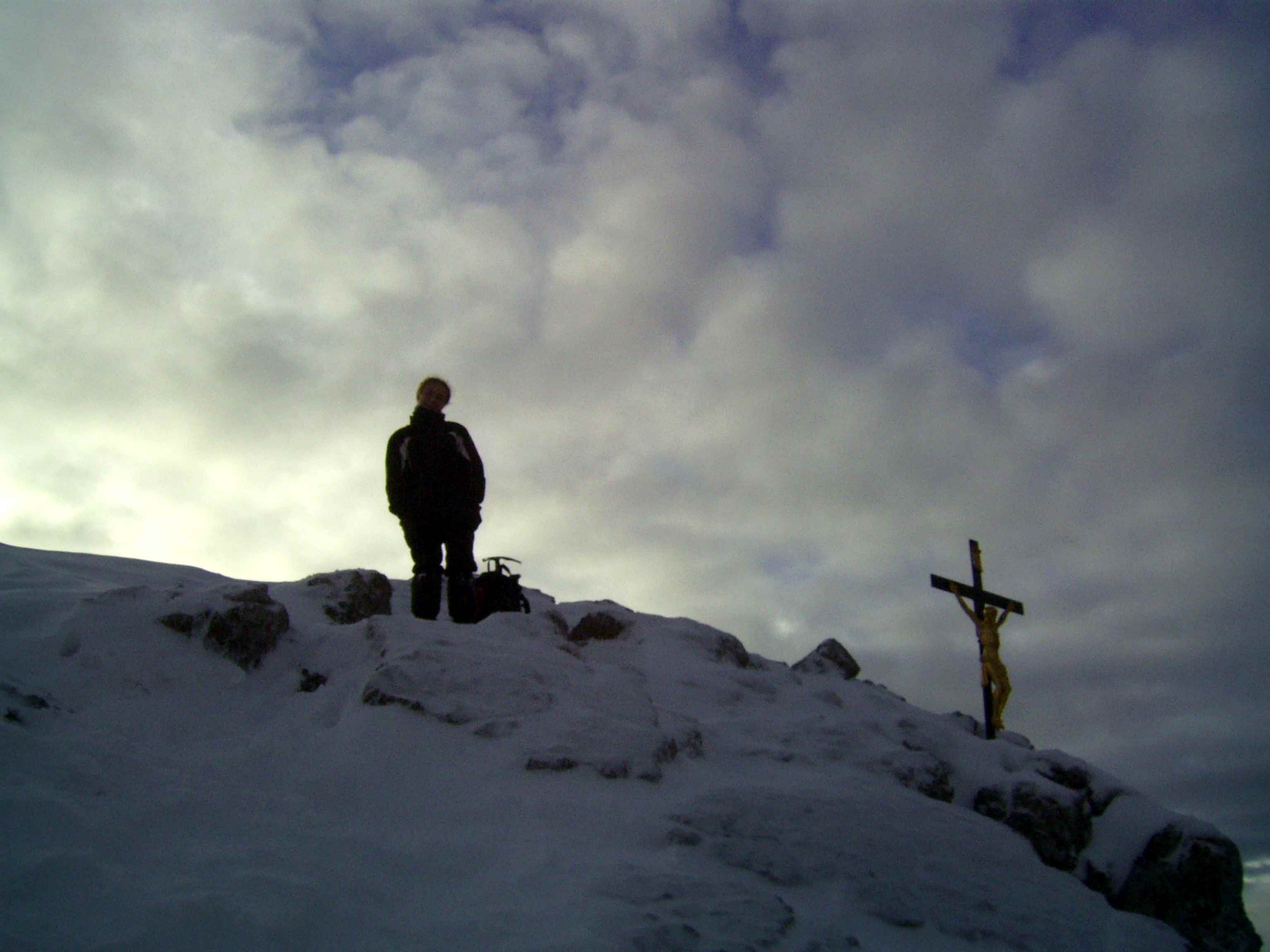 Übernachtung war im Winterraum, da die Hütte bereits geschlossen war um diese Jahreszeit, die Nacht unruhig, da einige Tschechen die Nacht zum Tag machten – egal – gegen 5:30 stieg ich los in Richtung Gipfel, zunächst mit Stirnlampe bis der Sonnenaufgang einsetzte. Die Bergwelt war fantastisch, ich war ganz allein. Die Sonne kam aus Richtung Obergurgel und beleuchtete zunächst den Similaun, später alles Weitere. Ich forderte mich, aber ich war nicht überfordert, so stand ich kurz vor neun am Gipfel. Im letzten Teilstück waren Schneeverwehungen zu überqueren, die mich zunächst etwas unsicher machten, aber sie waren kein Problem. Der Blick war überragend, nur Schleierwölkchen am Himmel, alles in eine leicht schneebedeckte Oberfläche getaucht und Sonne über Sonne. Ich war glücklich!