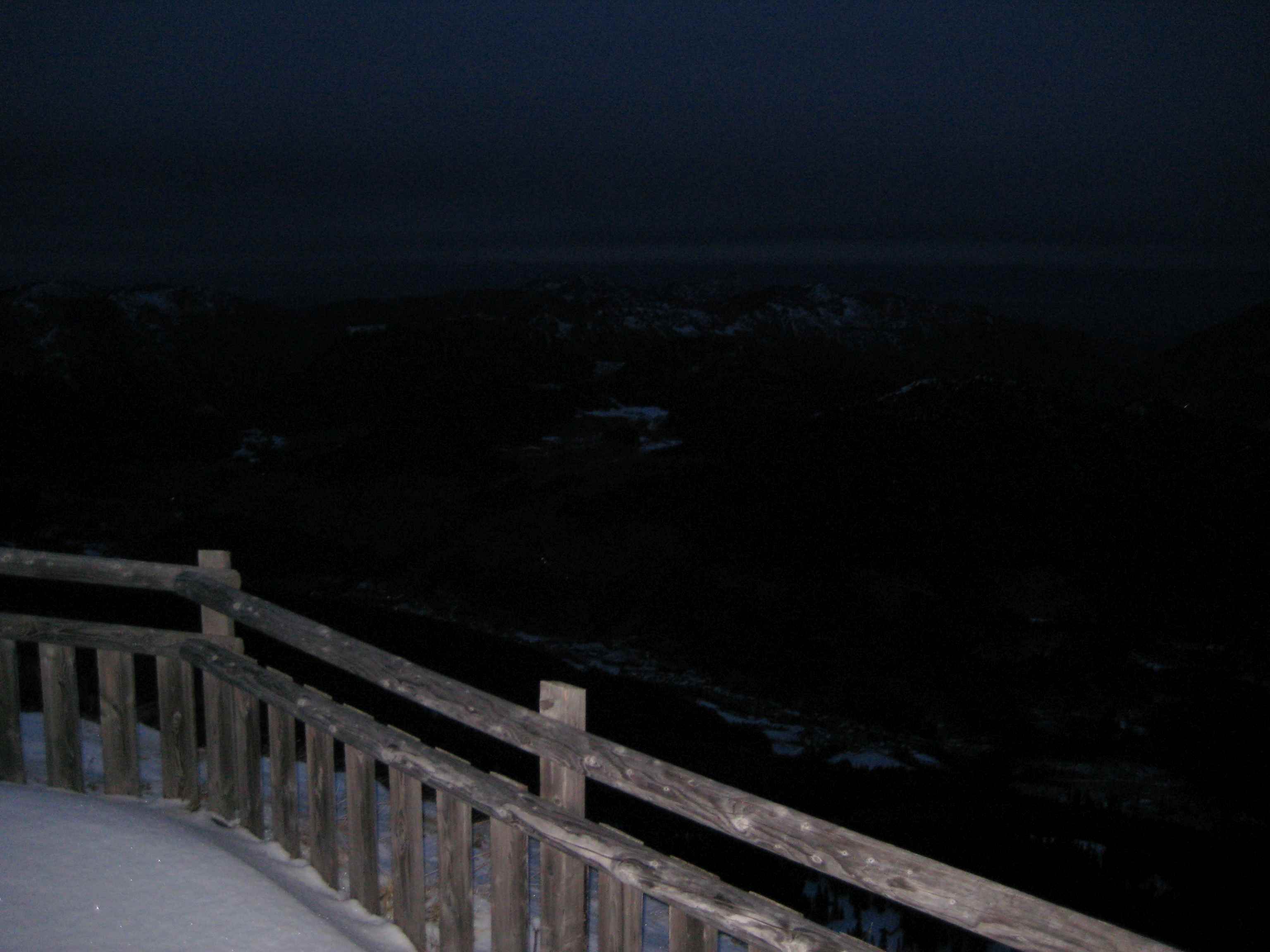 Auf dem Turm stand ein Mann, und als wir ankamen (die ersten 7km waren geschafft) wußten wir nicht recht, was dessen Aufgabe war. Wir warteten mit dem Zeltaufbau, aber er beachtete uns kaum und fuhr bei Sonnenuntergang davon. Unser Zelt stand direkt am Aussichtspunkt, es war kein Wind und so befestigten wir es lediglich mit Steinen und am Geländer. Wir aßen noch ein Brot und tranken einen kleinen Becher von unserem Wein im Teelichtschein und Softshell- bzw. Fleecejacke, bevor wir uns in die Schlafsäcke hüllten. Sehr kalt war es nicht, auch wenn dann über Nacht doch noch Wind aufkam. Ein bißchen unruhig waren wir noch. Es fuhr ein Auto her und wendete, dann ein Zweites, bei dem Flo aus dem Zelt kroch, aber der Fahrer fragte nur, ob wir einen großen Hund gesehen hätten – sie suchten einen. Nein, ein Hund war hier nicht vorbeigekommen, nur in der Ferne hörte man Gekläffe aus allen Ecken, was ein bißchen nervig war.