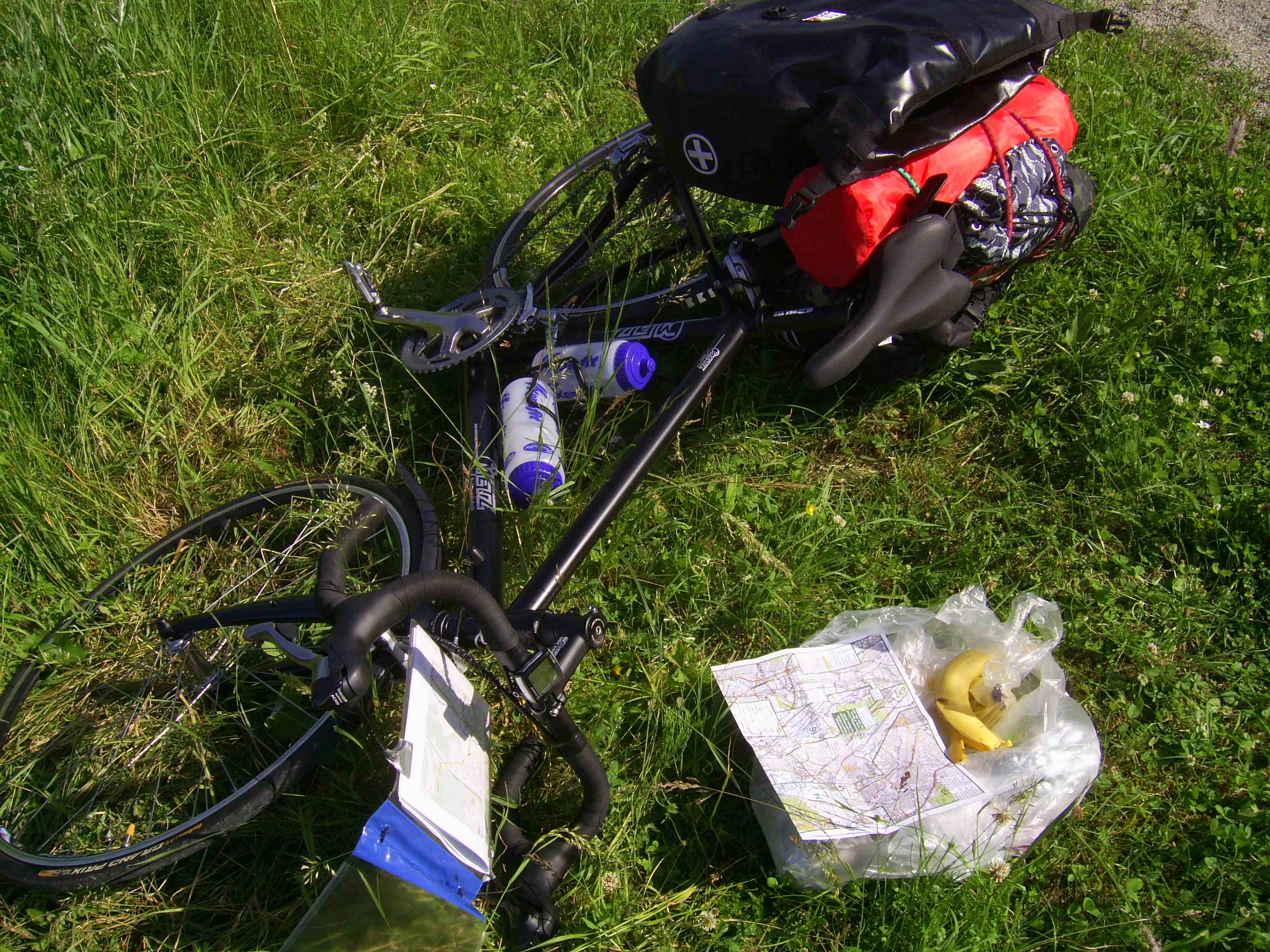 Die Idee, eine mehrtägige Radtour mit Zelt zu machen, war schon lange entstanden, und uns hiermit am Donauradweg zu probieren war relativ schnell entschieden. Zeitlimit aufgrund meines erst kürzlichen Jobwechsels war begrenzt auf eine Woche, und so fixierten wir uns auf die erste Etappe – 630km von Donaueschingen, der Quelle der Donau, bis Passau. Nachdem ich in diesem Jahr schon mehrere 100km Touren gemacht hatte und auch Flo nach gemeinsamen 40 oder 70km gar nicht gemerkt hat, Sport gemacht zu haben, begannen die Zweifel. 630km in 7 Tagen – das wären nicht mal 100km am Tag, und schließlich hat man den ganzen Tag zur Verfügung. Also schauten wir, wie der Weg weitergehen würde und kauften uns den 2. Band des Radführers – noch 300km bis nach Wien. Plan war es dann sehr bald, das Zugticket nach Donaueschingen zu lösen und die Heimfahrt offen zu halten. Zunächst redeten wir hinter vorgehaltener Hand davon, es bis nach Wien zu probieren, aber bereits vor Antritt der Reise stand unser Plan, wenn alles einigermaßen laufen würde (Unwetter, Pannen, Verletzungen etc. sich in Grenzen halten würden) „wir fahren in 7 Tagen von Donaueschingen bis Wien mit Zelt von Campingplatz zu Campingplatz“. Mein Chef wünschte mir zum Abschied eine gute Reise und daß ich am kommenden Samstag auf dem Prater ankommen sollte. Flo hatte sich extra an sein Rennrad einen Gepäckträger montiert und die hinteren Ritzel tauschen lassen, ich habe mein Rad reisefertig gemacht. Im Gepäck hatten wir außer den Campingutensilien Zelt, Schlafsack, Isomatte noch Kocher und Geschirr, löslichen Kaffee und Zitronentee, ein paar Müsliriegel, Traubenzucker und Brotzeit, ein paar aber nicht viele Wechselklamotten, Rei in der Tube, eine Regenjacke und zuletzt ein paar Ersatzteile und Flickzeug. Die Knieprobleme, die ich mir 2 Wochen vor der Tour zugezogen hatte, mußten kurzfristig mit Cortison behandelt werden, und wie sich herausstellte hat radeln eine heilende Wirkung – nach der Woche waren die Knieprobleme restlos verschwunden!